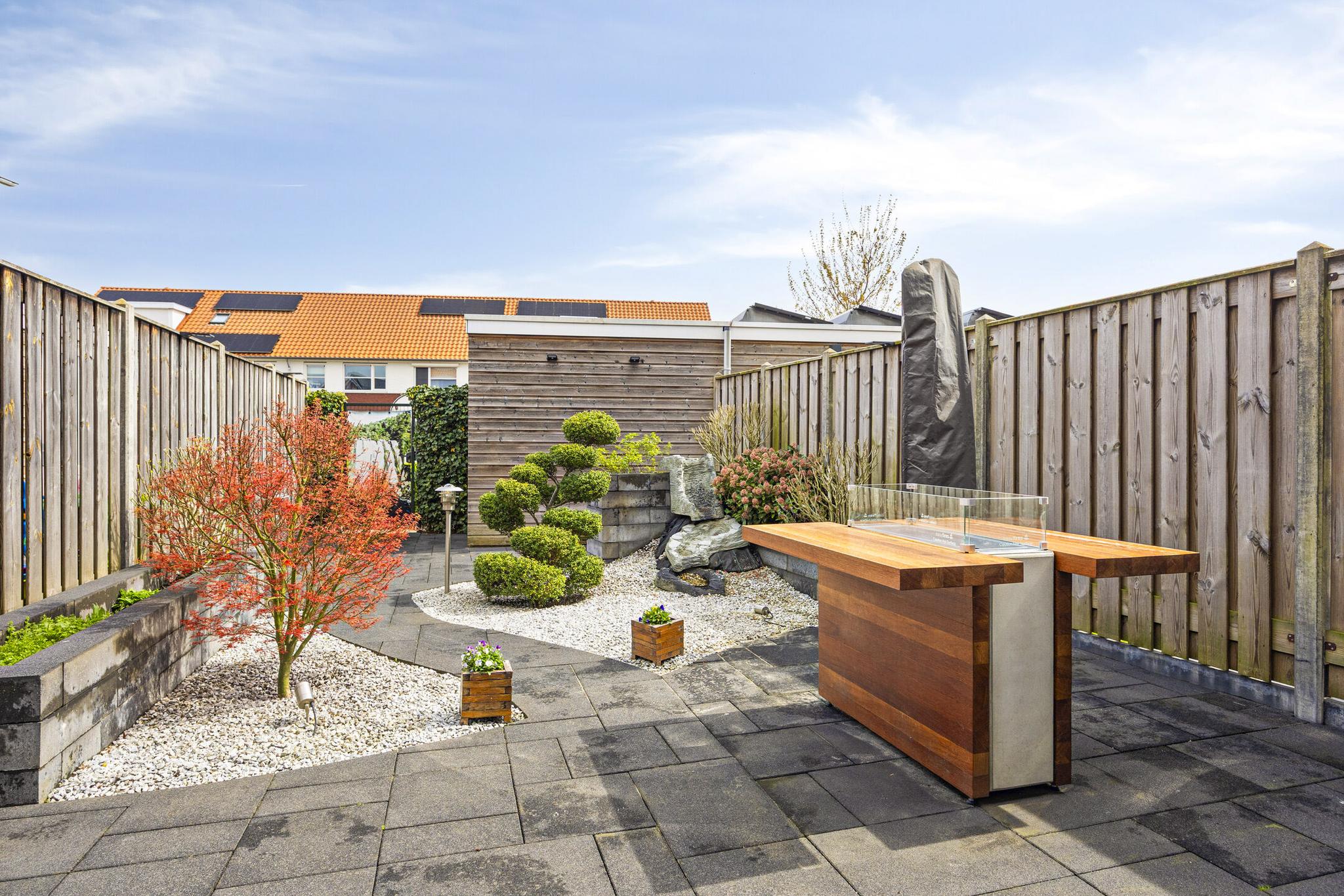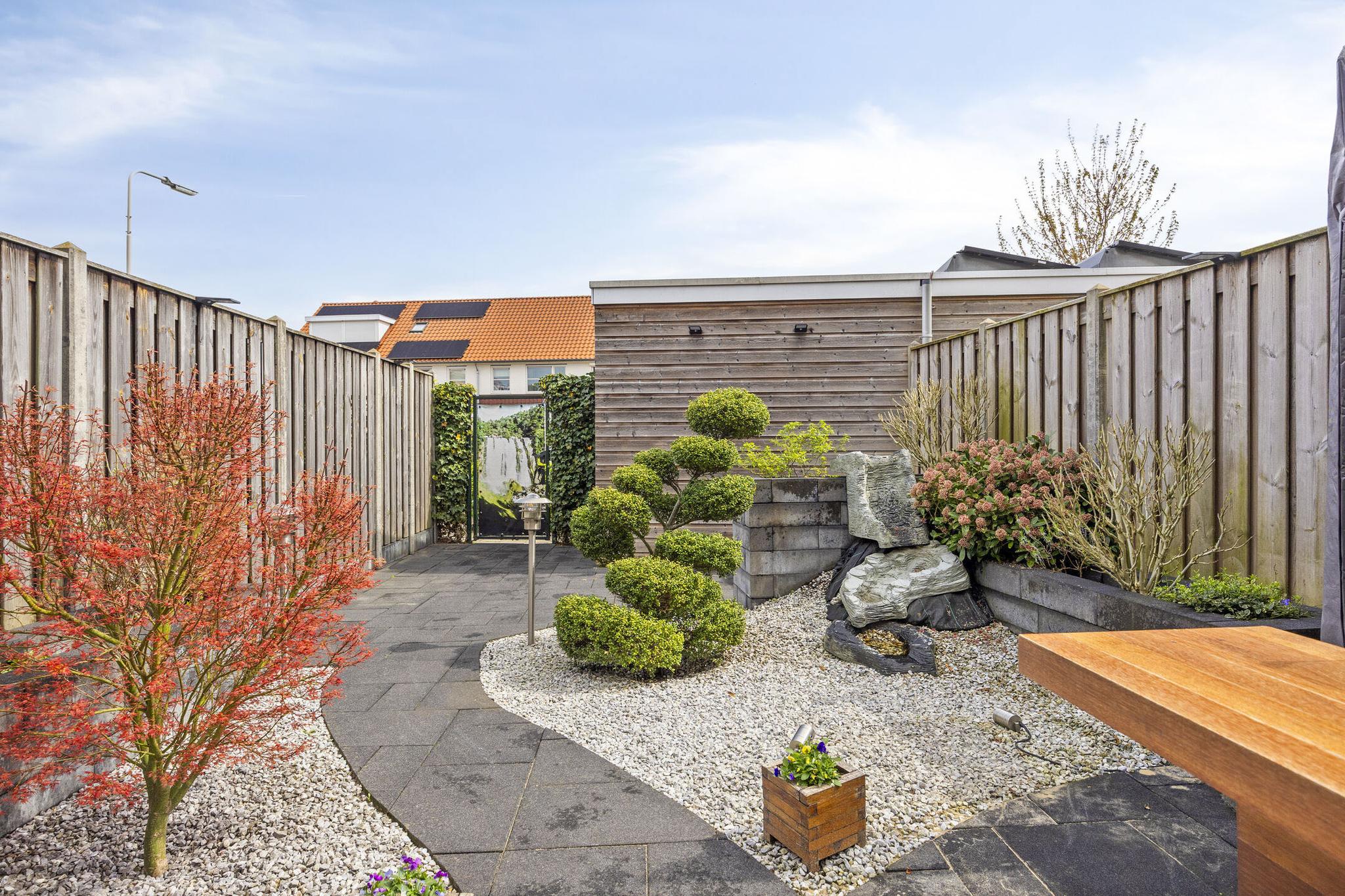 De zeer verzorgd aangelegde tuin is gelegen op het Oosten en heeft een nette schutting, een vrijstaand houten schuur en een achterom.