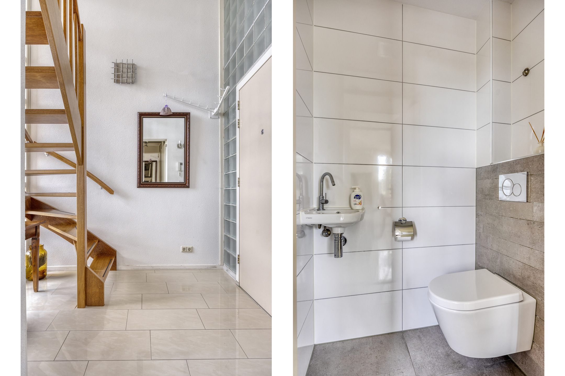 Via een keurig onderhouden centrale hal bereikt men de woning. De ruime entreehal biedt toegang tot het toilet met fontein, een praktische provisiekast en het zonnige terras, dat veel privacy biedt.