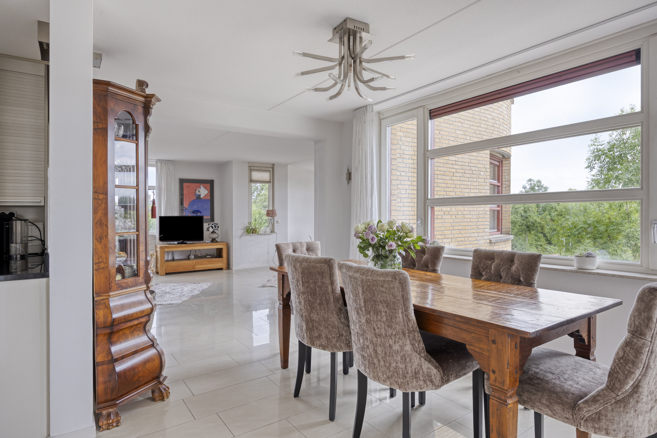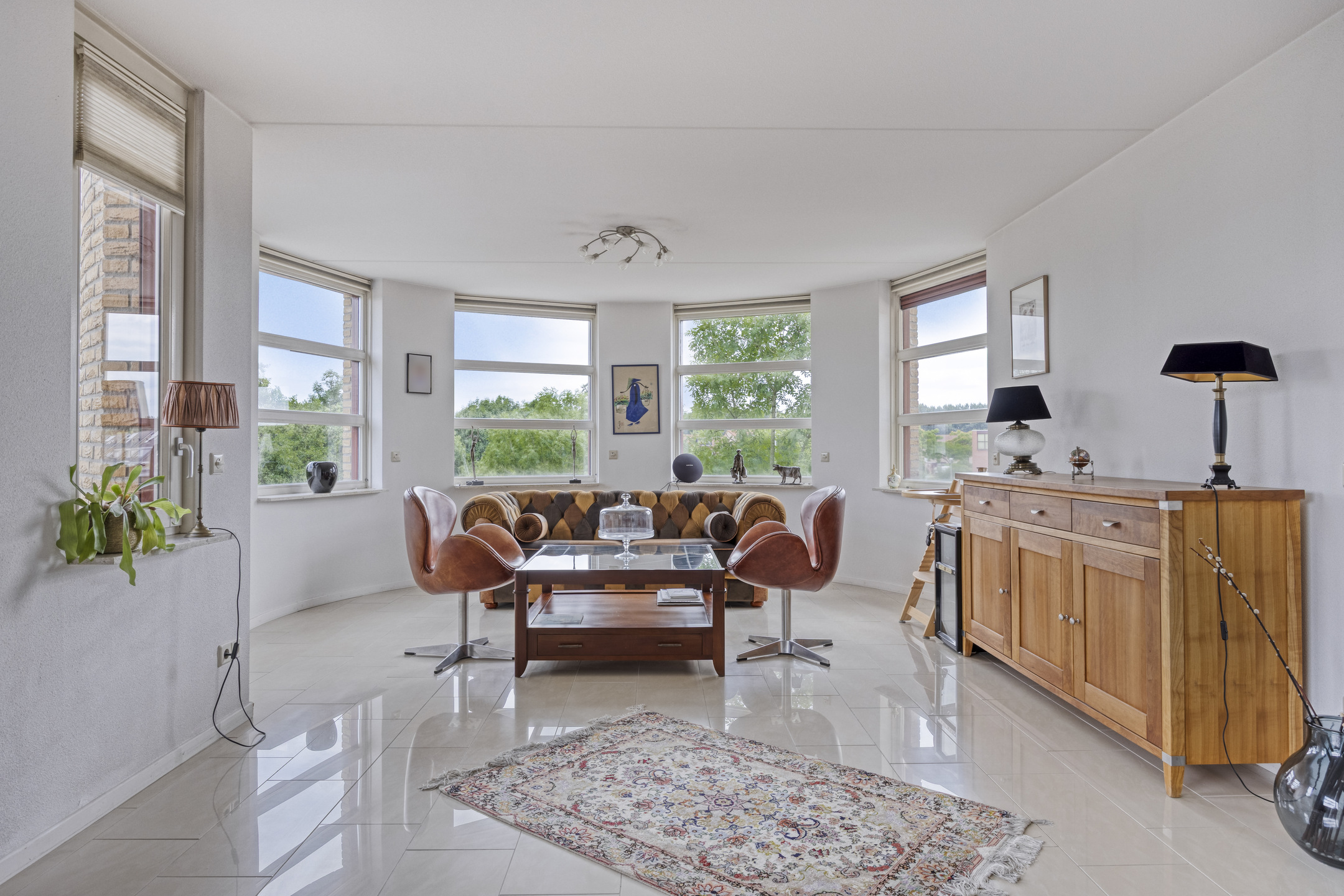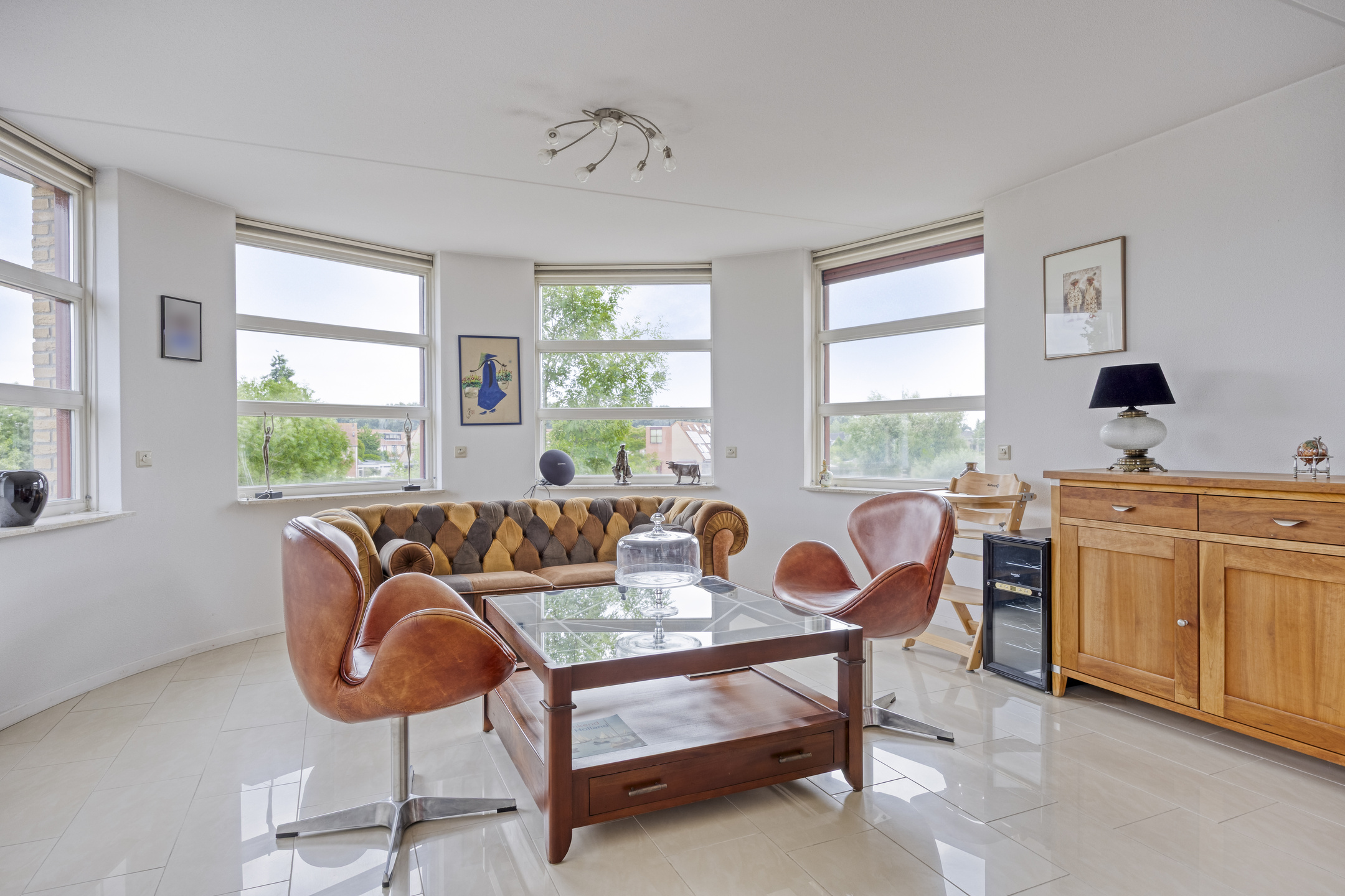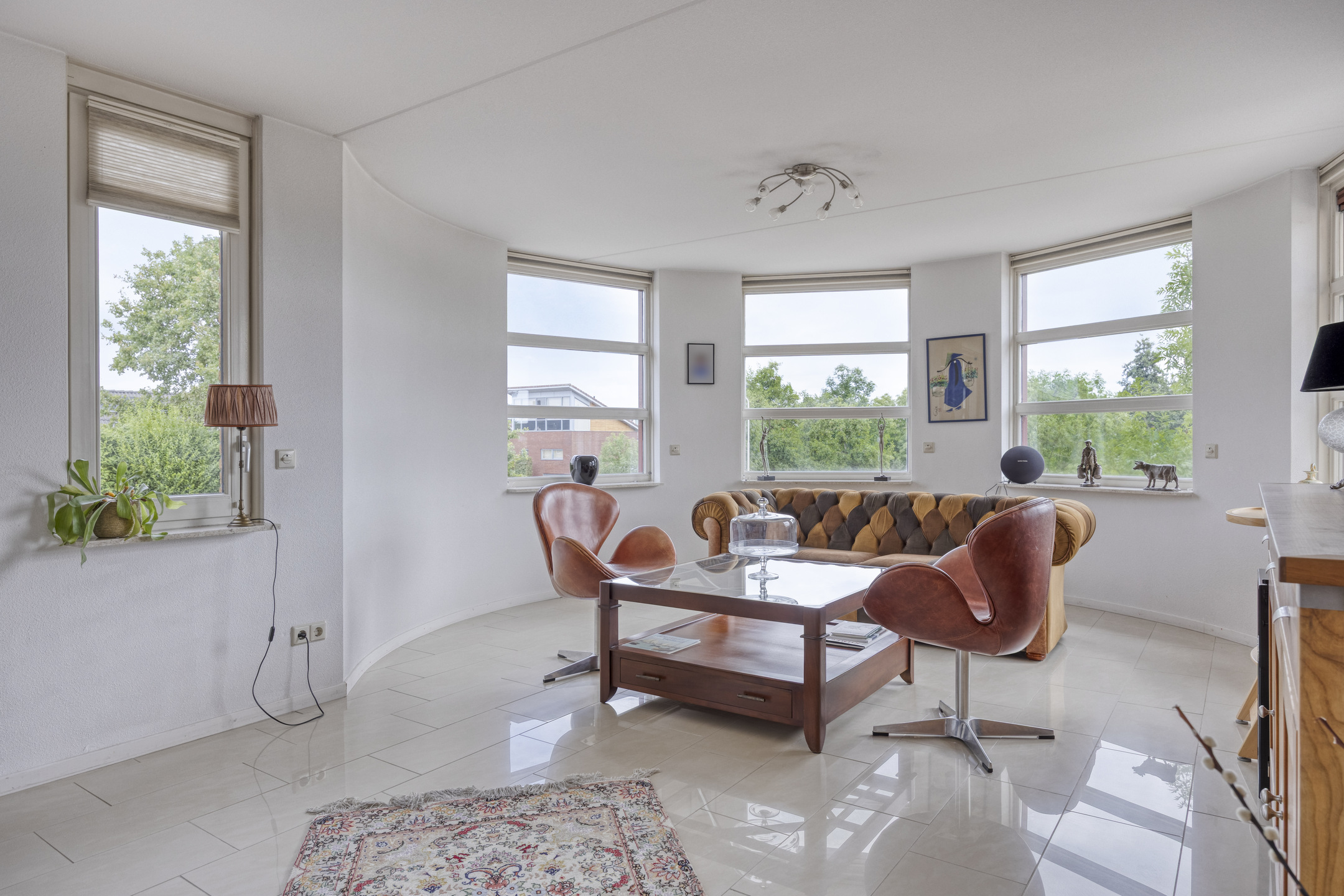 De lichte woonkamer is royaal van opzet en beschikt over een fraaie tegelvloer met vloerverwarming. Door de ligging in de ronde toren ontstaat een speelse indeling met een halfronde erker en rondom geplaatste raampartijen voorzien van screens, wat zorgt voor een prachtig uitzicht en een aangename lichtinval.