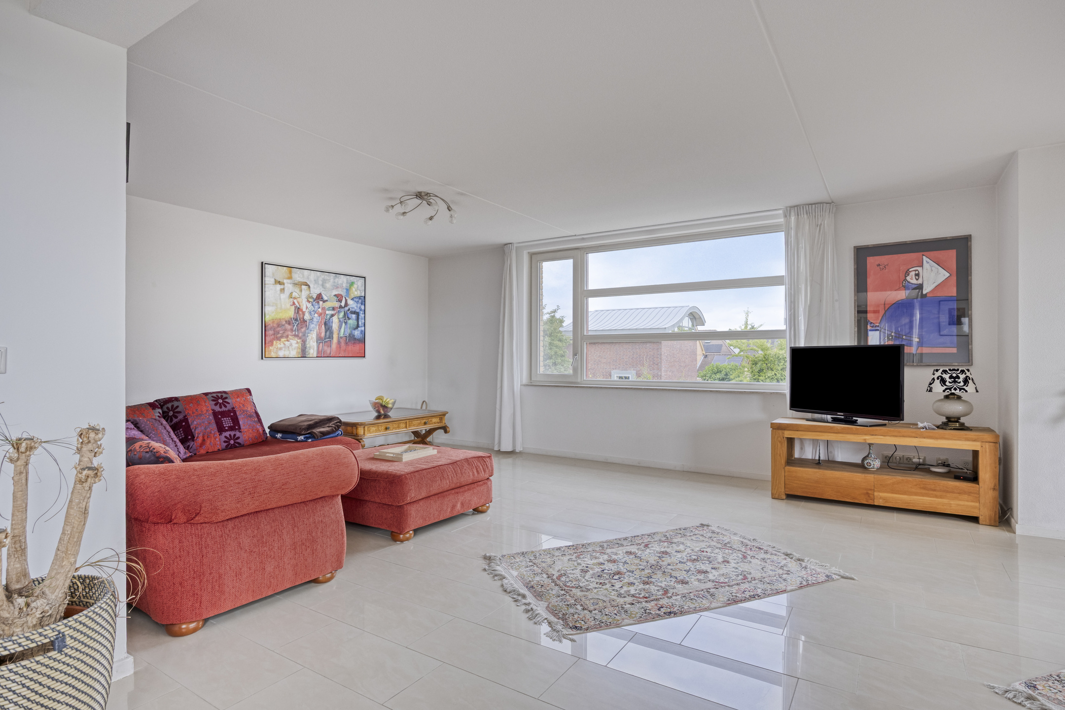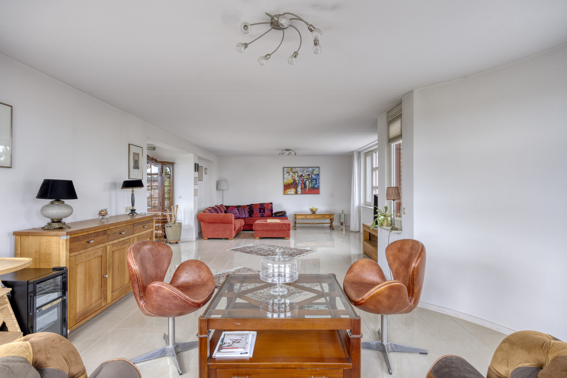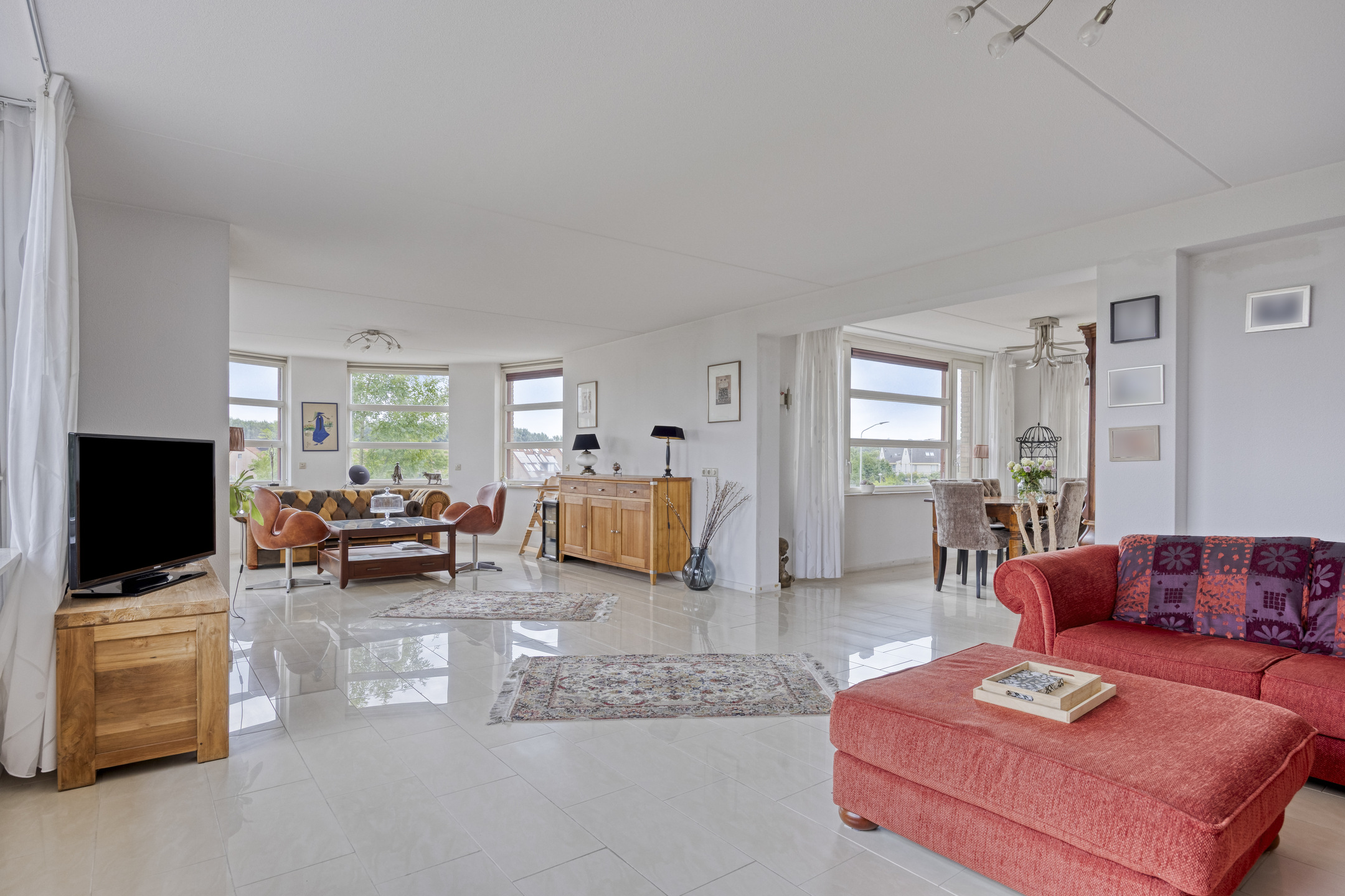De lichte woonkamer is royaal van opzet en beschikt over een fraaie tegelvloer met vloerverwarming. Door de ligging in de ronde toren ontstaat een speelse indeling met een halfronde erker en rondom geplaatste raampartijen voorzien van screens, wat zorgt voor een prachtig uitzicht en een aangename lichtinval.