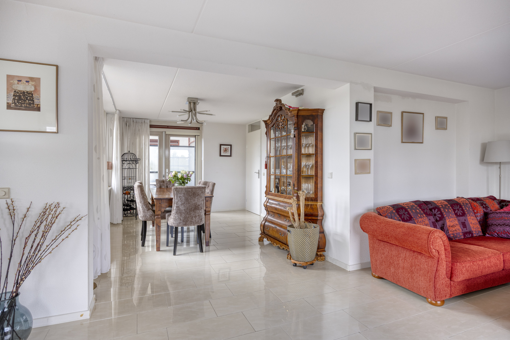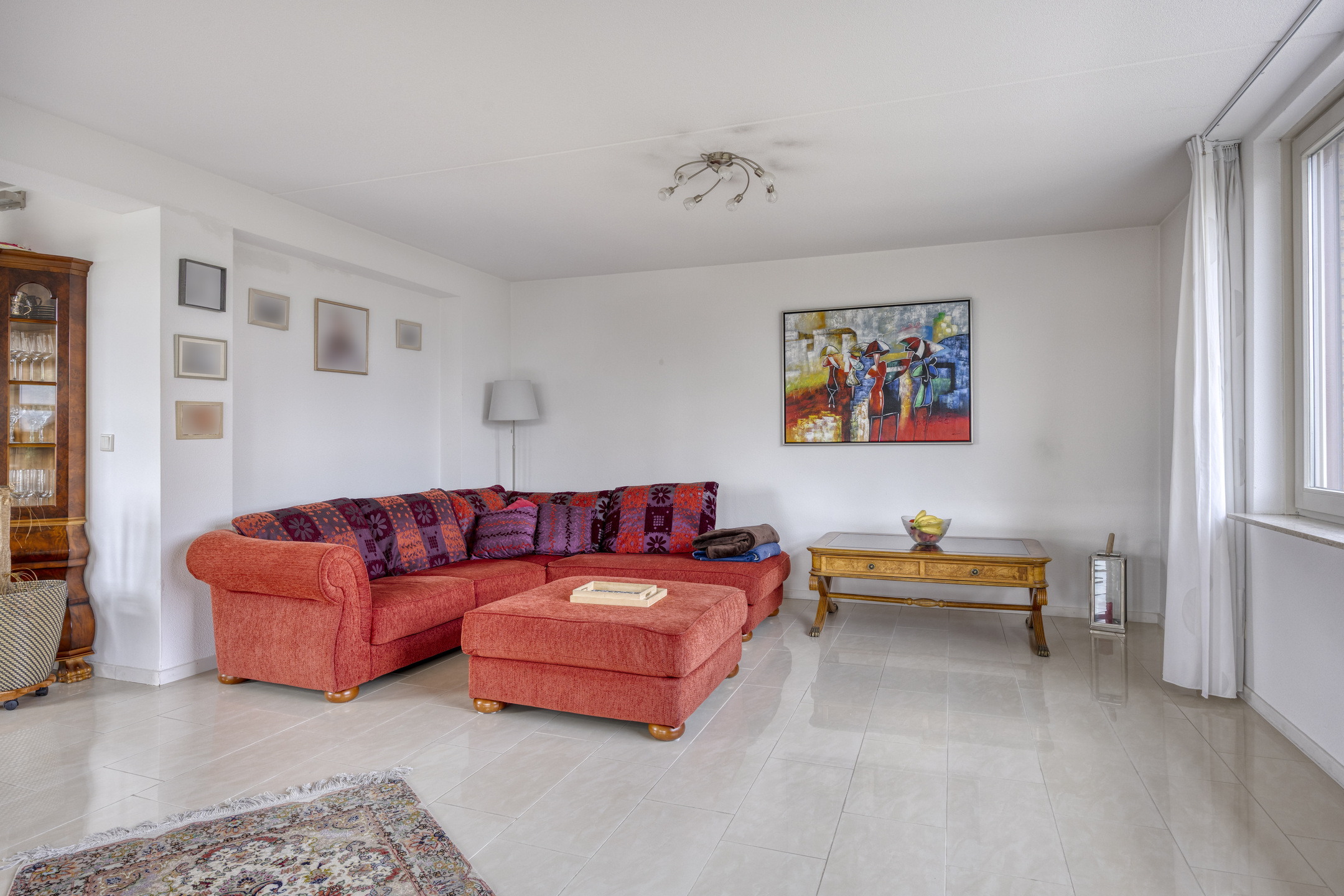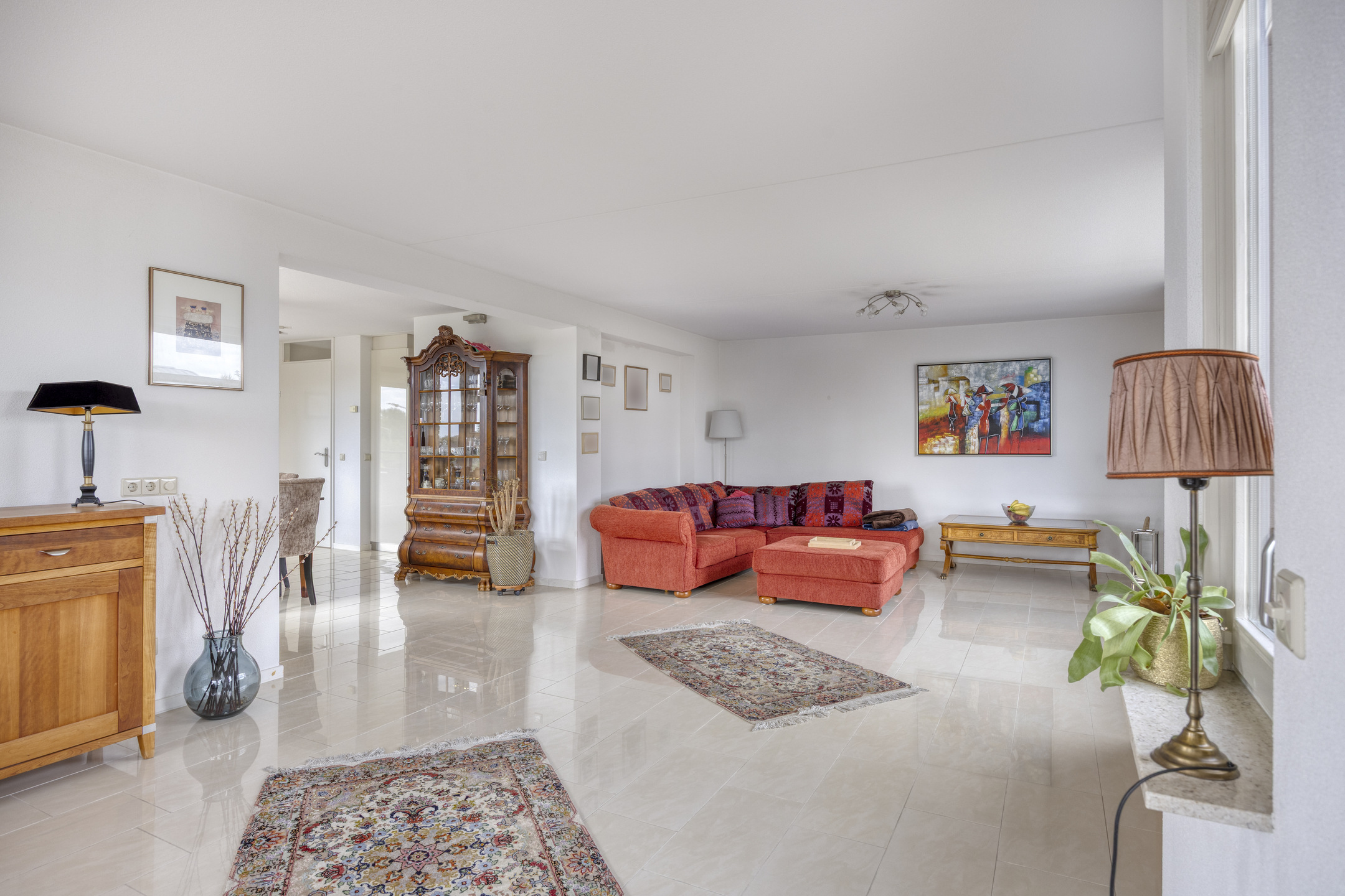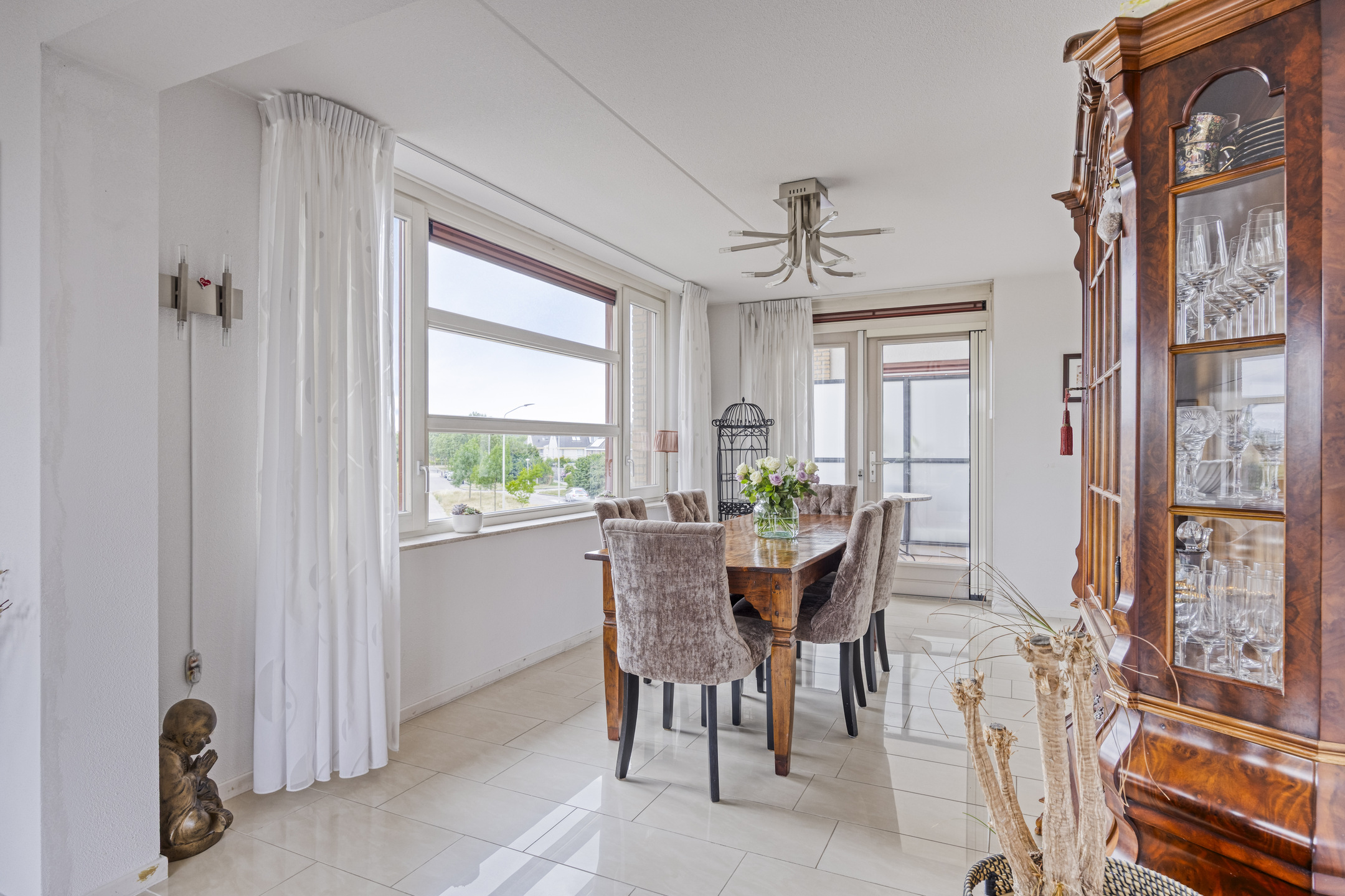 De lichte woonkamer is royaal van opzet en beschikt over een fraaie tegelvloer met vloerverwarming. Door de ligging in de ronde toren ontstaat een speelse indeling met een halfronde erker en rondom geplaatste raampartijen voorzien van screens, wat zorgt voor een prachtig uitzicht en een aangename lichtinval.