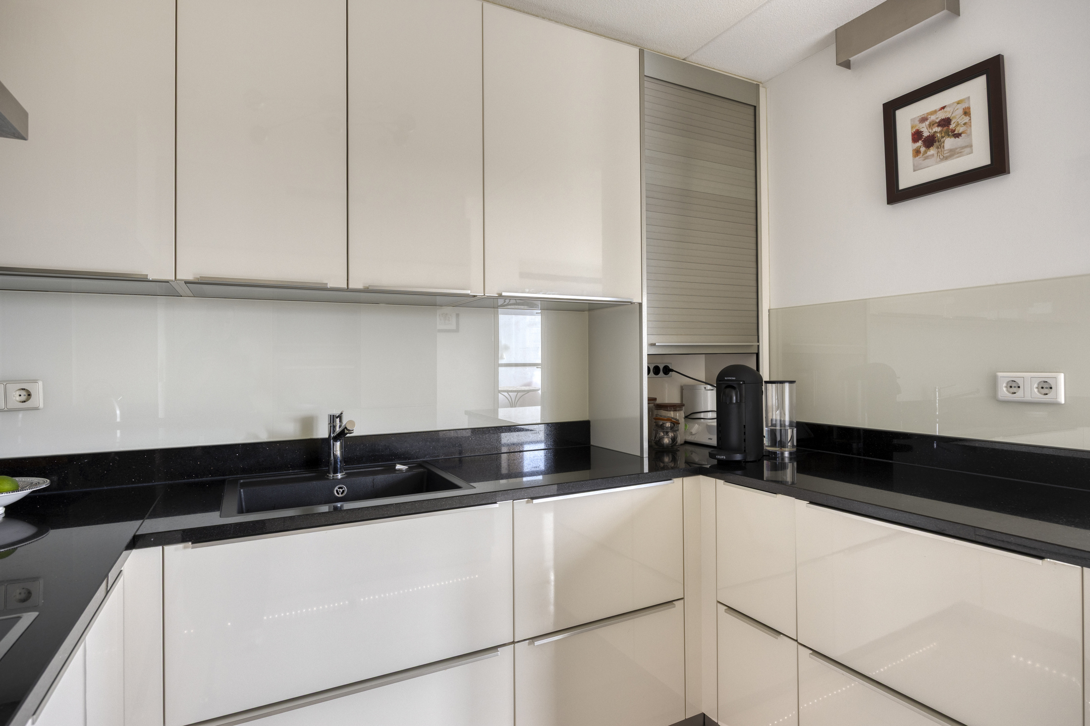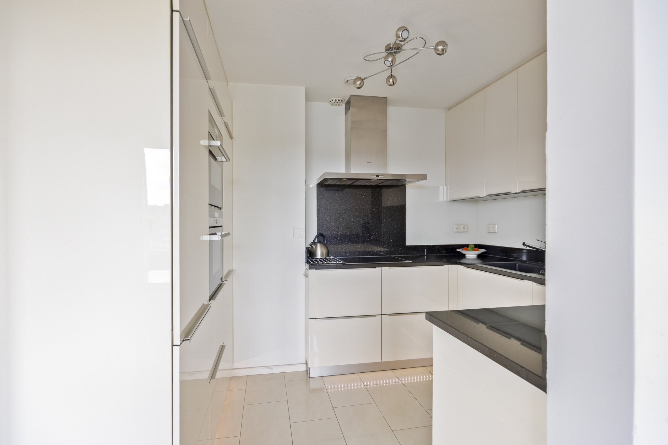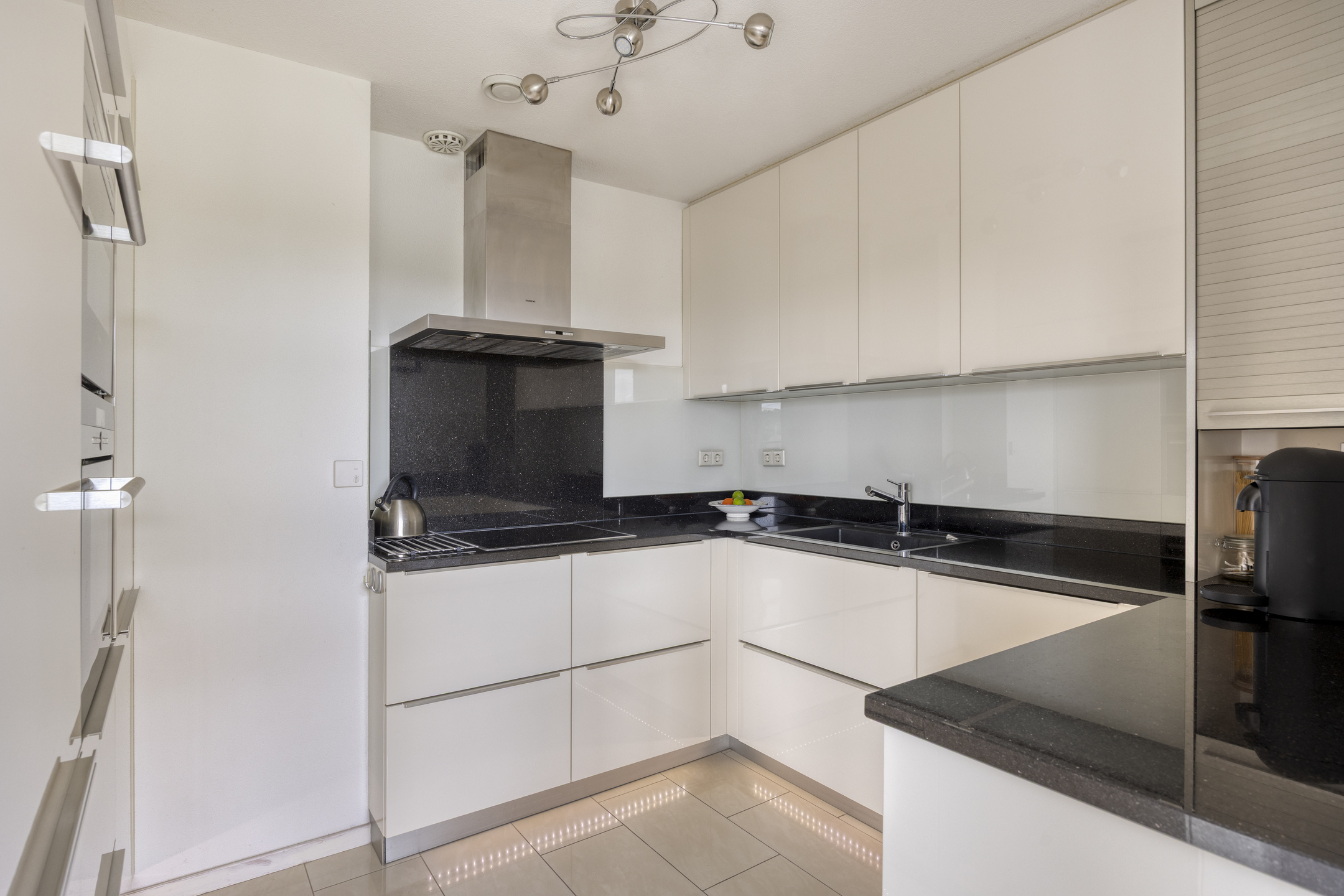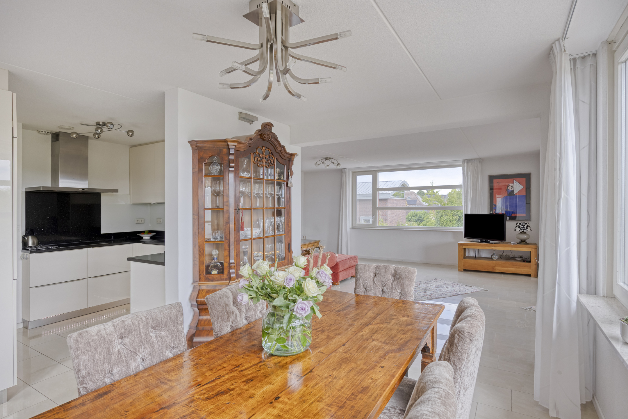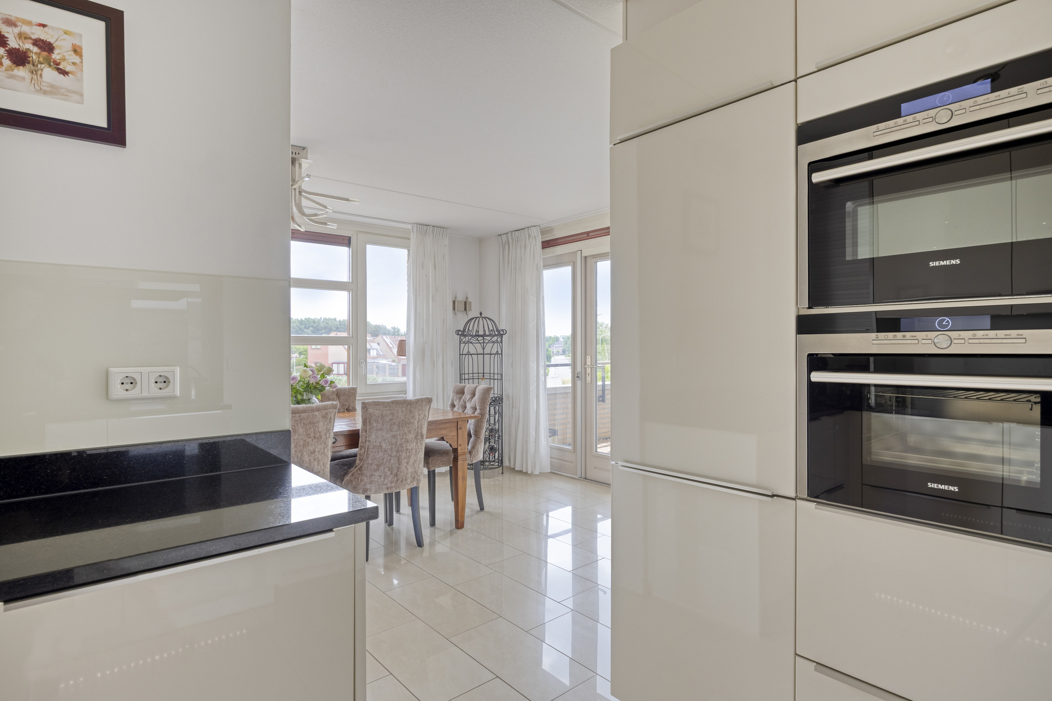 De open keuken (2019) is uitgevoerd in een moderne, vierkante opstelling en voorzien van hoogwaardige inbouwapparatuur, waaronder een stoomoven, combi-oven/magnetron, inductiekookplaat, vaatwasser, koelkast en vriezer. Aansluitend bevindt zich de eetkamer, ideaal voor het ontvangen van gasten.