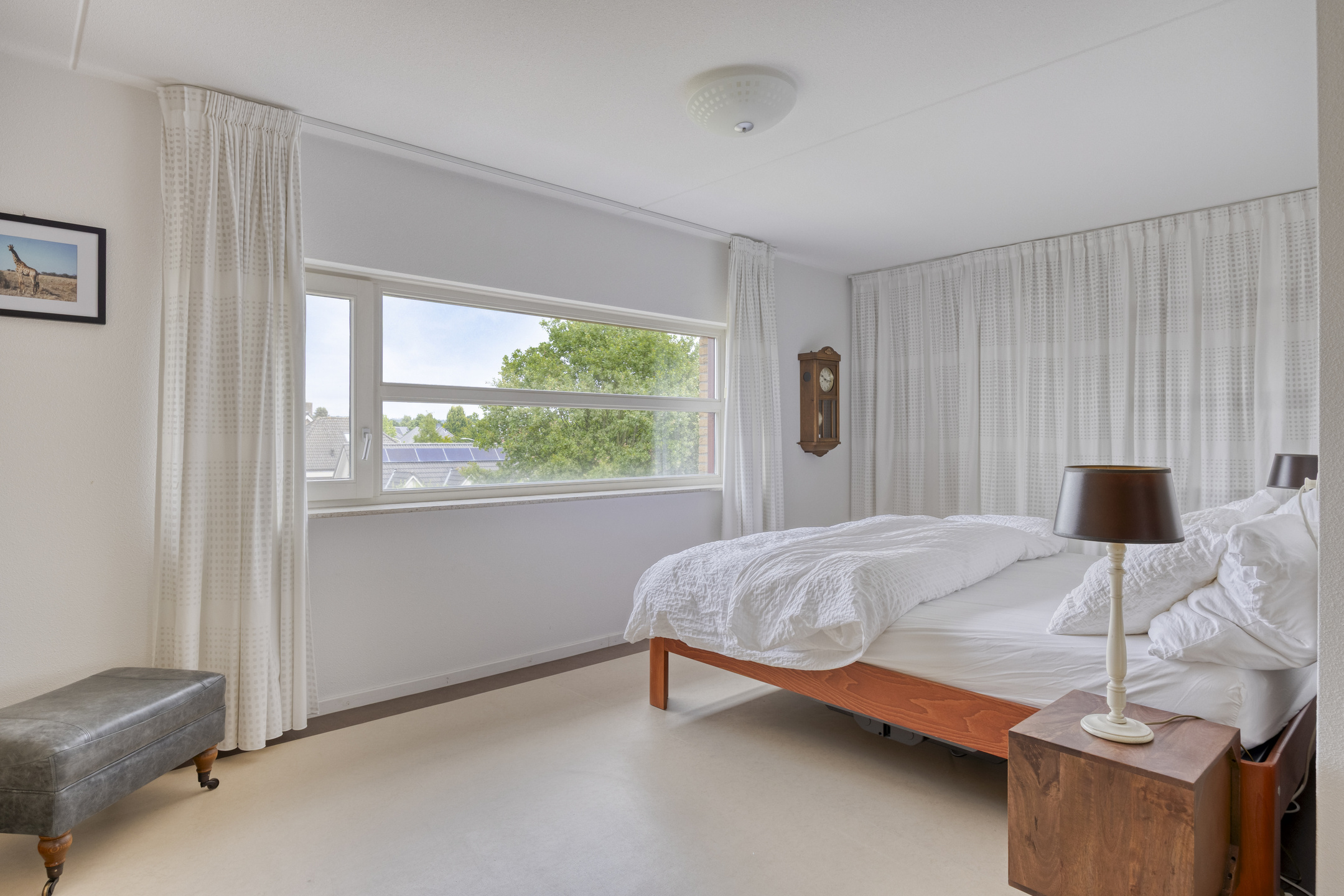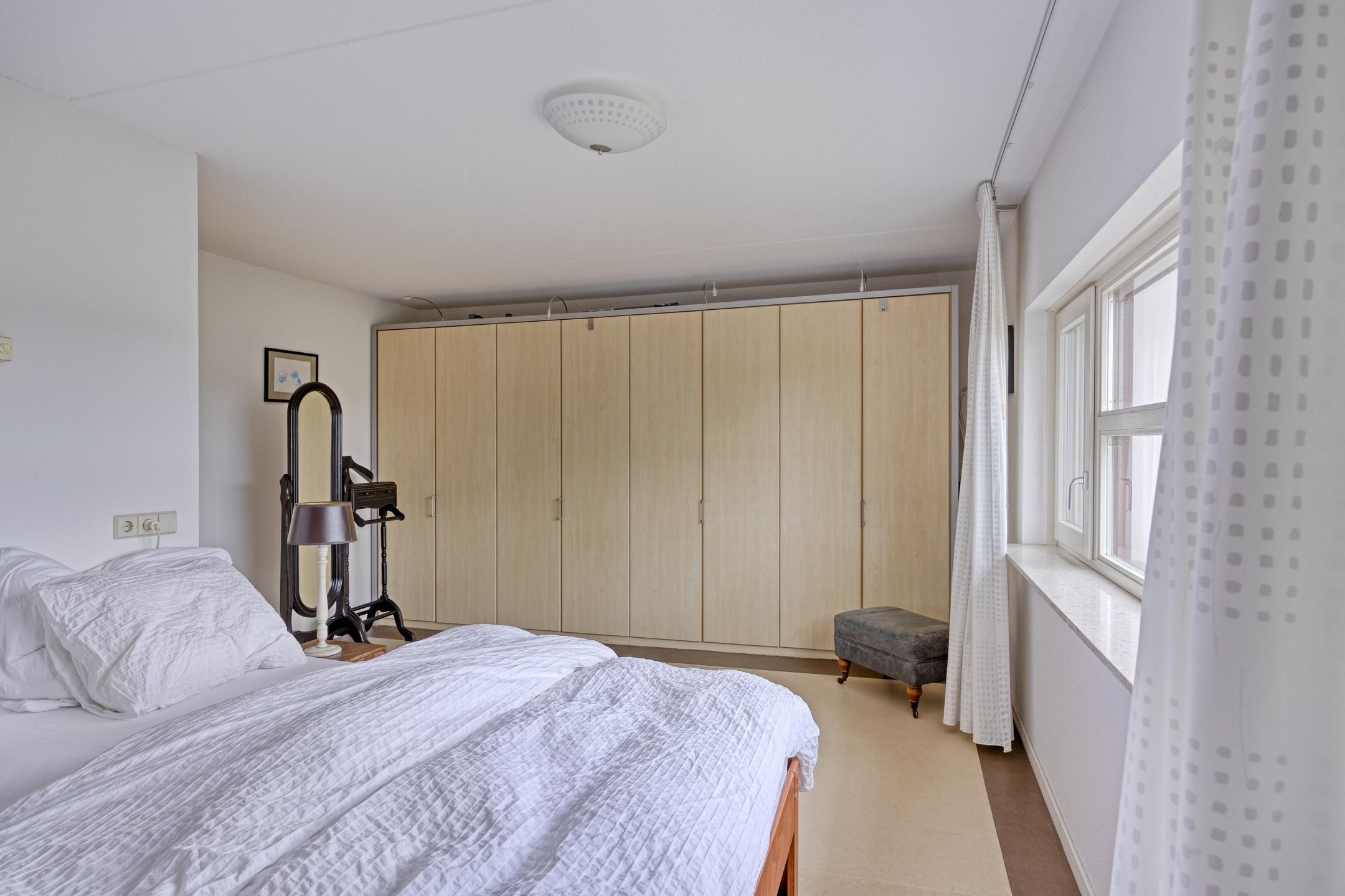 De royale hoofdslaapkamer meet ca. 21 m² en beschikt over een vaste kastenwand en een lichte linoleumvloer. De naastgelegen badkamer (vernieuwd in 2019) is voorzien van een inloopdouche, tweede toilet en een wastafelmeubel met veel opbergruimte.