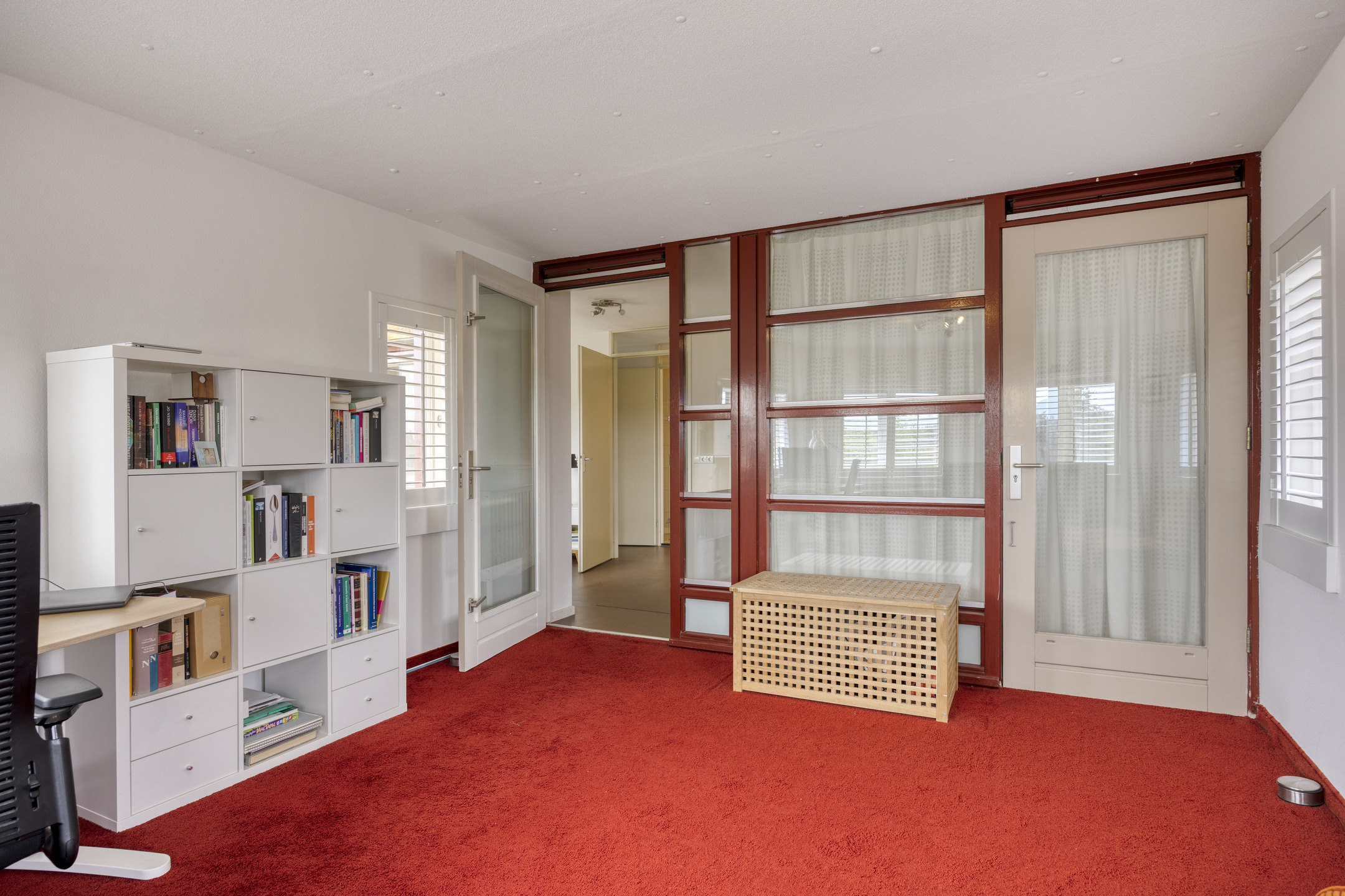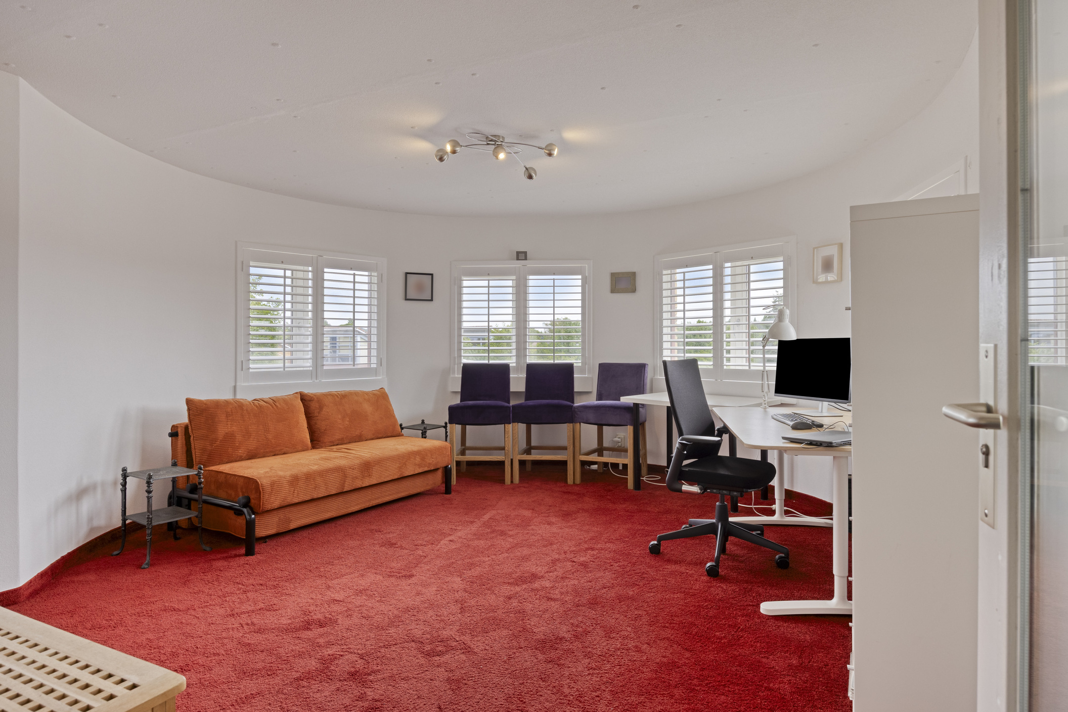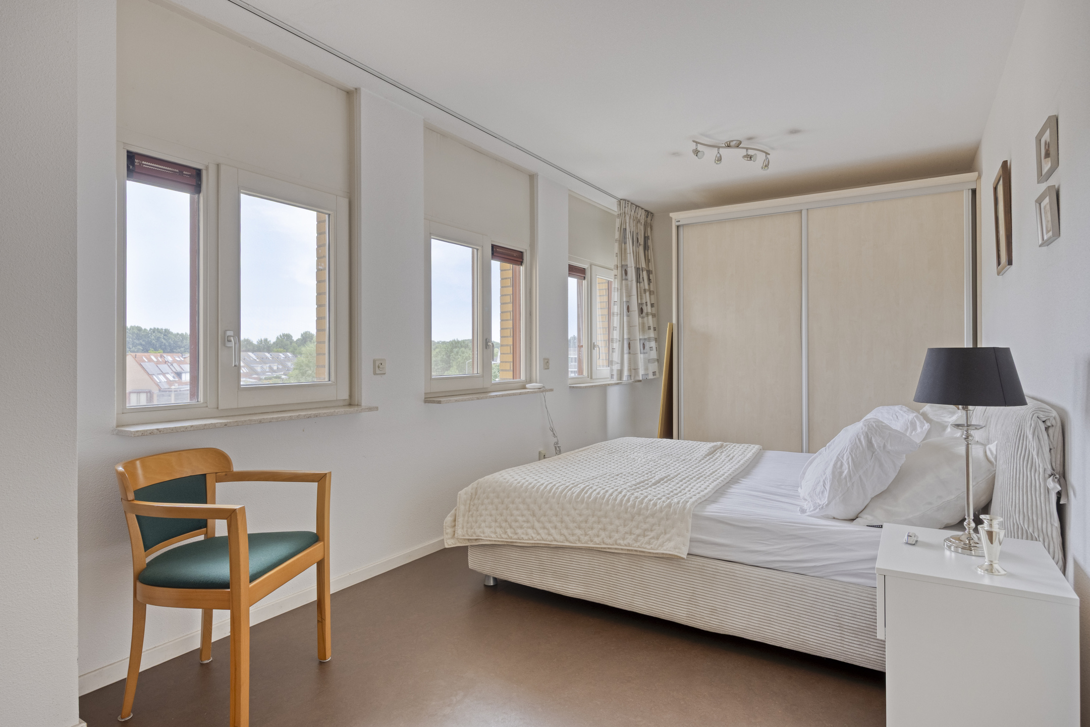 De tweede slaapkamer (ca. 16 m²) is eveneens ruim bemeten. De aangrenzende, voormalige loggia is omgebouwd tot een sfeervolle hobby-/werkkamer. Door de ronde vorm van deze ruimte komt de karakteristieke architectuur van het gebouw op unieke wijze terug in het interieur. Dankzij de ligging en raampartijen rondom biedt deze kamer een weids uitzicht en een prettige werk- of ontspanningsplek.