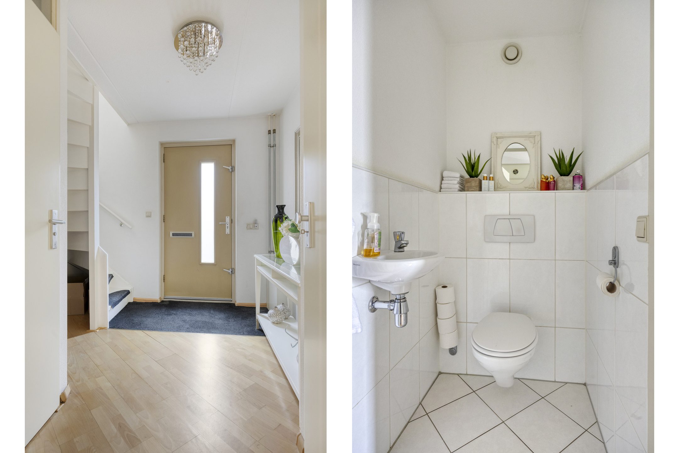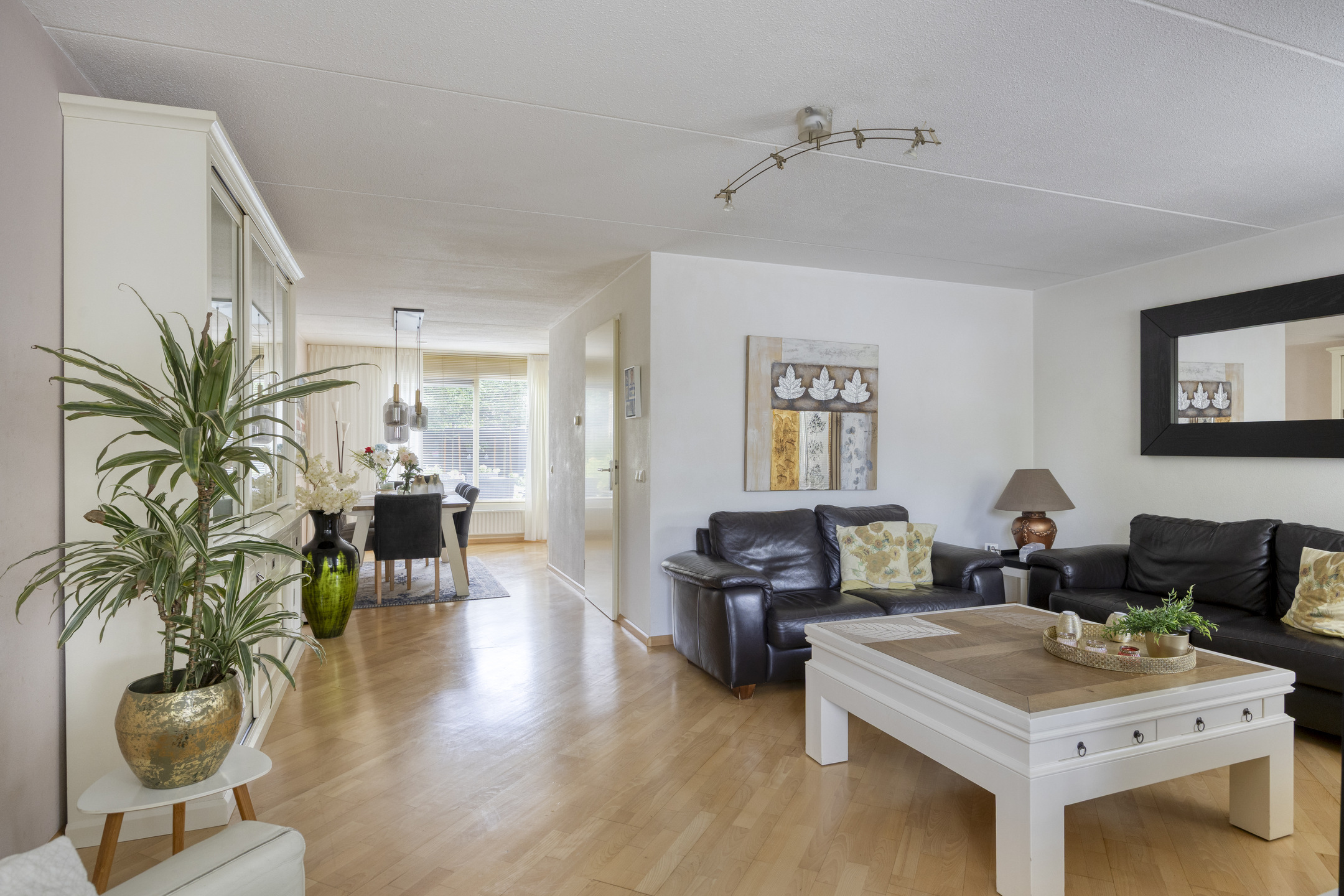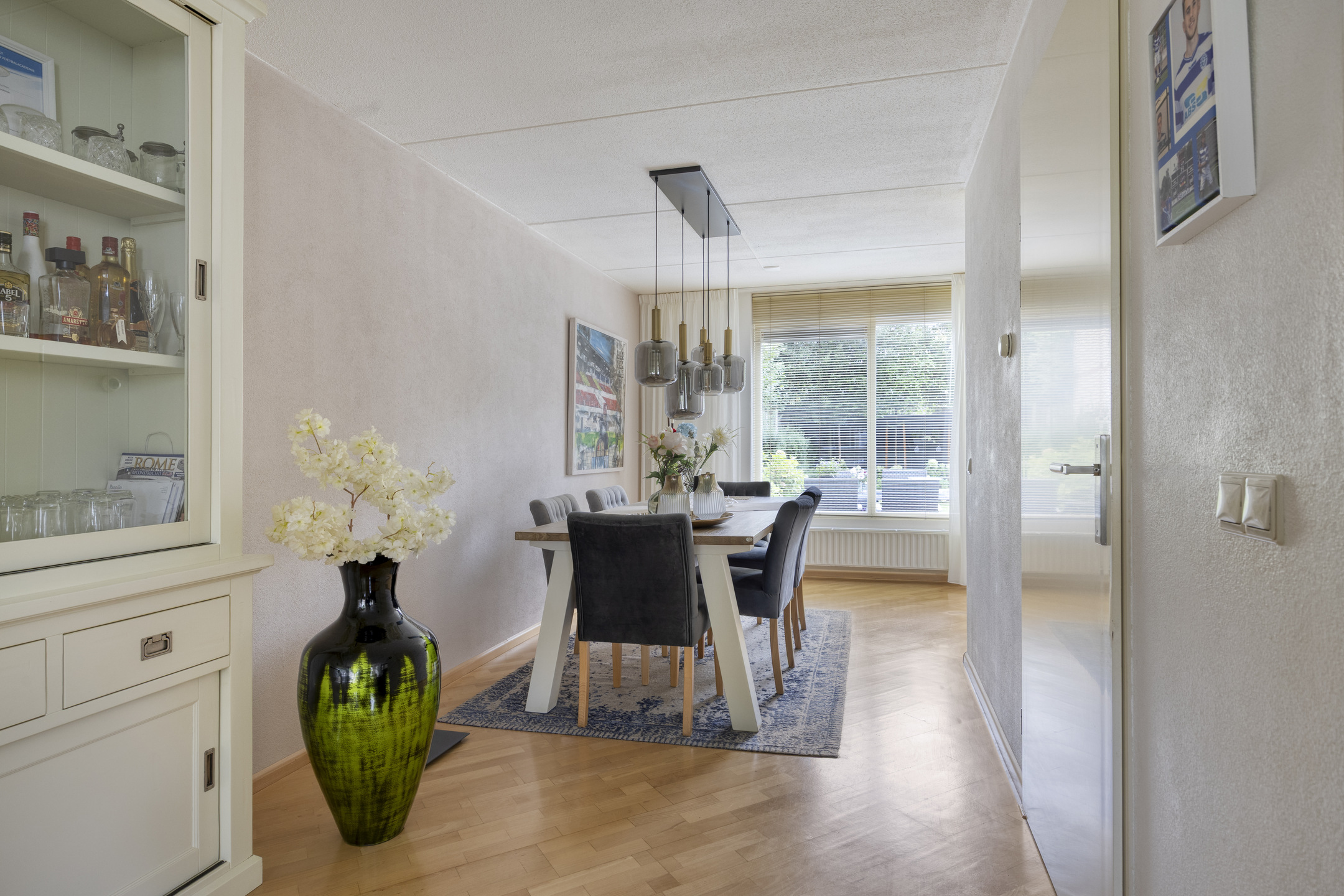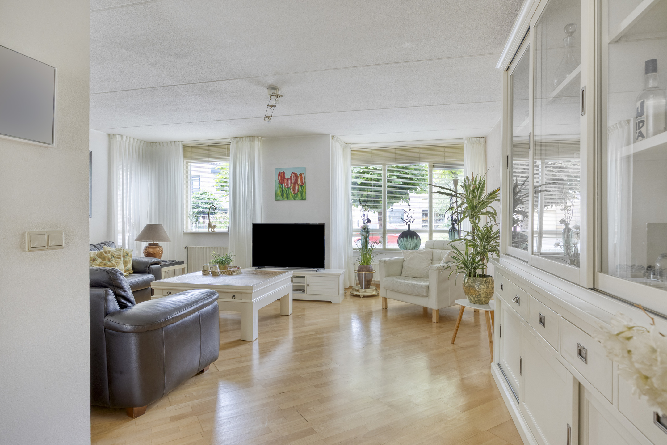 Vanaf de rustige straat met ruime parkeermogelijkheden bereikt u de oprit en entree van de woning. In de hal is plaats voor de garderobe en vindt u het toilet met fonteintje en de meterkast. Vanuit hier loopt u door naar de L-vormige woonkamer, waar de grote ramen en erker voor een prettige lichtinval zorgen. De beuken lamelparketvloer geeft de ruimte een warme uitstraling.