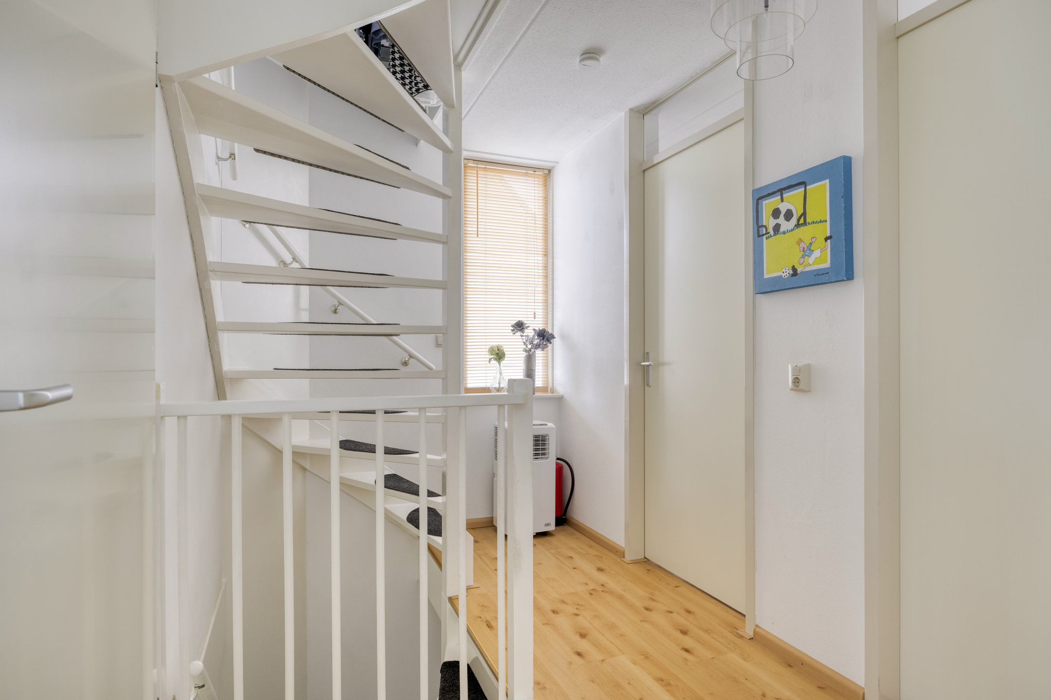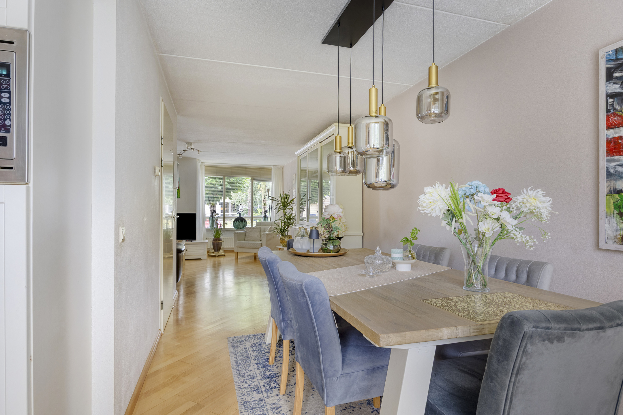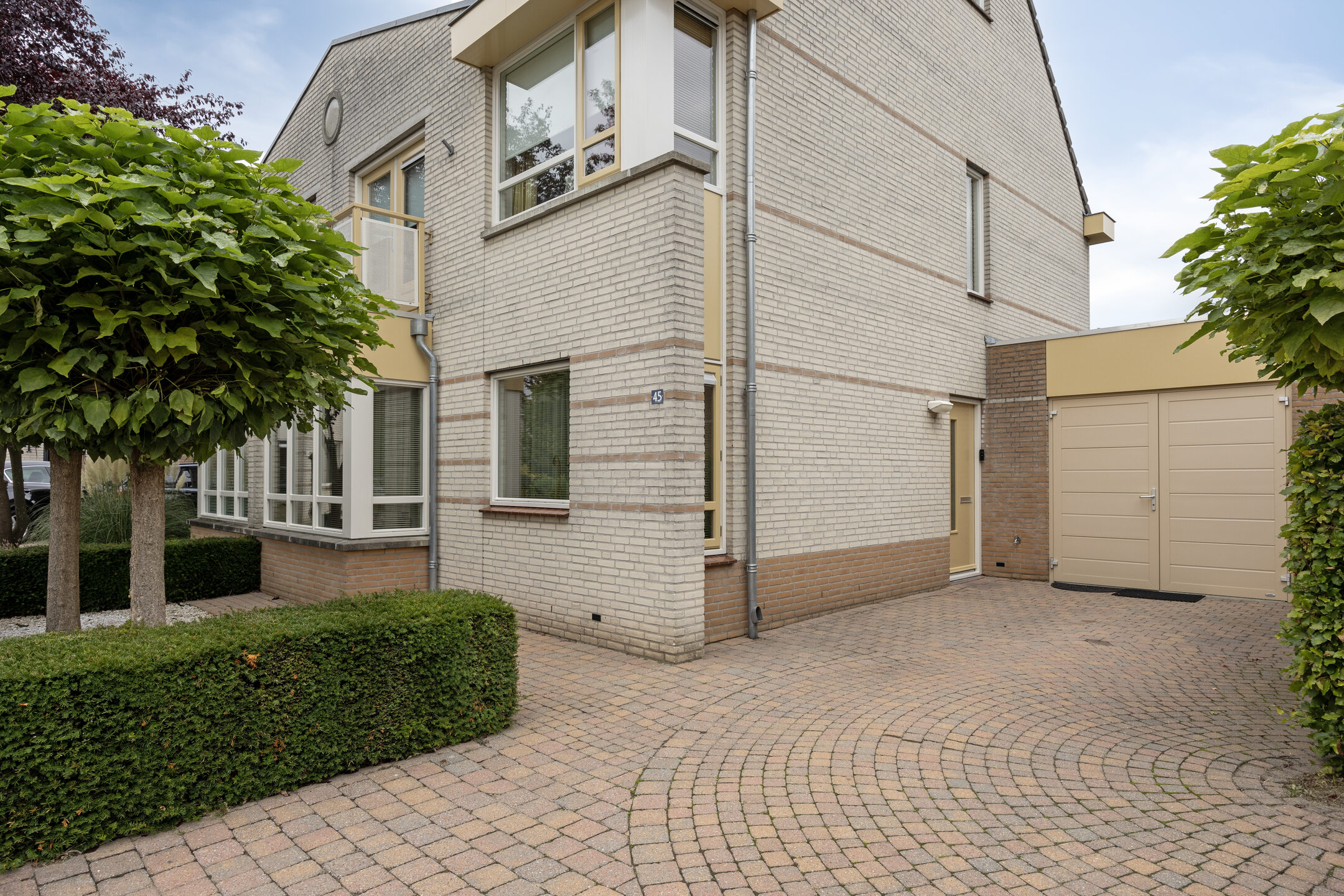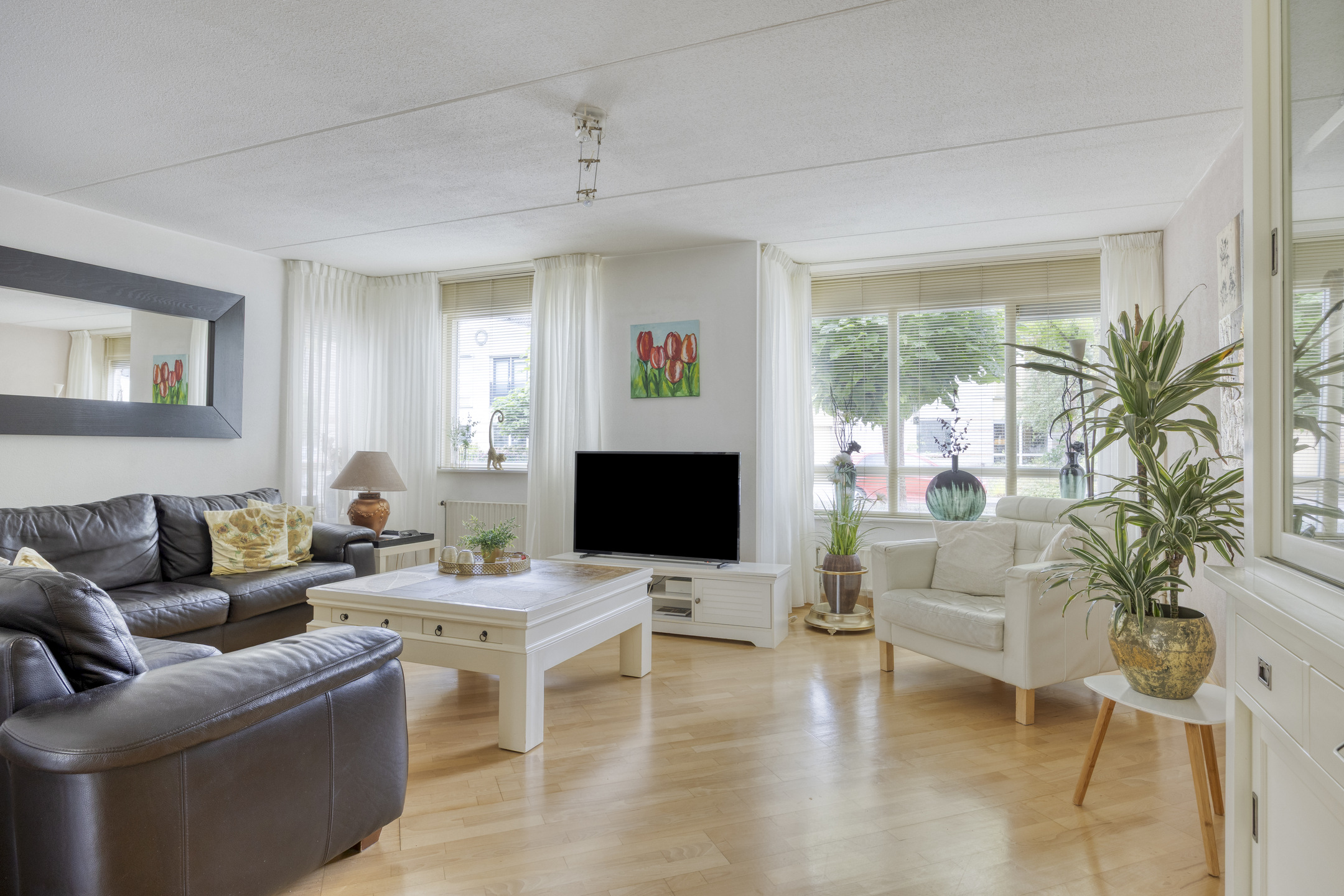 Vanaf de rustige straat met ruime parkeermogelijkheden bereikt u de oprit en entree van de woning. In de hal is plaats voor de garderobe en vindt u het toilet met fonteintje en de meterkast. Vanuit hier loopt u door naar de L-vormige woonkamer, waar de grote ramen en erker voor een prettige lichtinval zorgen. De beuken lamelparketvloer geeft de ruimte een warme uitstraling.