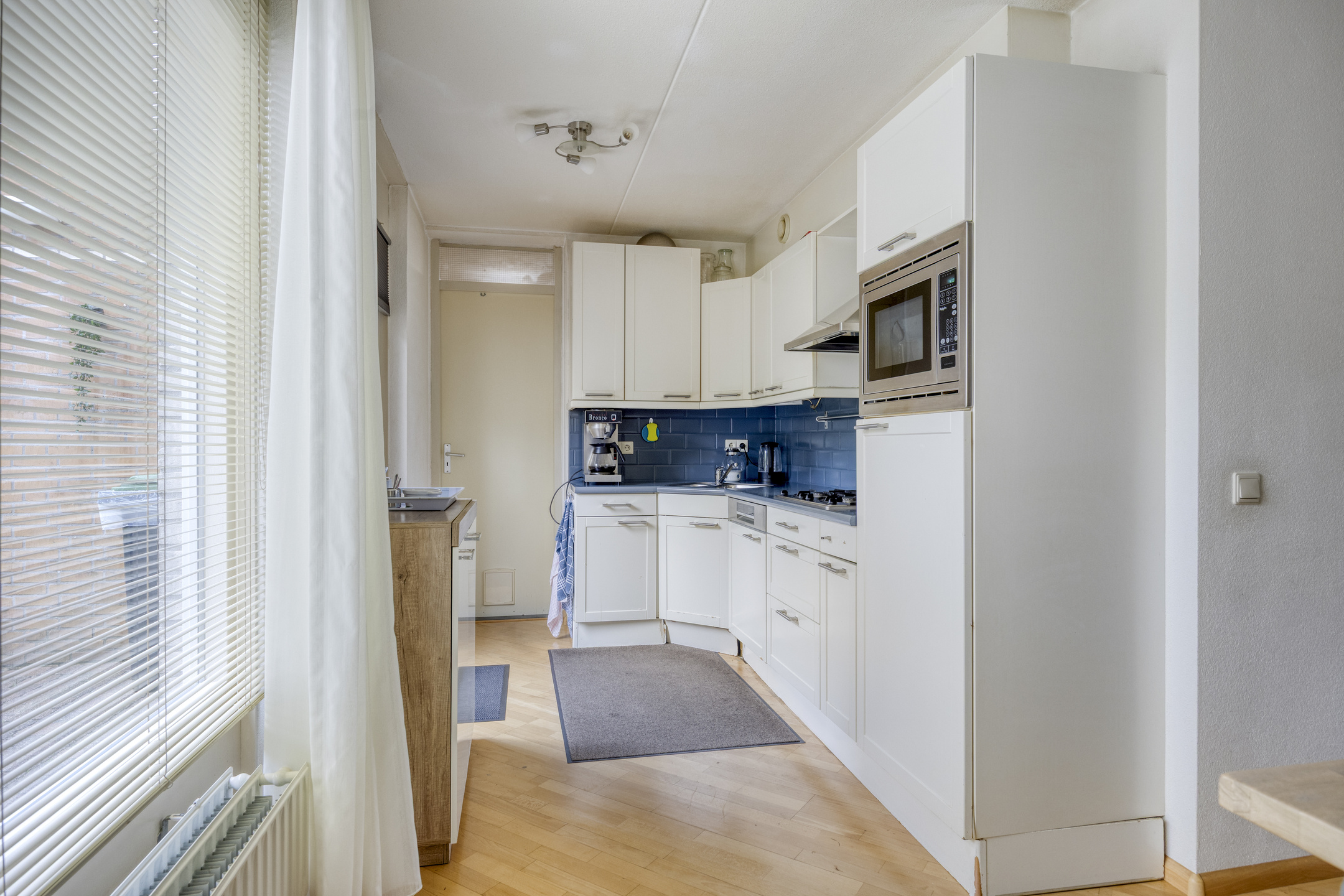De open keuken aan de achterzijde is voorzien van inbouwapparatuur en geeft toegang tot de tuin én de aangebouwde, geïsoleerde garage. Deze is verwarmd, heeft een wateraansluiting en is daardoor geschikt voor diverse doeleinden.