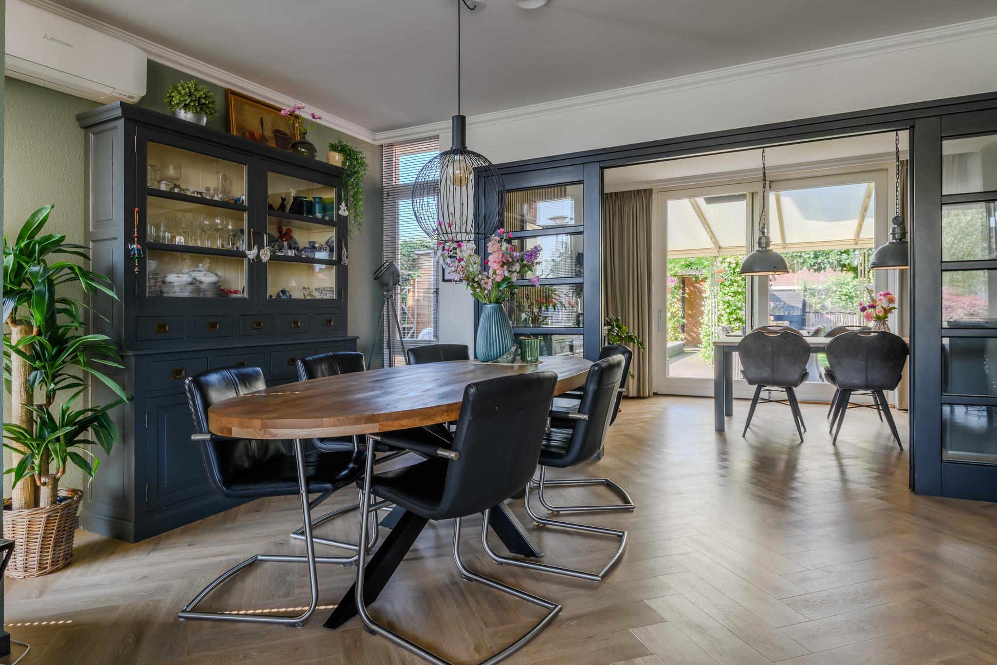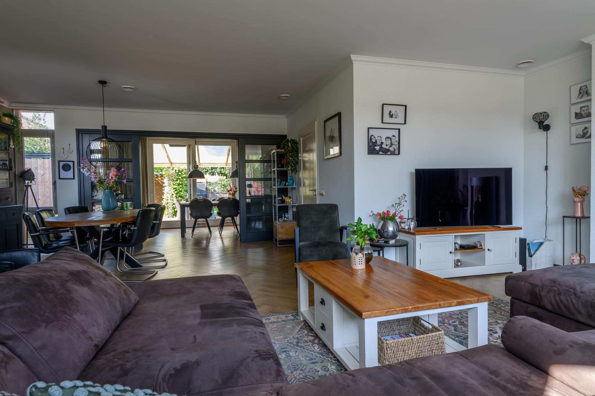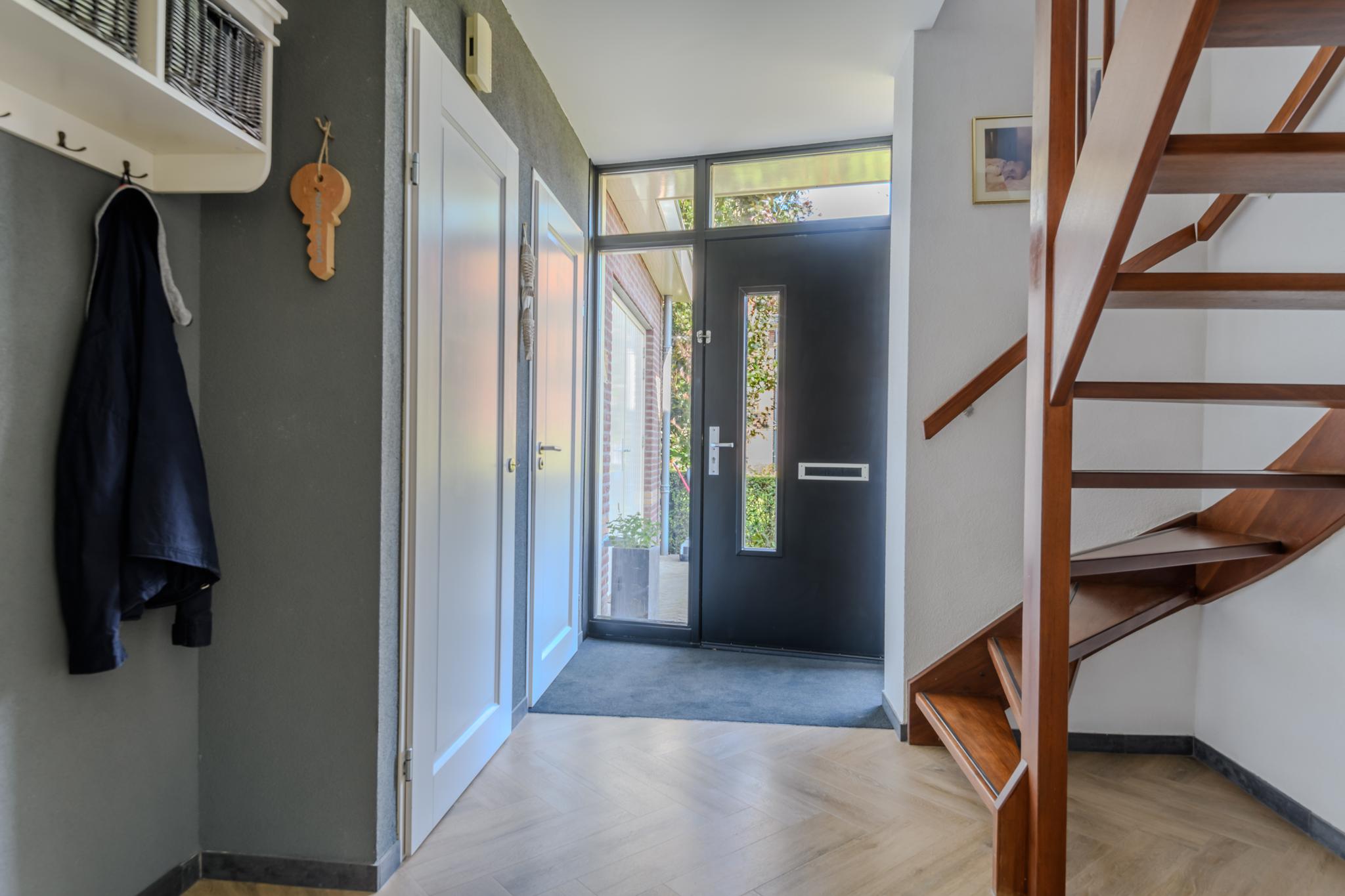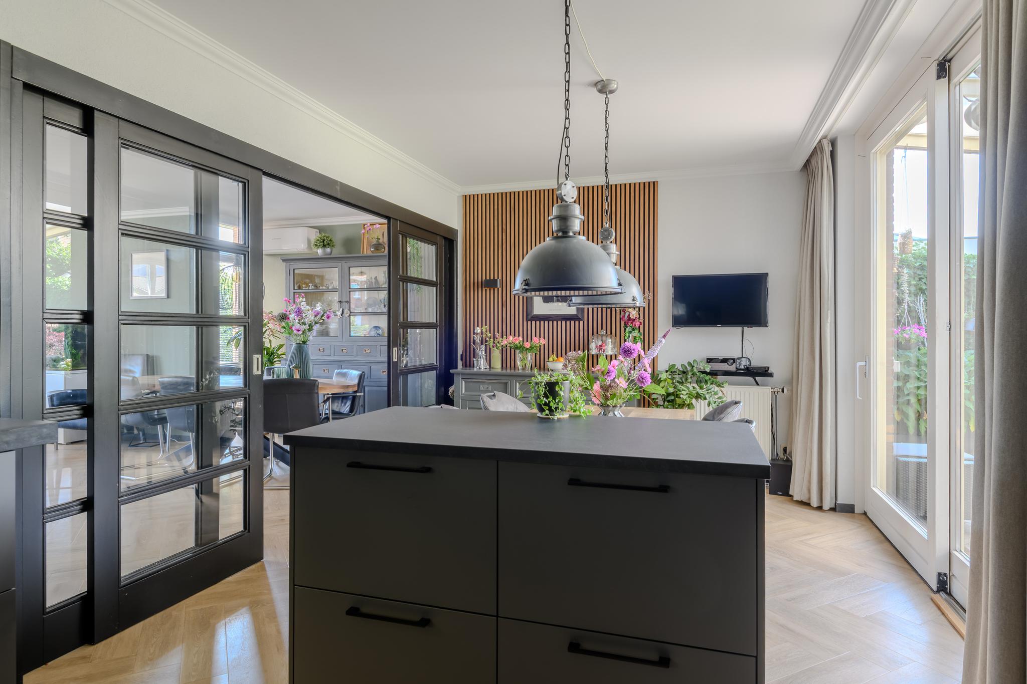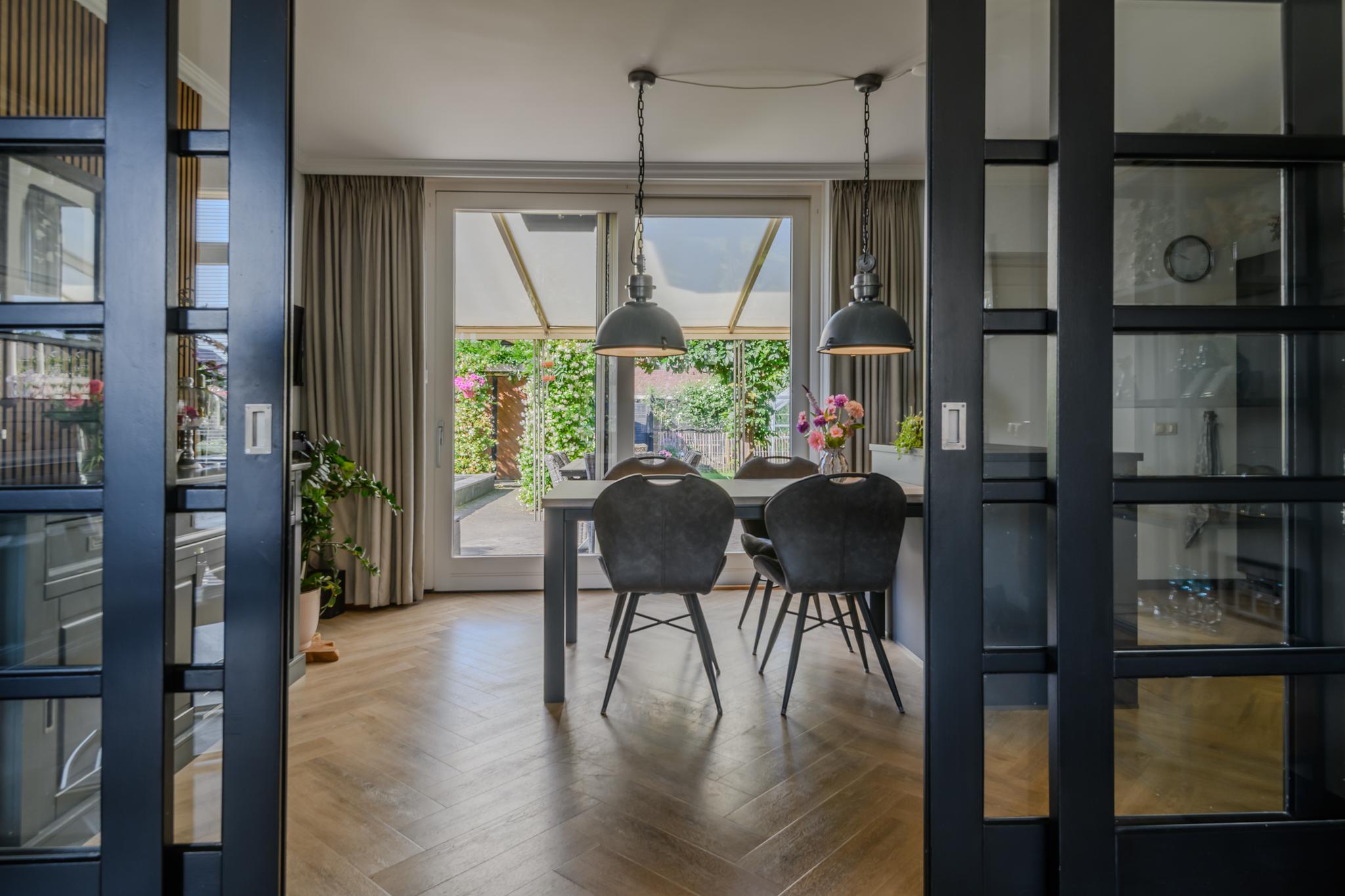 Entree met ruime hal en meterkast, modern hangend toilet, ruime en lichte L-vormige woonkamer met een hoogwaardige PVC vloer in visgraatmotief en een sfeer verhogende gashaard. De woonkeuken is middels schuifdeuren “en-suite” af te sluiten van de woonkamer. Deze woonkeuken bevindt zich aan de achterzijde en heeft een schuifpui naar het overdekte terras en achtertuin. De luxe keukenopstelling is van 2022 en beschikt uiteraard over de nodige inbouwapparatuur zoals een oven én magnetron, vaatwasser, inductie-kookplaat, koelkast en een design afzuigkap. Via de keuken is ook de praktische bijkeuken met de wasmachine- en drogeraansluiting te bereiken. Ook hier zit een deur naar de tuin.