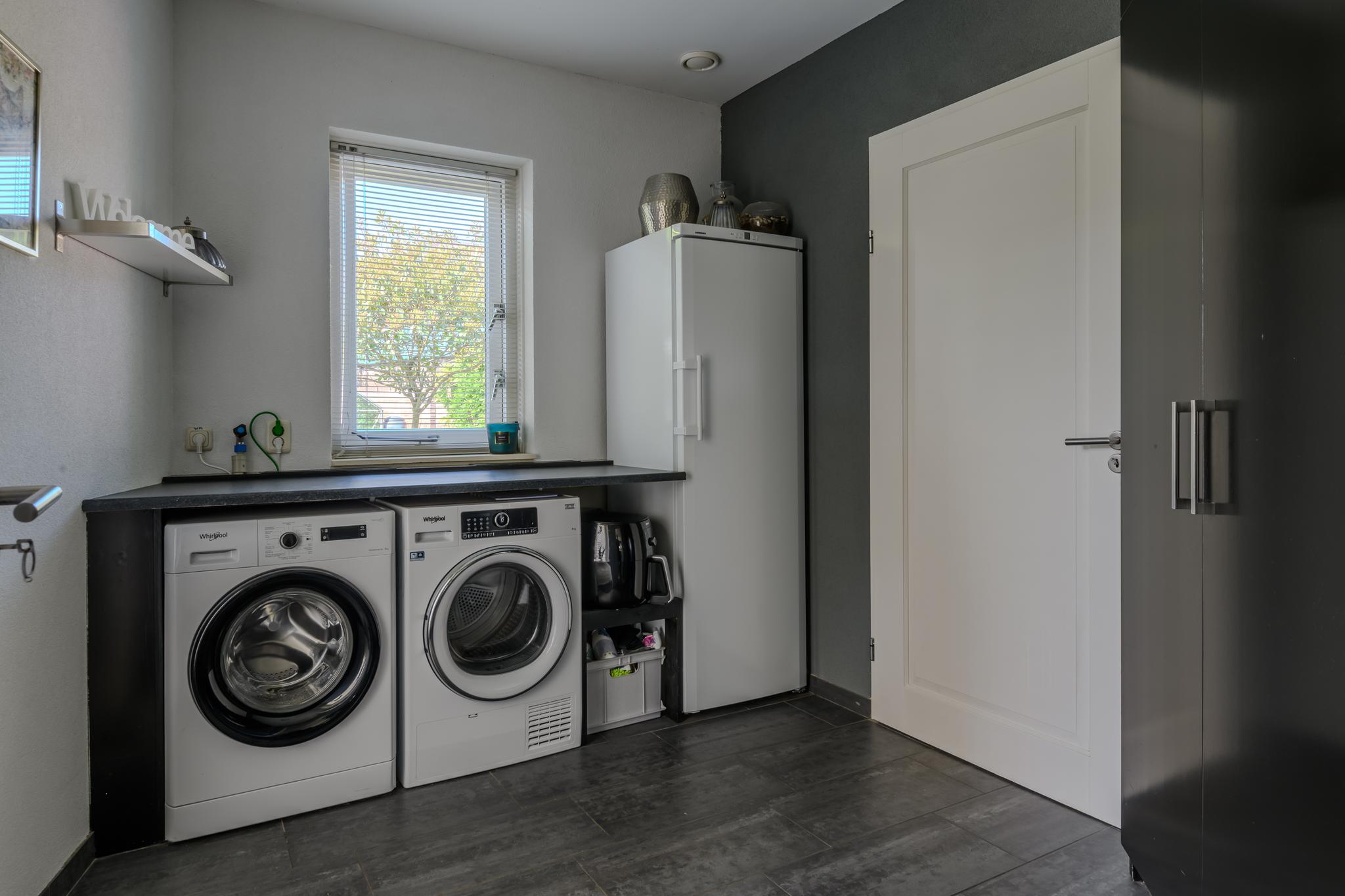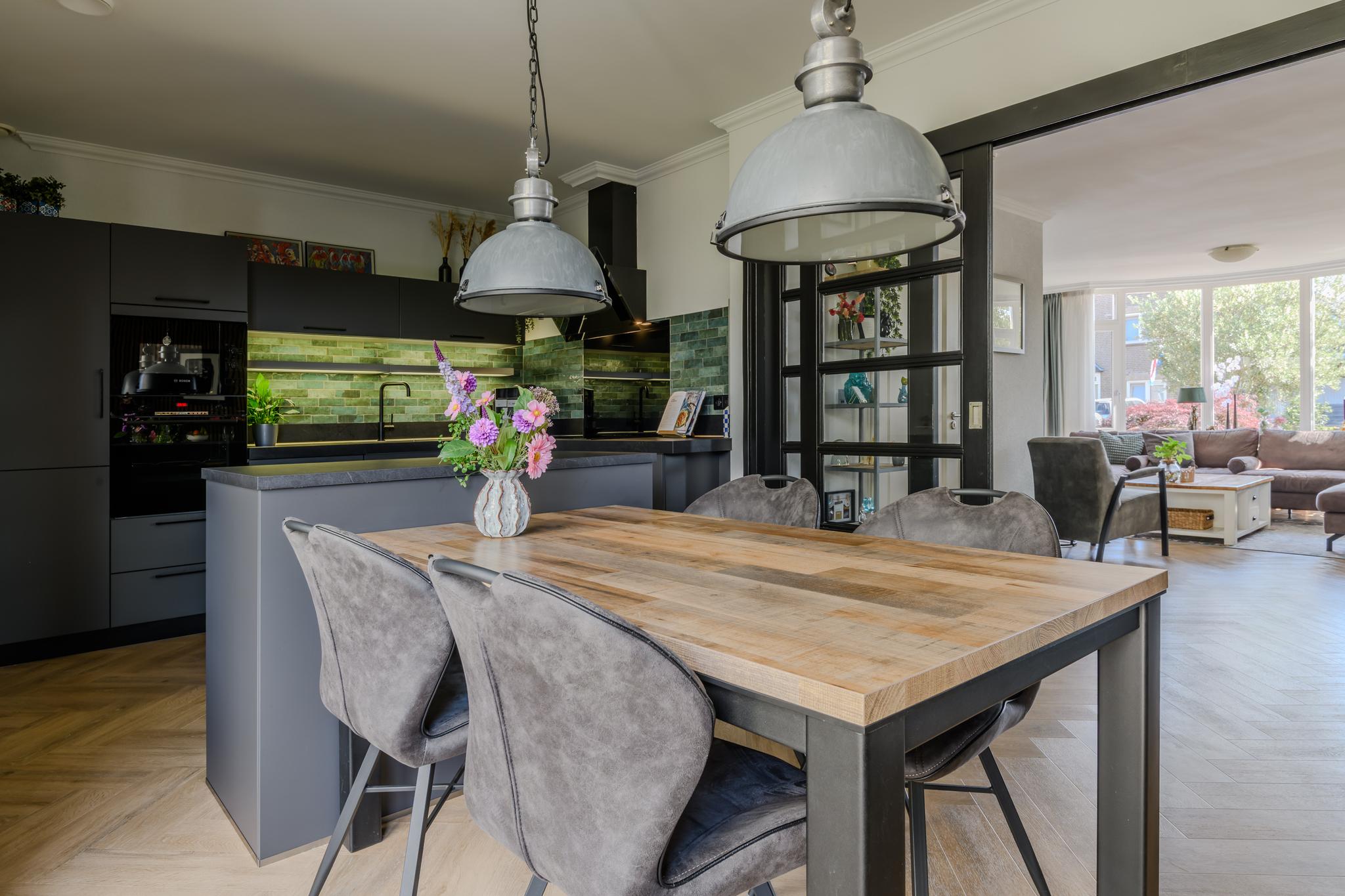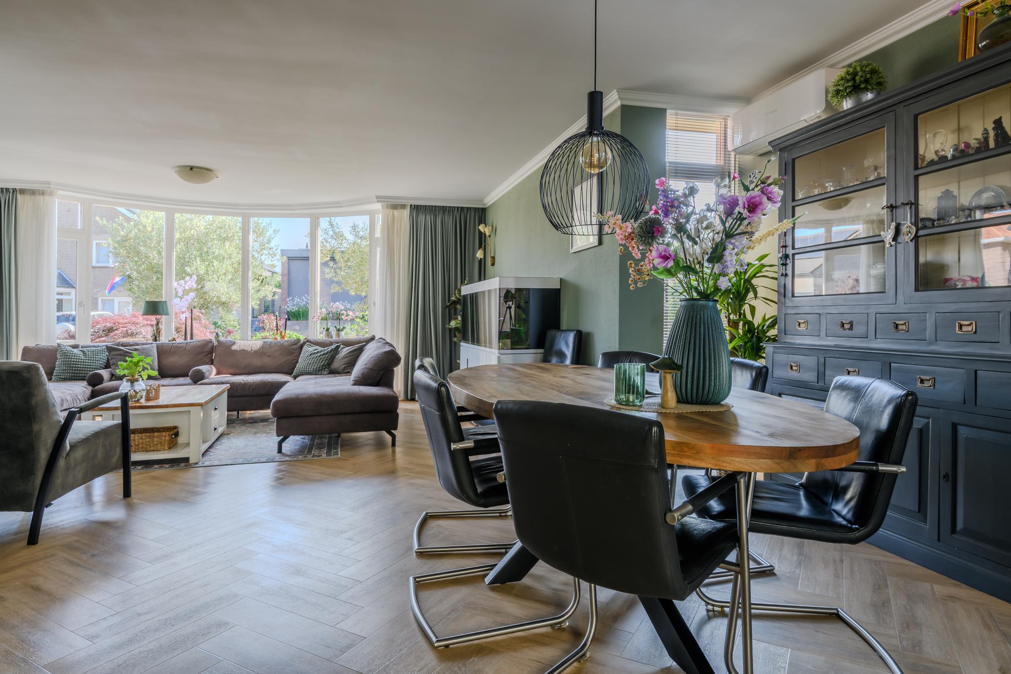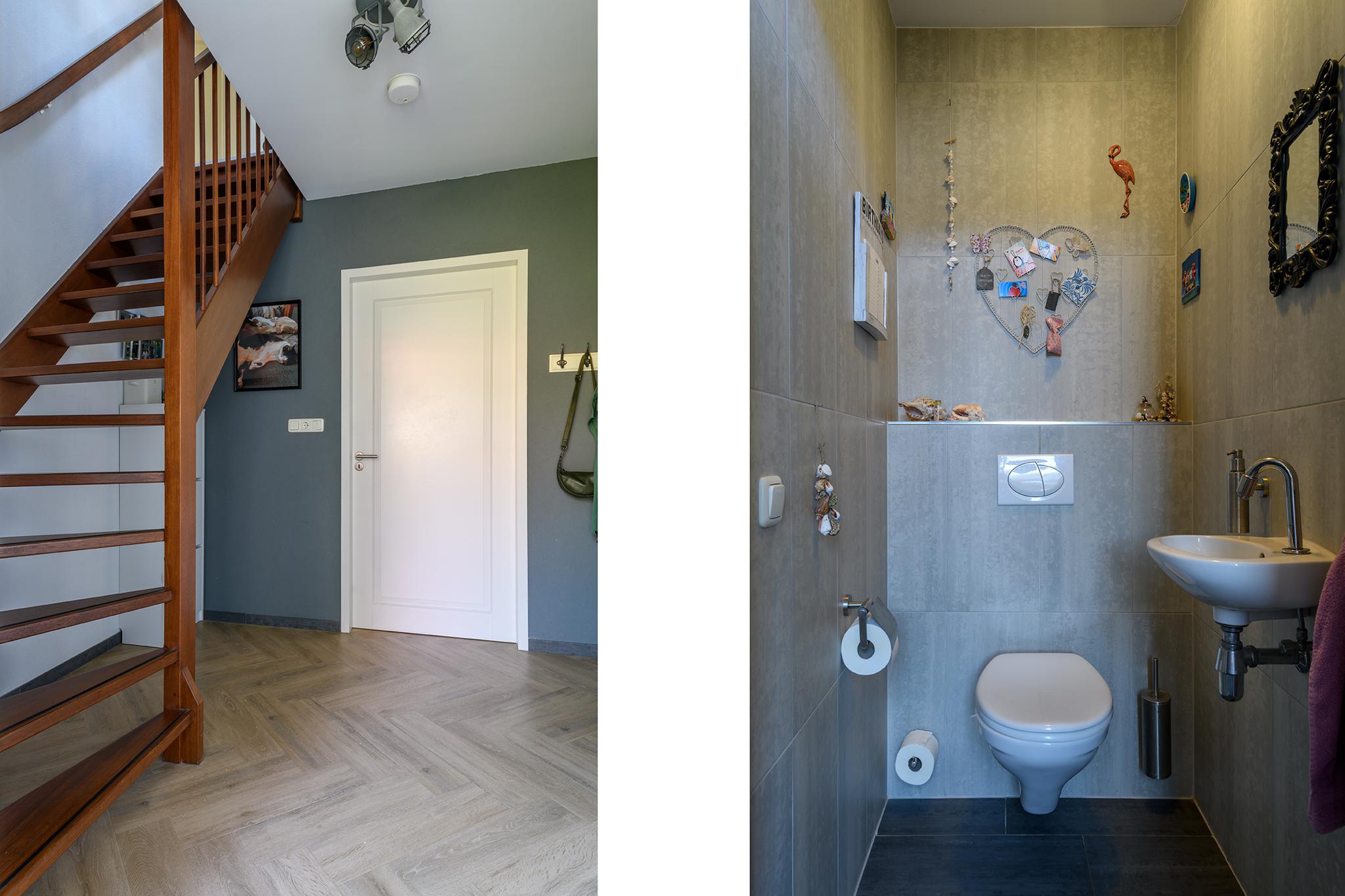Entree met ruime hal en meterkast, modern hangend toilet, ruime en lichte L-vormige woonkamer met een hoogwaardige PVC vloer in visgraatmotief en een sfeer verhogende gashaard. De woonkeuken is middels schuifdeuren “en-suite” af te sluiten van de woonkamer. Deze woonkeuken bevindt zich aan de achterzijde en heeft een schuifpui naar het overdekte terras en achtertuin. De luxe keukenopstelling is van 2022 en beschikt uiteraard over de nodige inbouwapparatuur zoals een oven én magnetron, vaatwasser, inductie-kookplaat, koelkast en een design afzuigkap. Via de keuken is ook de praktische bijkeuken met de wasmachine- en drogeraansluiting te bereiken. Ook hier zit een deur naar de tuin.