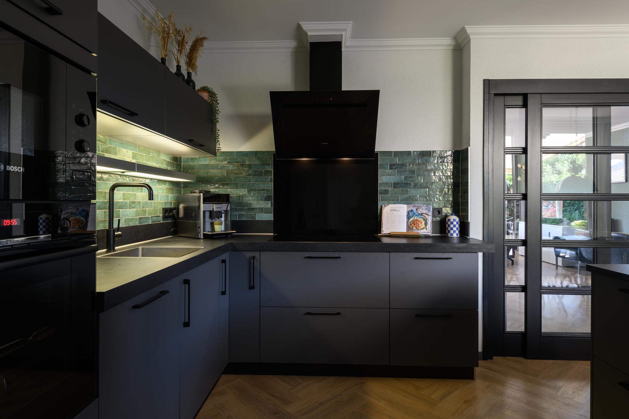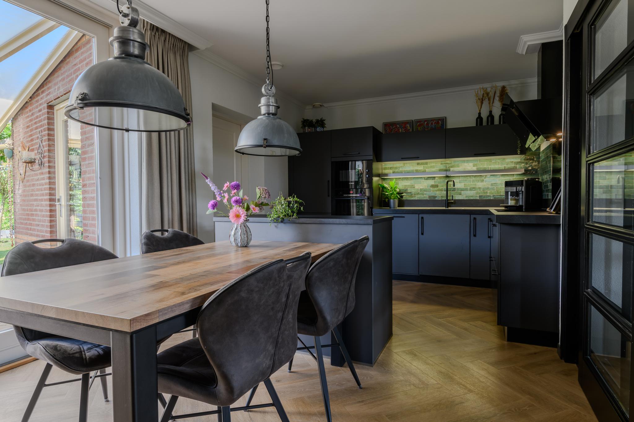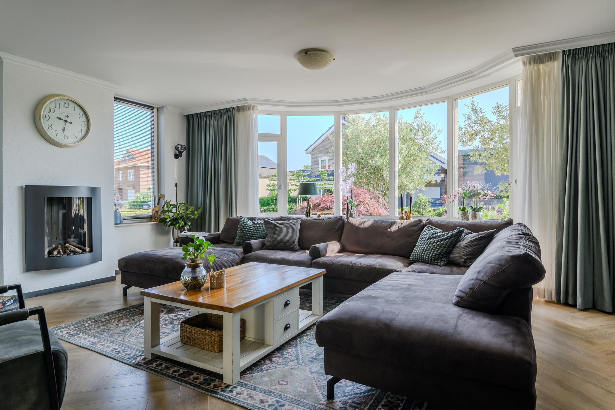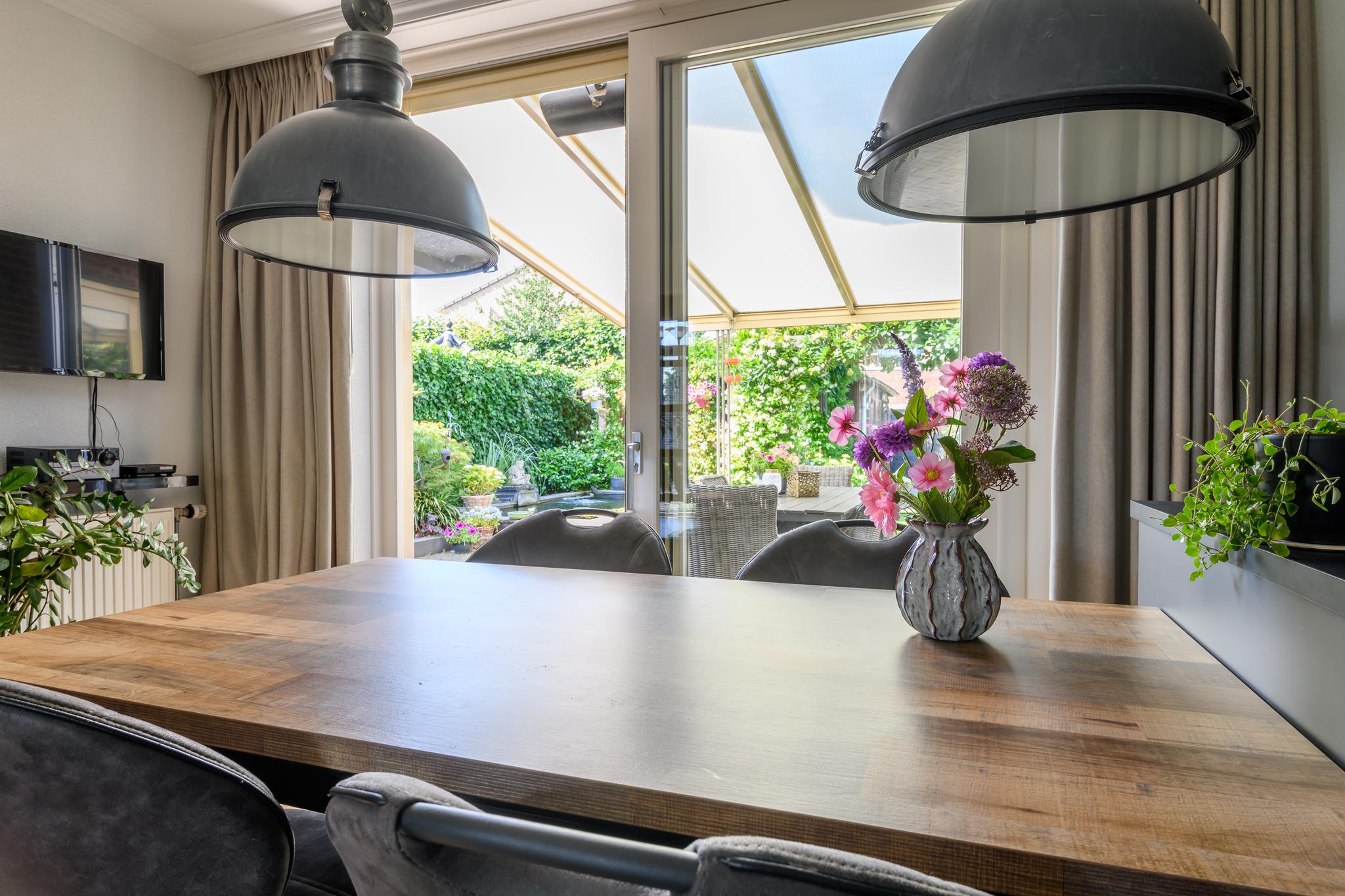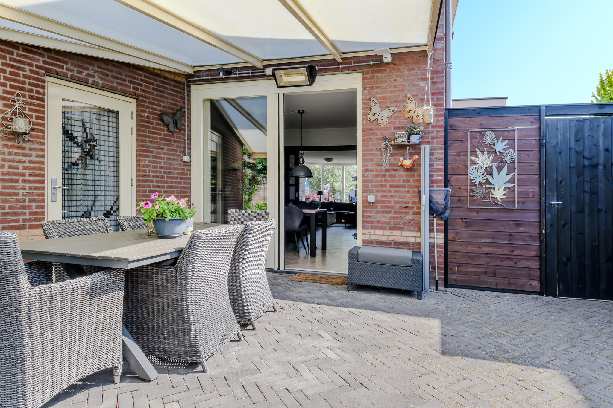 Entree met ruime hal en meterkast, modern hangend toilet, ruime en lichte L-vormige woonkamer met een hoogwaardige PVC vloer in visgraatmotief en een sfeer verhogende gashaard. De woonkeuken is middels schuifdeuren “en-suite” af te sluiten van de woonkamer. Deze woonkeuken bevindt zich aan de achterzijde en heeft een schuifpui naar het overdekte terras en achtertuin. De luxe keukenopstelling is van 2022 en beschikt uiteraard over de nodige inbouwapparatuur zoals een oven én magnetron, vaatwasser, inductie-kookplaat, koelkast en een design afzuigkap. Via de keuken is ook de praktische bijkeuken met de wasmachine- en drogeraansluiting te bereiken. Ook hier zit een deur naar de tuin.