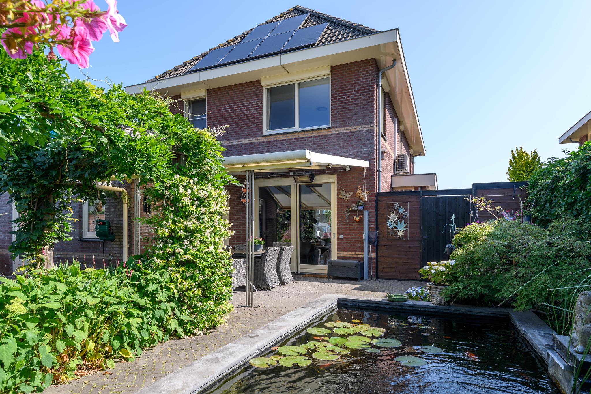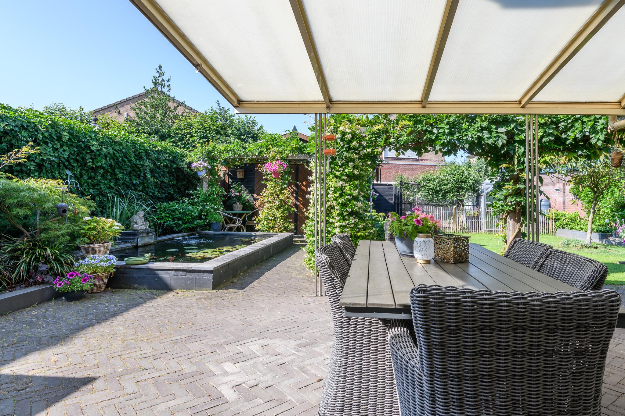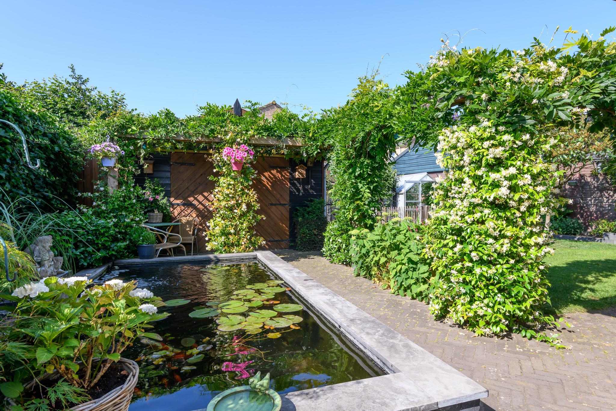 Op het zuidwesten gelegen dus perfect op de zon! Sfeervolle tuin met diverse borders, een vijver, gazon en achterin scharellen de kippen. Op het terras achter de keuken is het vanwege een aluminium overkapping goed toeven.