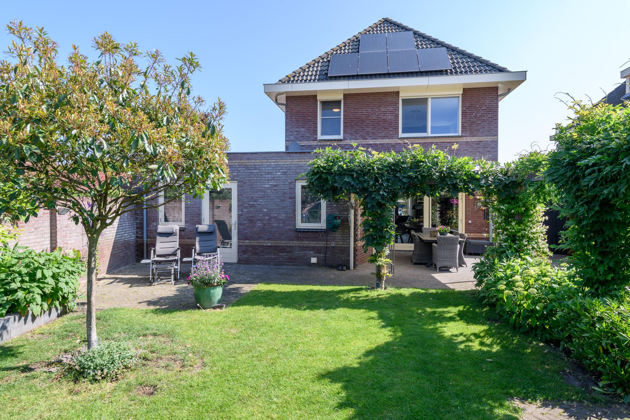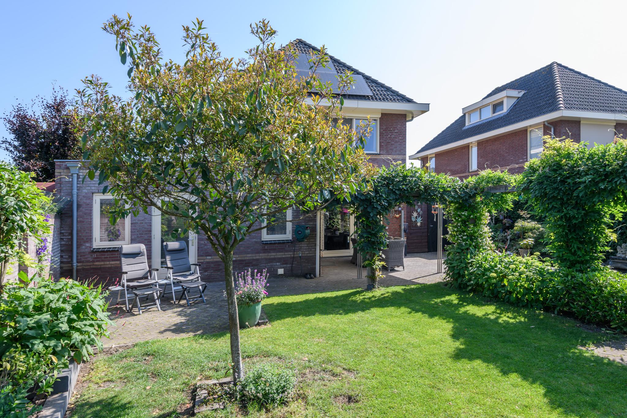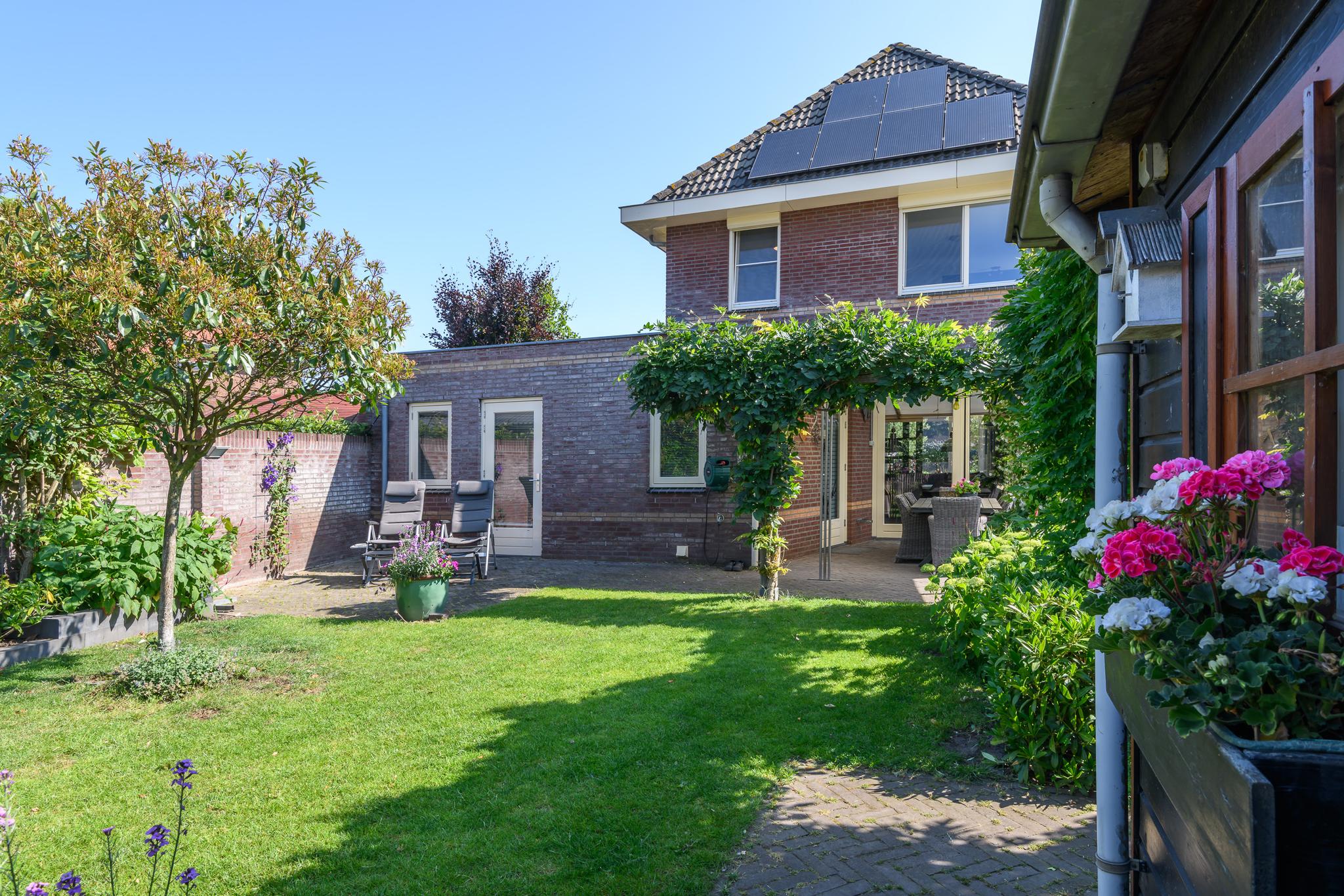 Op het zuidwesten gelegen dus perfect op de zon! Sfeervolle tuin met diverse borders, een vijver, gazon en achterin scharellen de kippen. Op het terras achter de keuken is het vanwege een aluminium overkapping goed toeven.