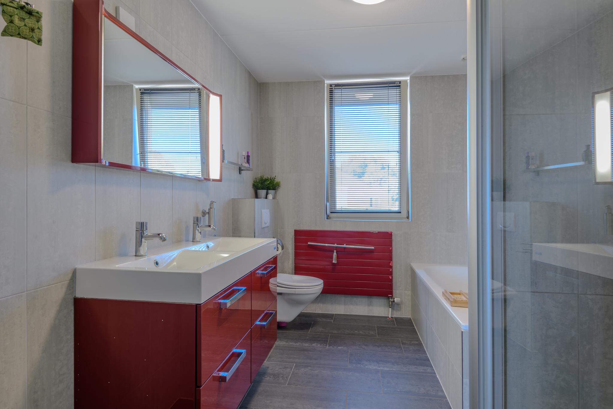 Overloop, 3 ruime slaapkamers waarvan de masterbedroom beschikt over een airco en een vaste kastenwand. Complete en nette badkamer met licht tegelwerk, douche, ligbad, 2e hangend toilet en wastafelmeubel met dubbele wastafel.