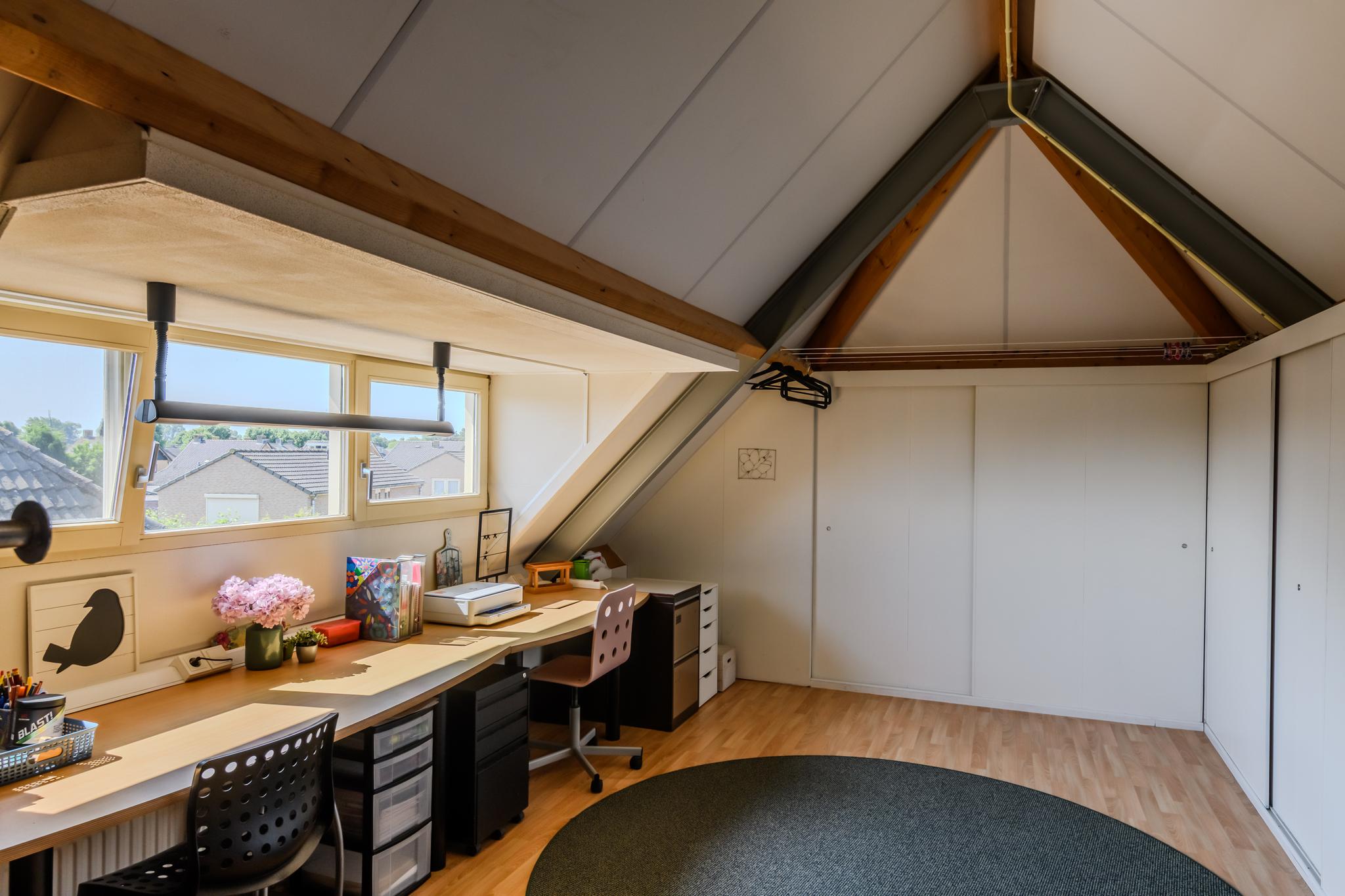 2e Verdieping: vaste trap naar ruime en lichte zolderetage met een brede dakkapel. Met enkele aanpassingen zijn er hier eenvoudig twee extra kamers te realiseren. Opbergmogelijkheden zijn er voldoende achter de knieschotten.