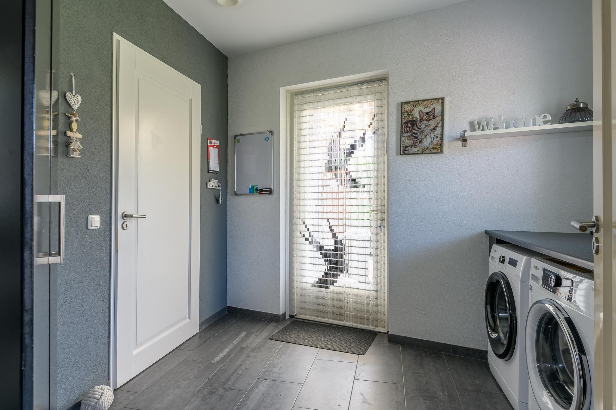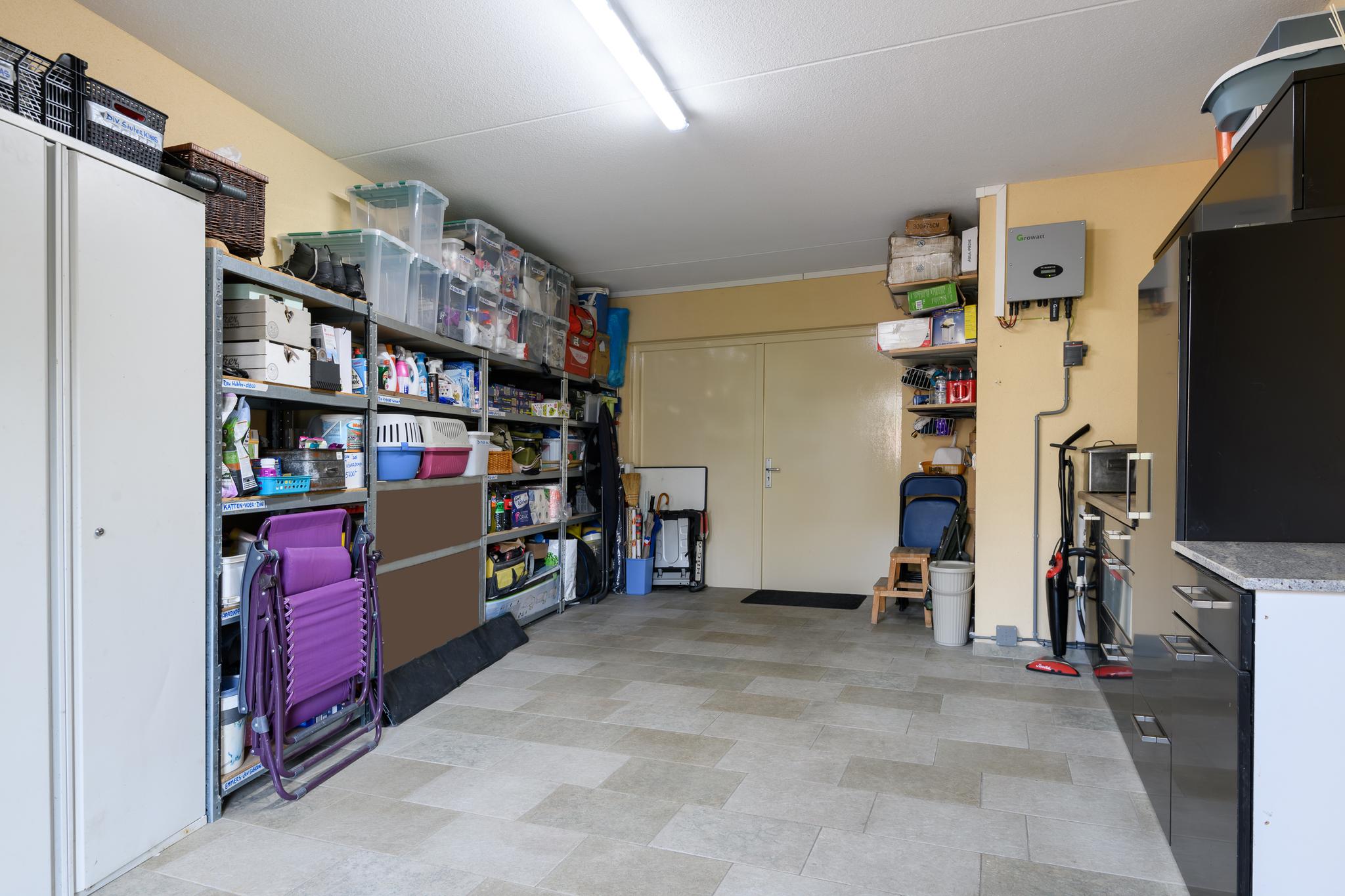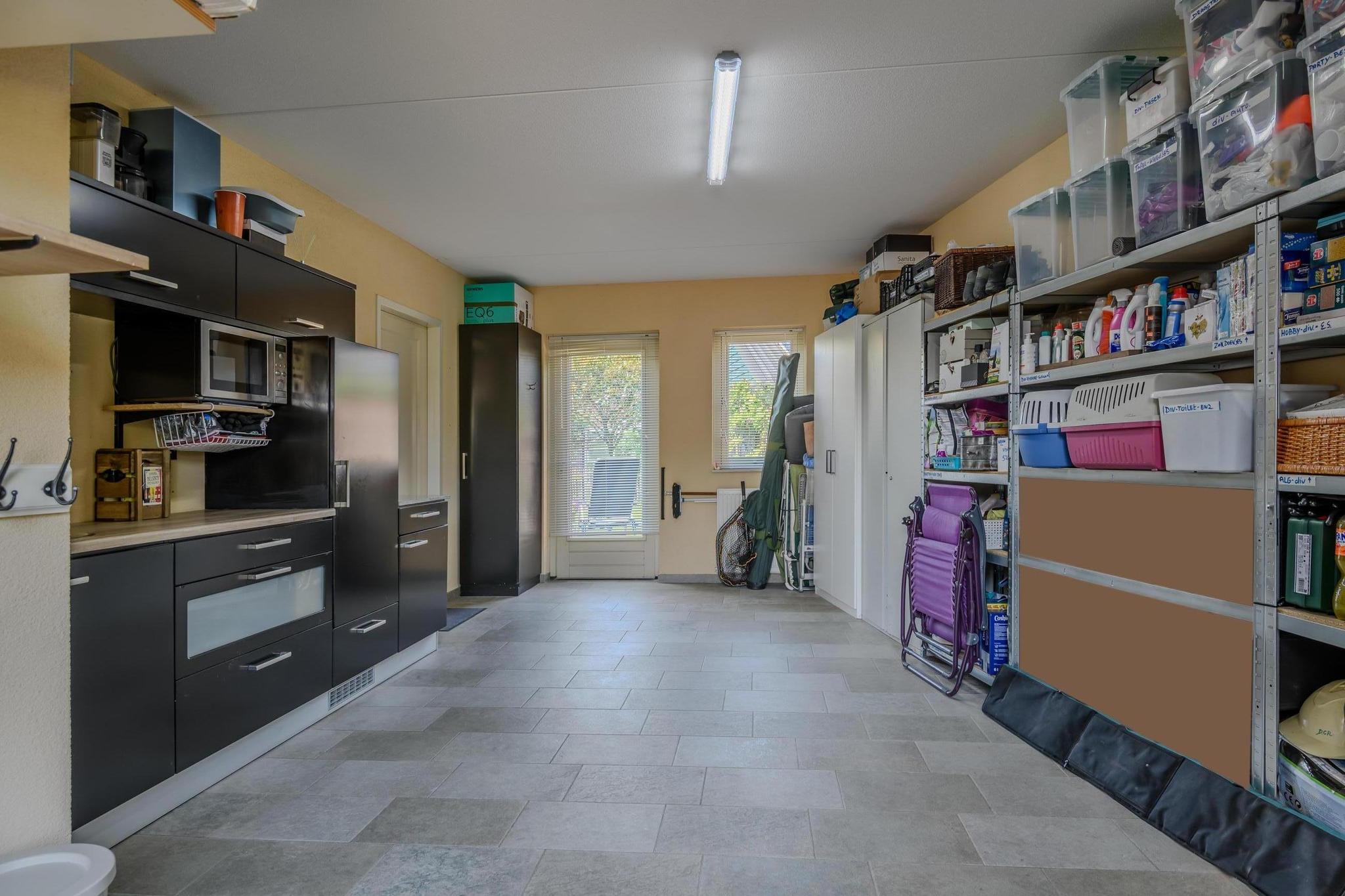 Tot slot kom je in de betegelde en verwarmde garage. Hier vind je een 2e keukenblok met een warm- en koude wateraansluiting. In combinatie met de goede isolatie en plafondhoogte is deze ruimte multifunctioneel te gebruiken of om te bouwen tot (slaap-)kamer.