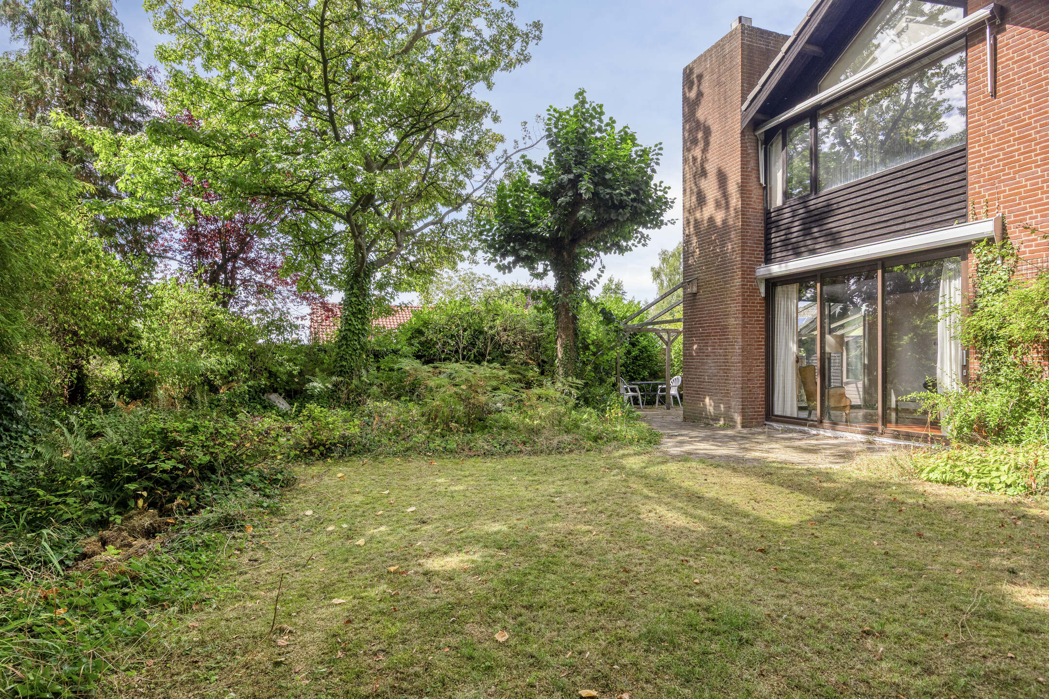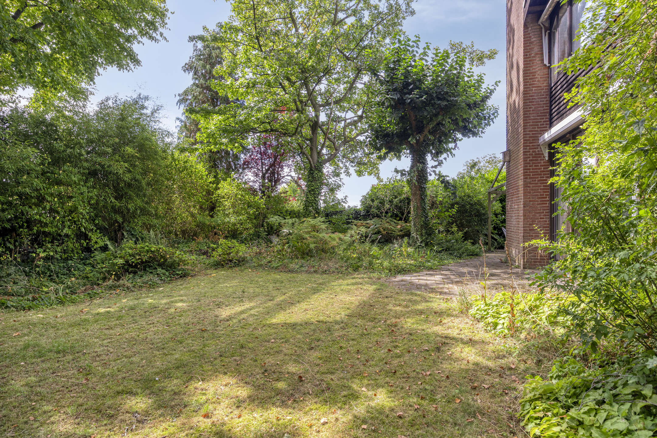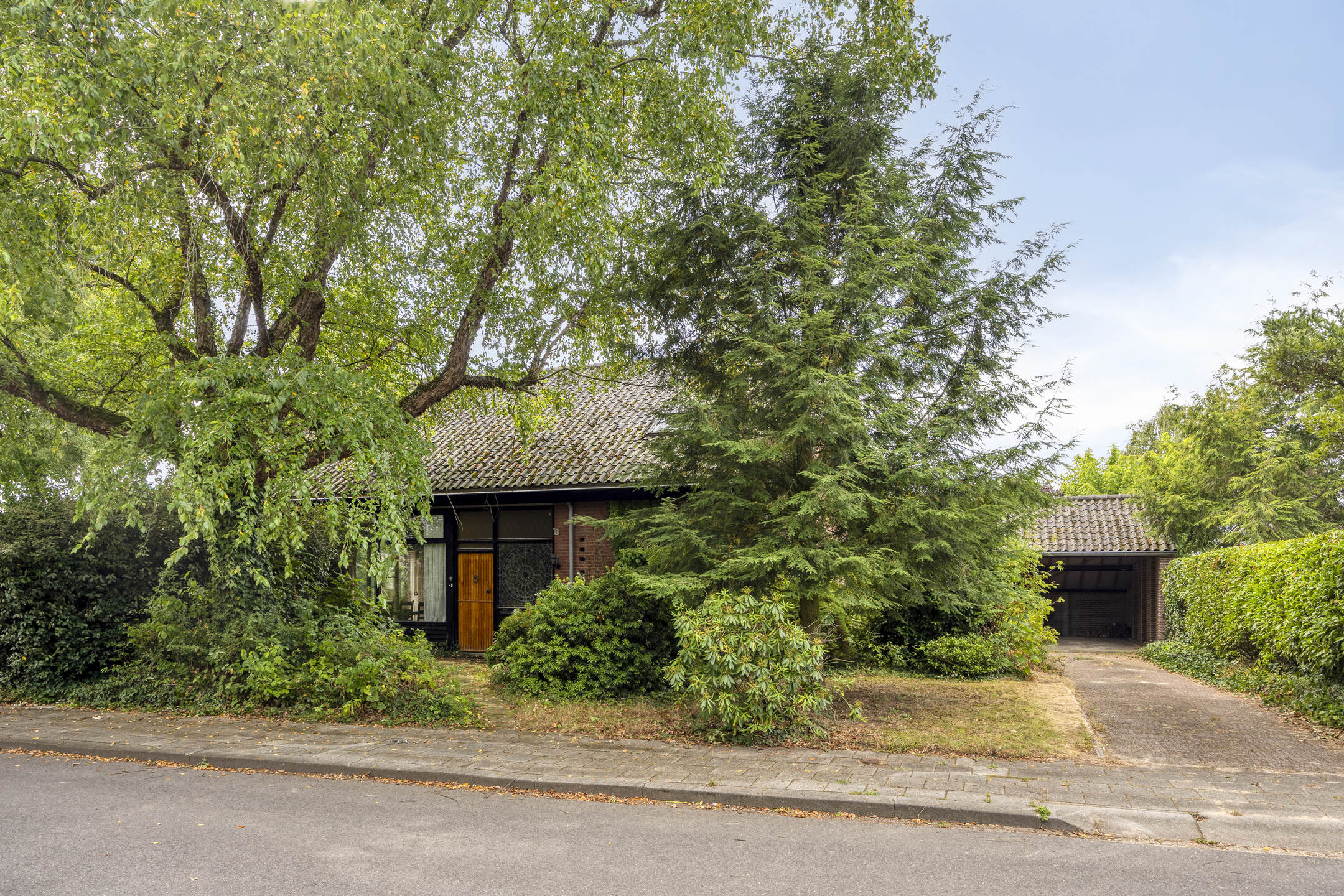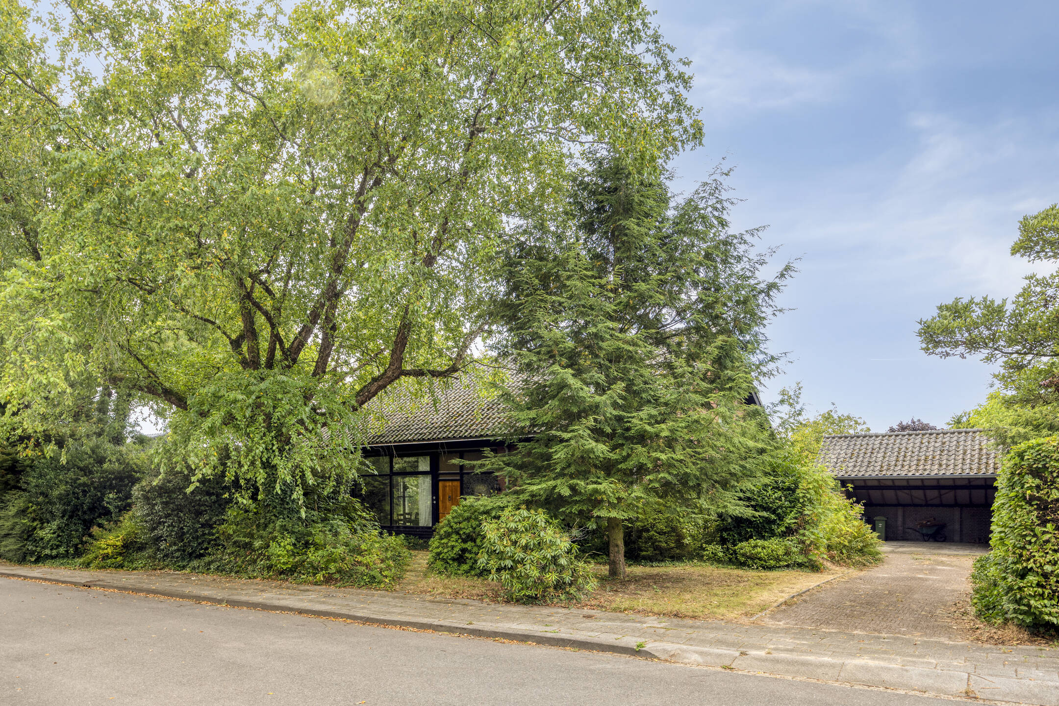 De woning wordt omgeven door een ruime, groene tuin die veel privacy biedt. Aan de voorzijde bevindt zich een grote carport met ruimte voor twee auto’s.