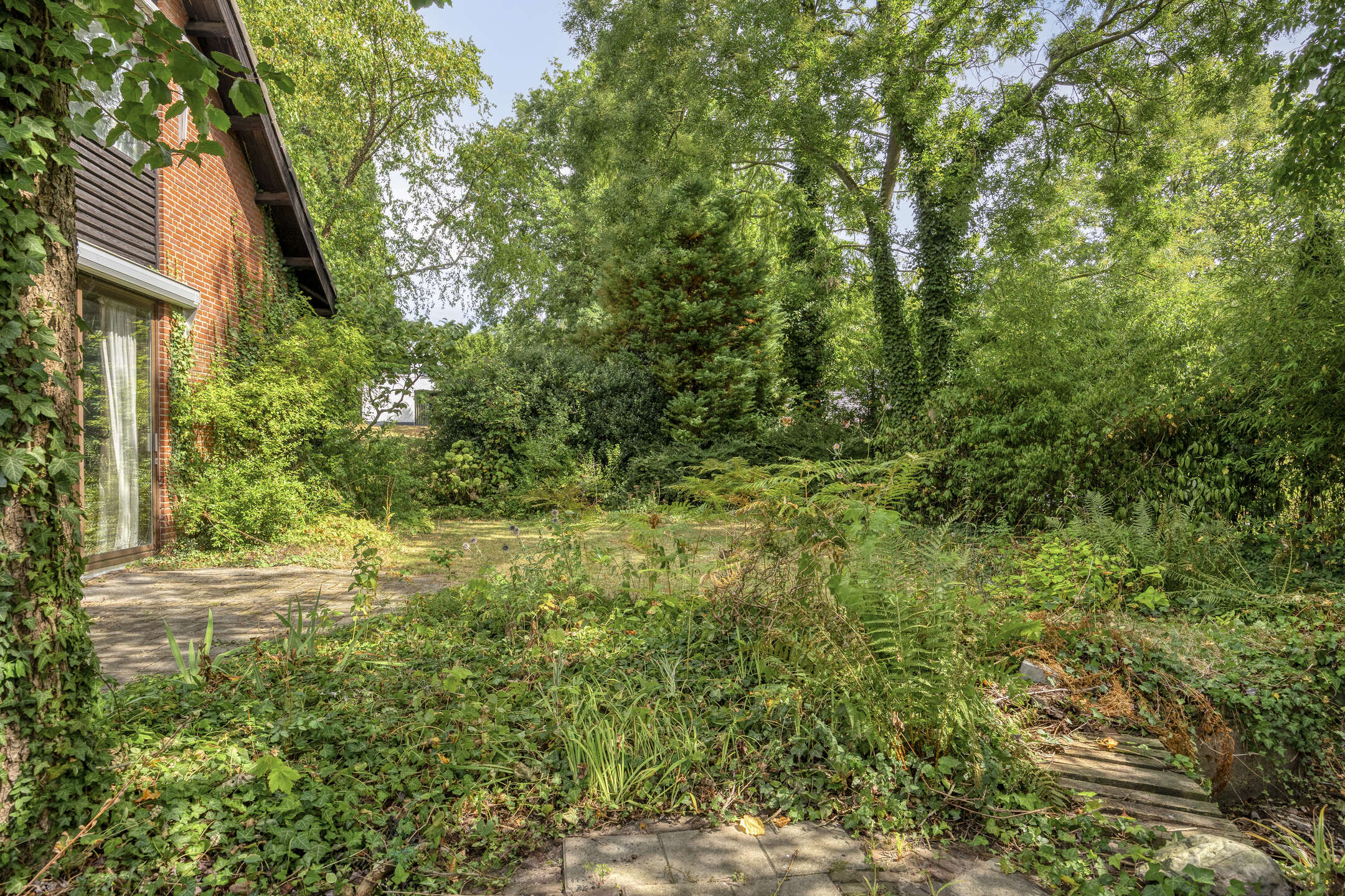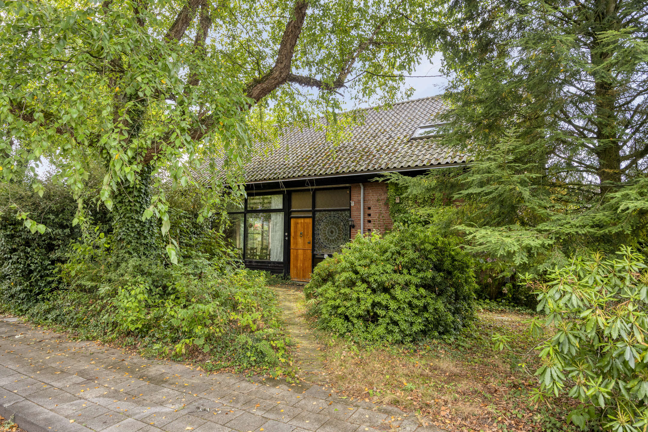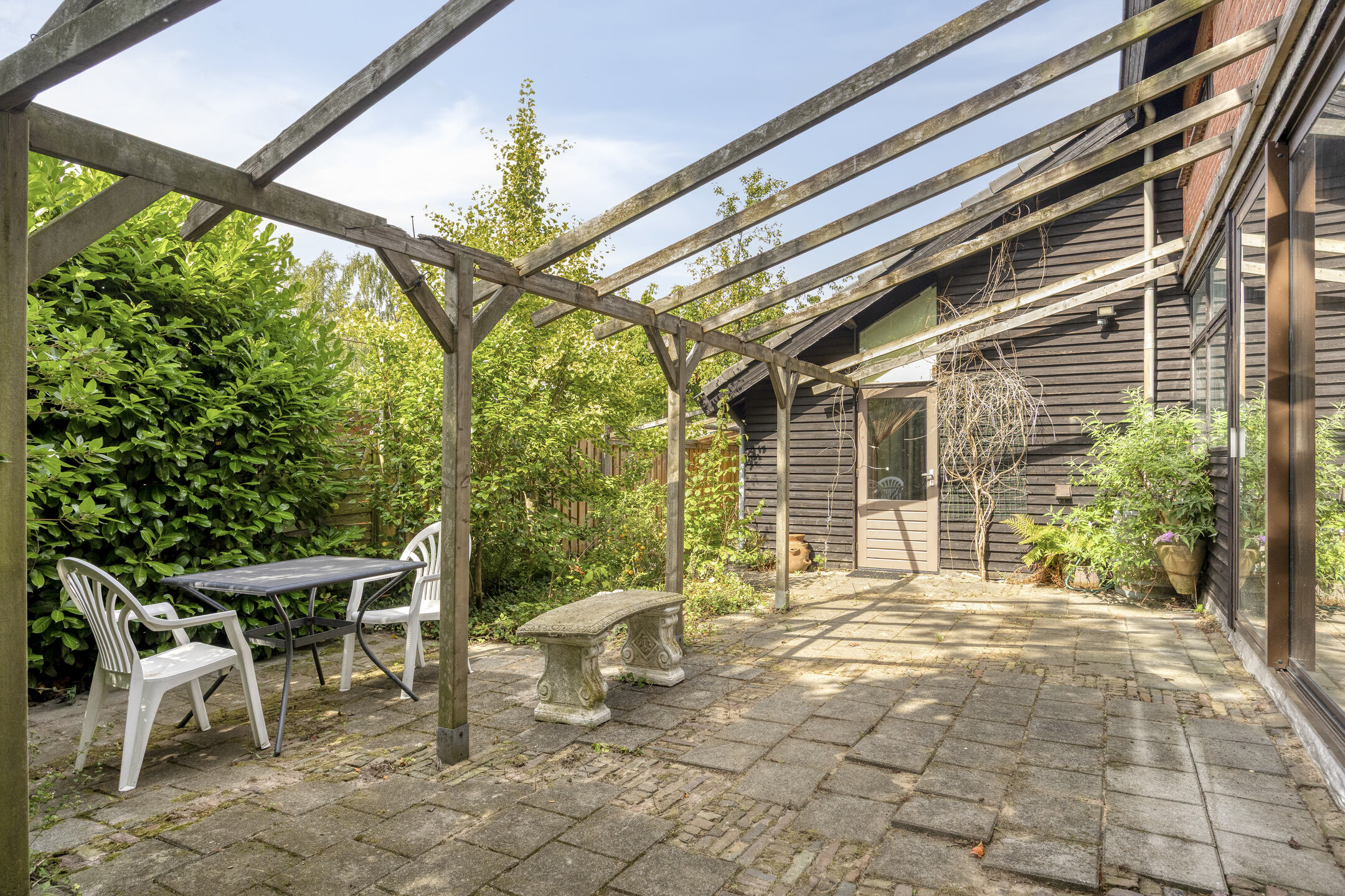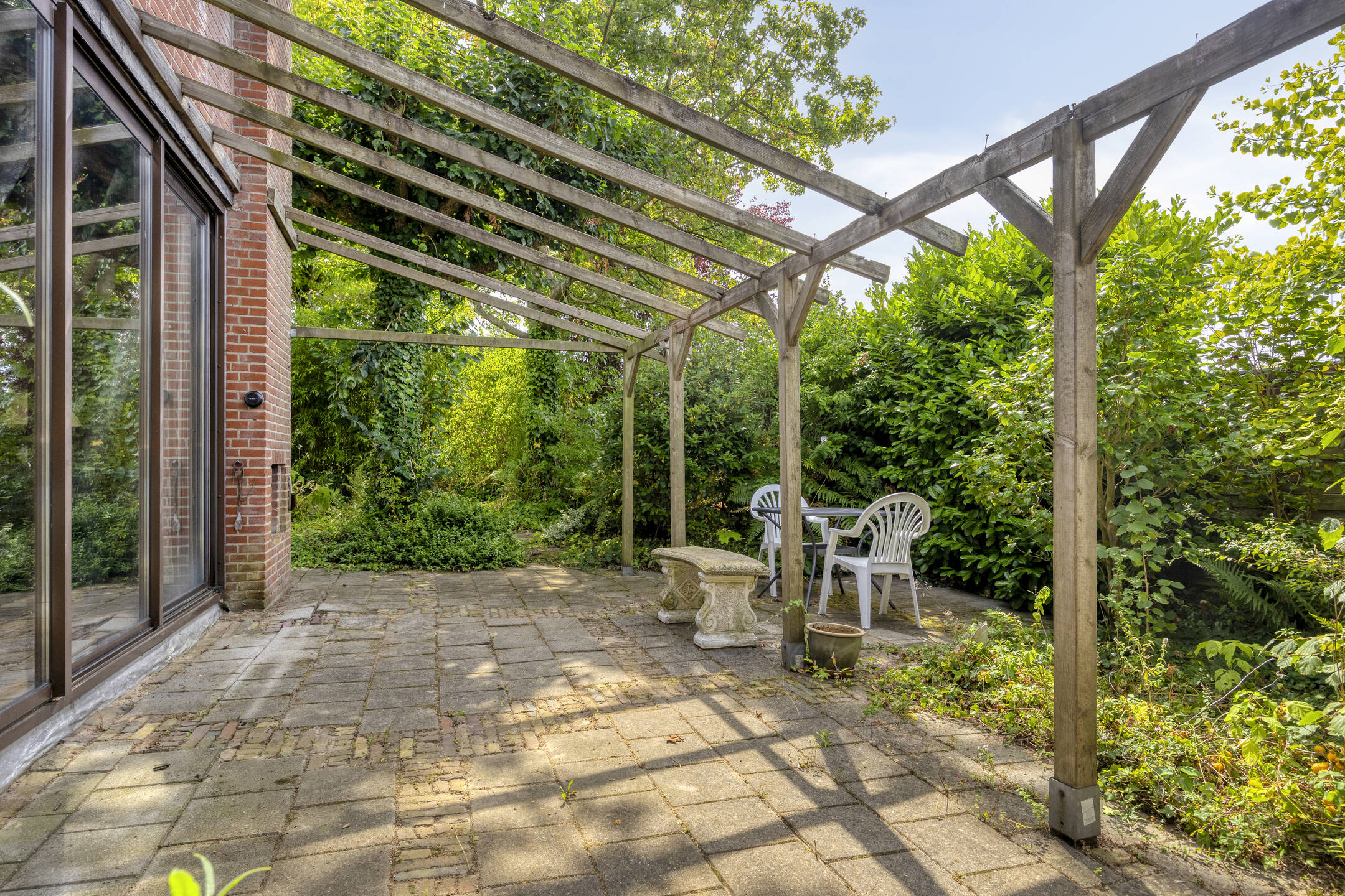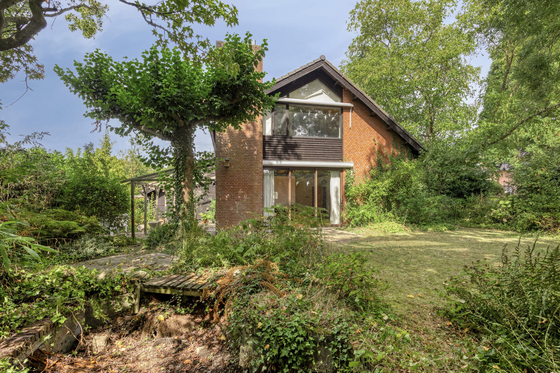 De woning wordt omgeven door een ruime, groene tuin die veel privacy biedt. Aan de voorzijde bevindt zich een grote carport met ruimte voor twee auto’s.