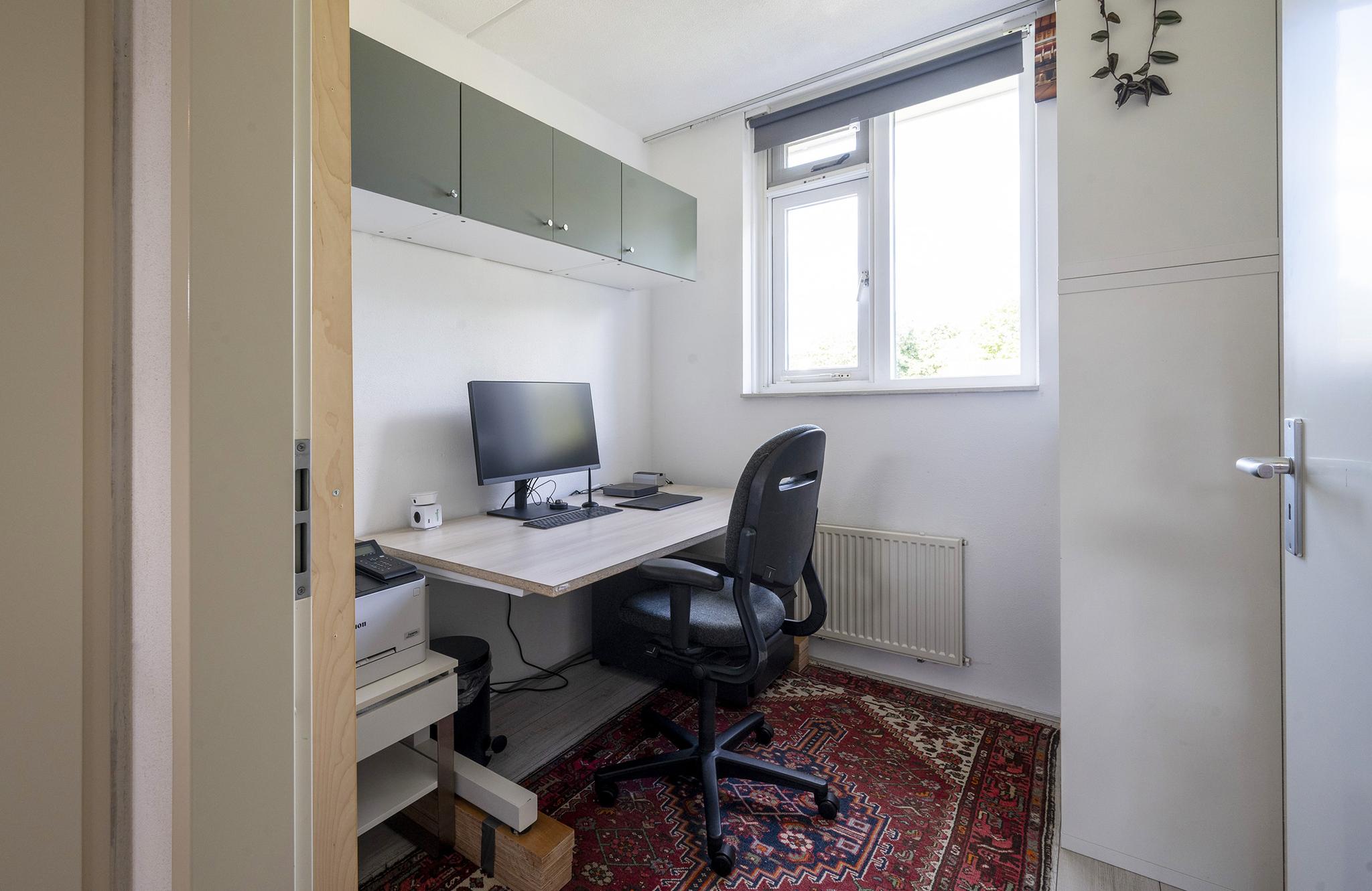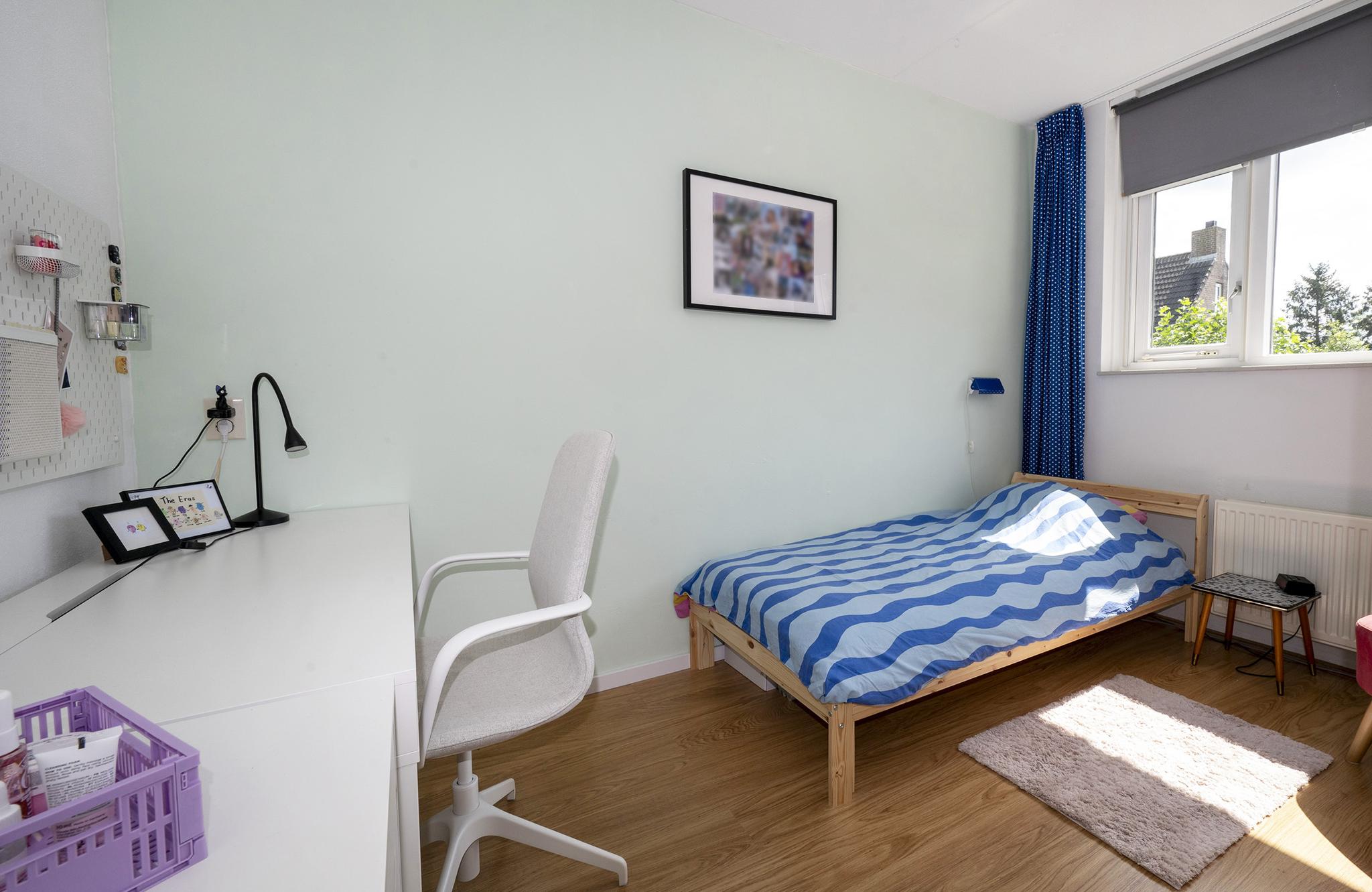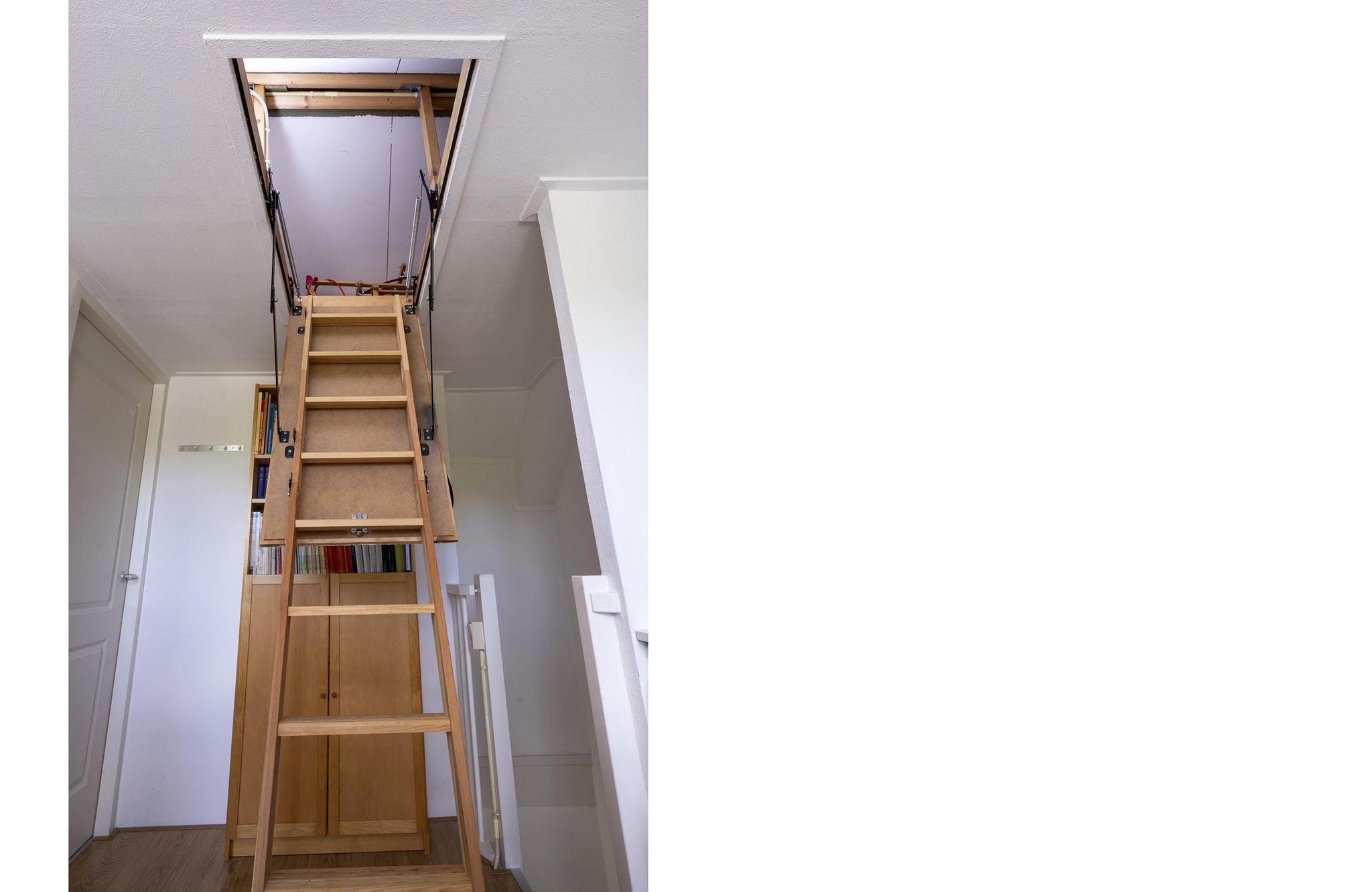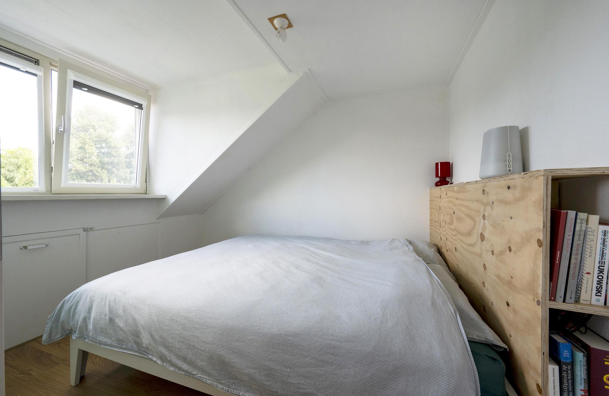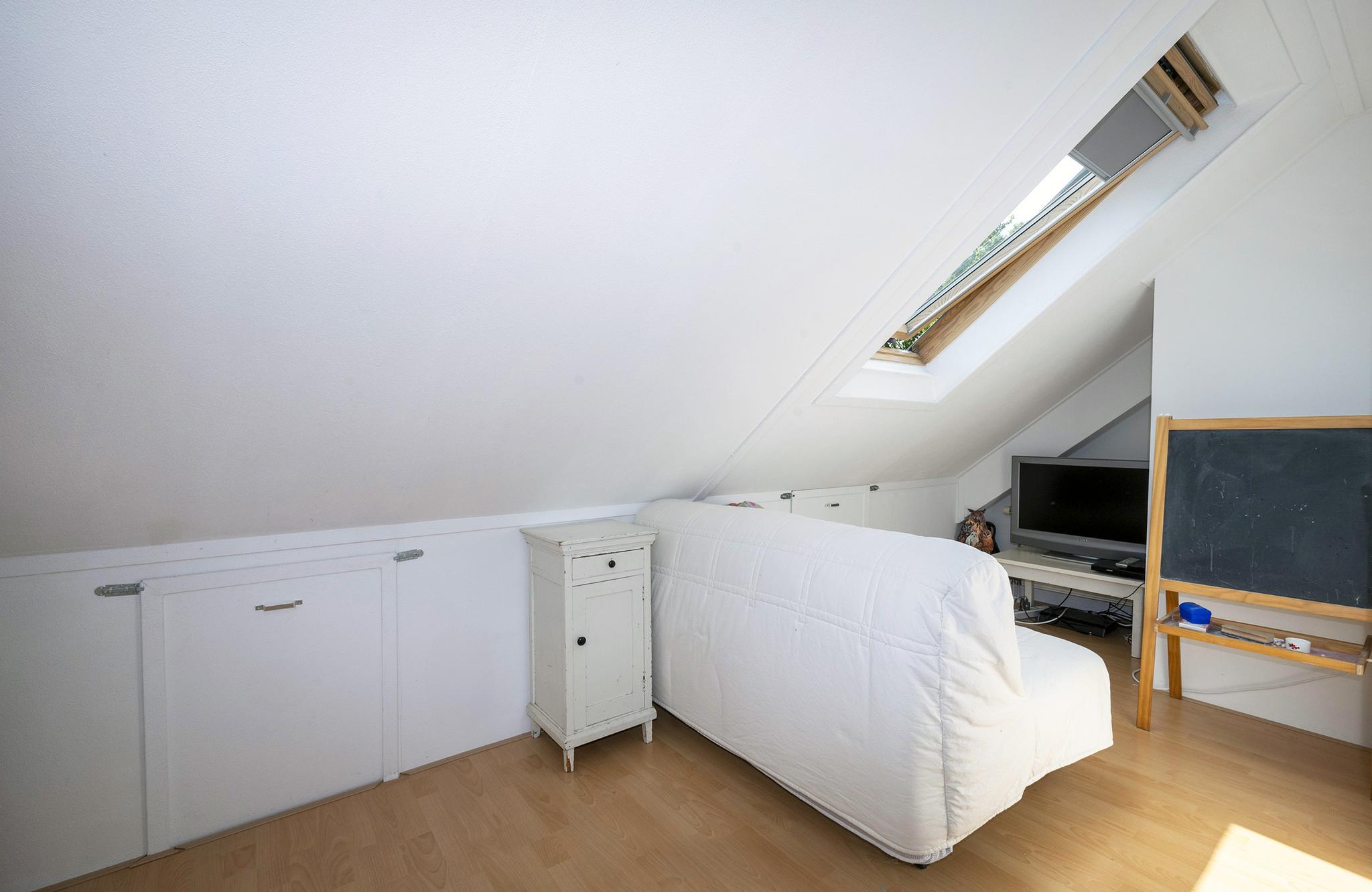 Aan de tuinkant is een fijne kamer met een dakkapel die over de hele breedte van de woning loopt. Aan de voorzijde is een L-vormige slaapkamer met een dakraam en toegang naar de vliering middels een vlizotrap.