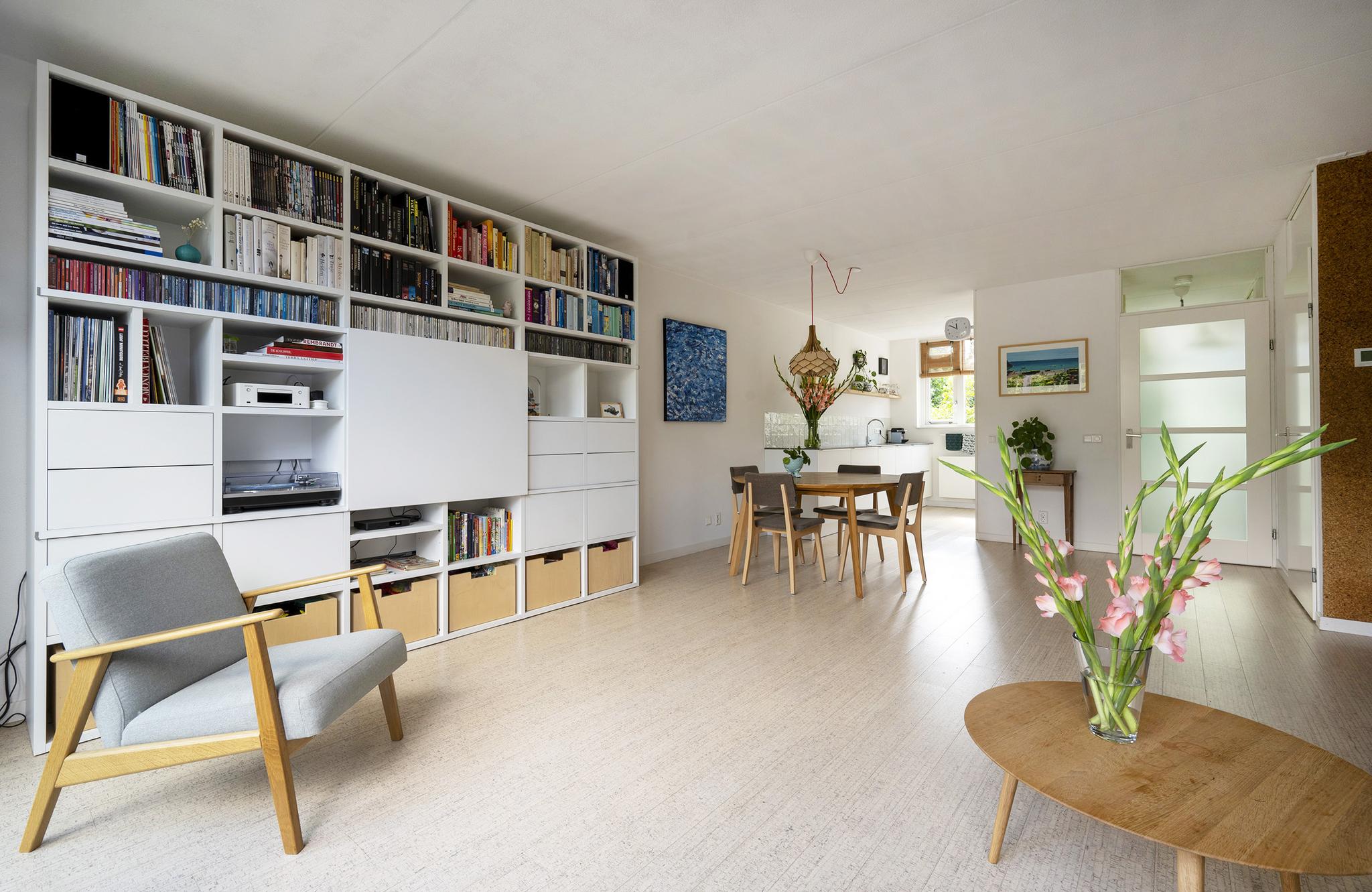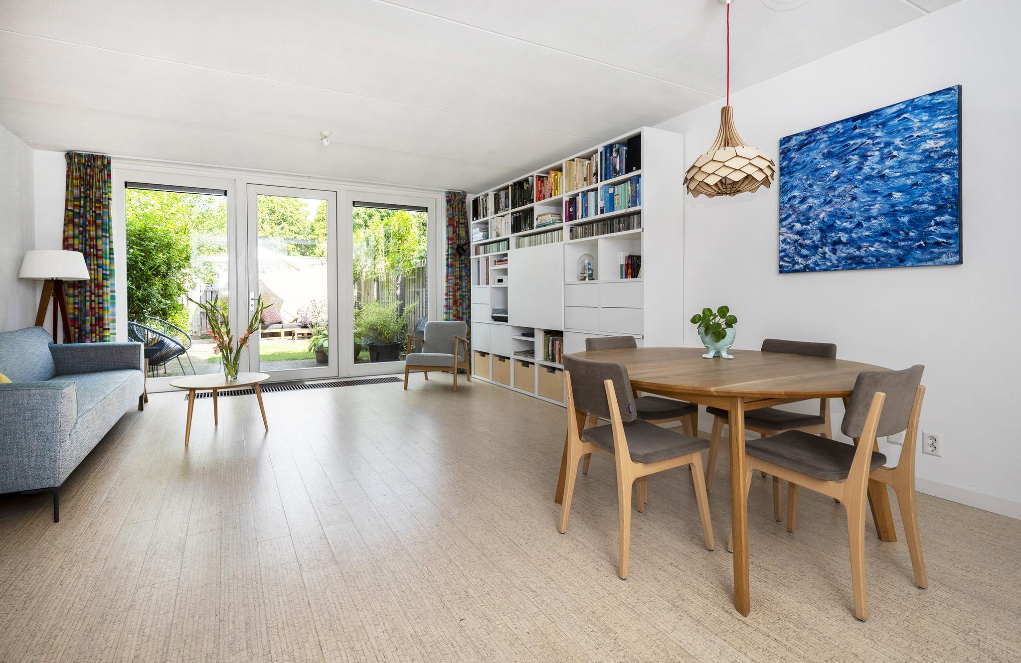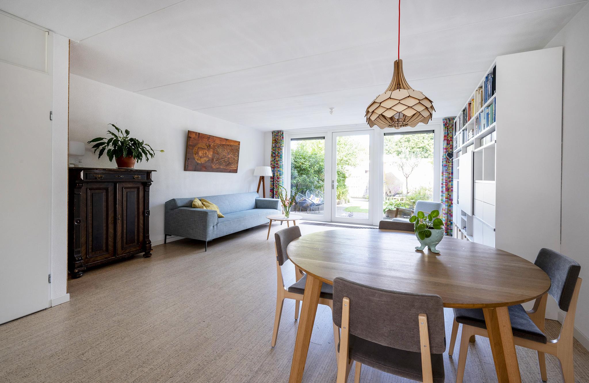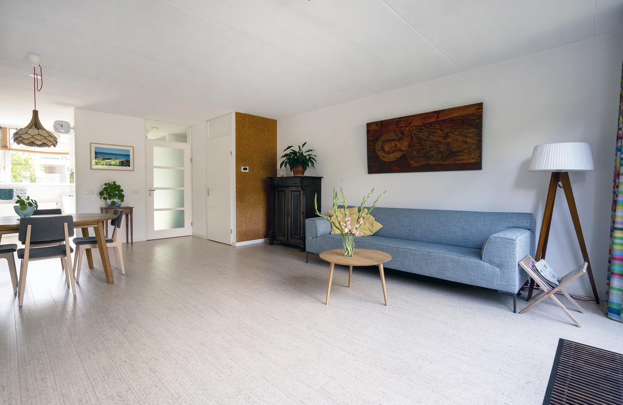 De lichte woonkamer heeft een mooie neutrale kurkvloer, een praktische trapkast en een openslaande deur naar de tuin.