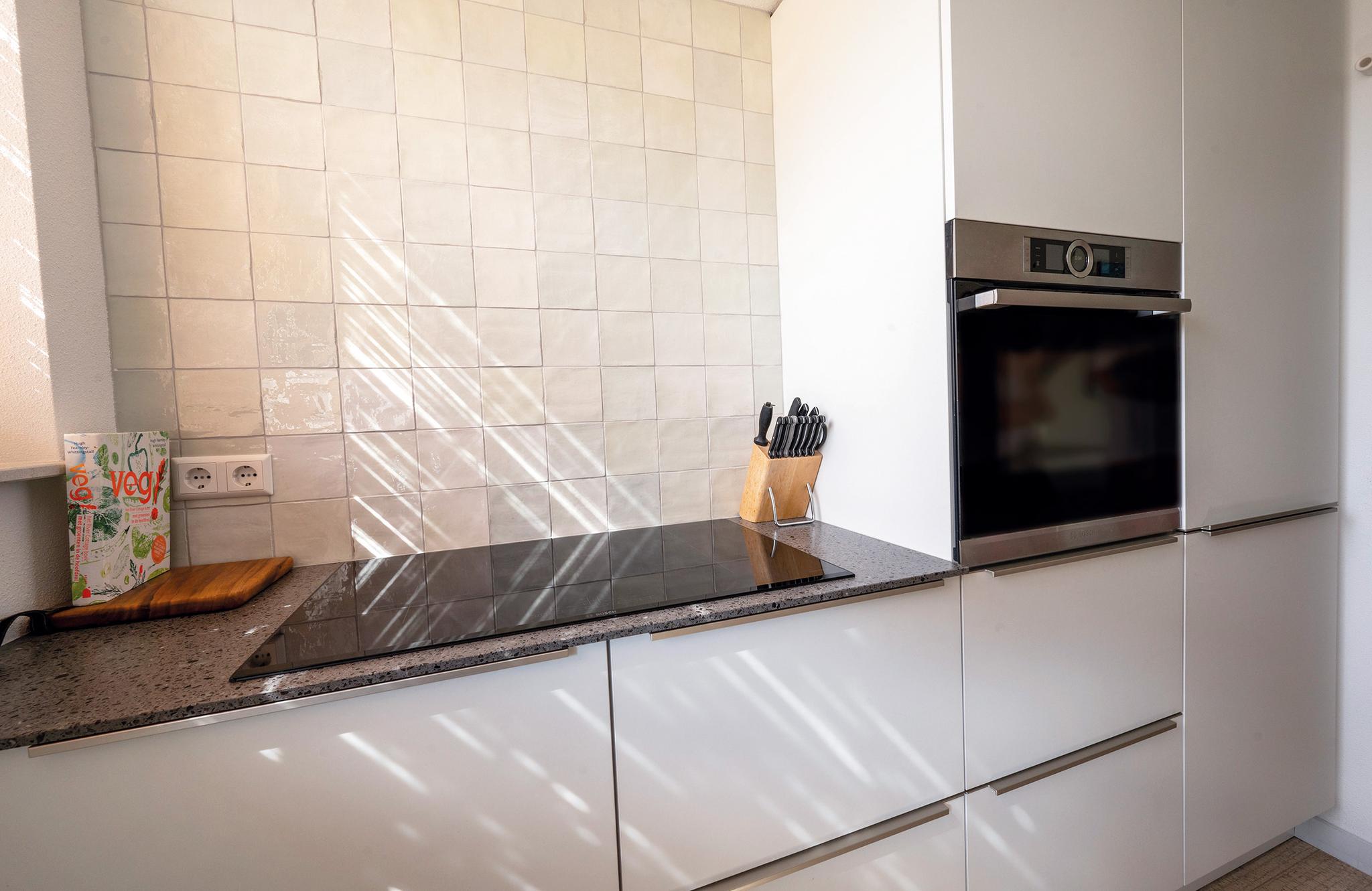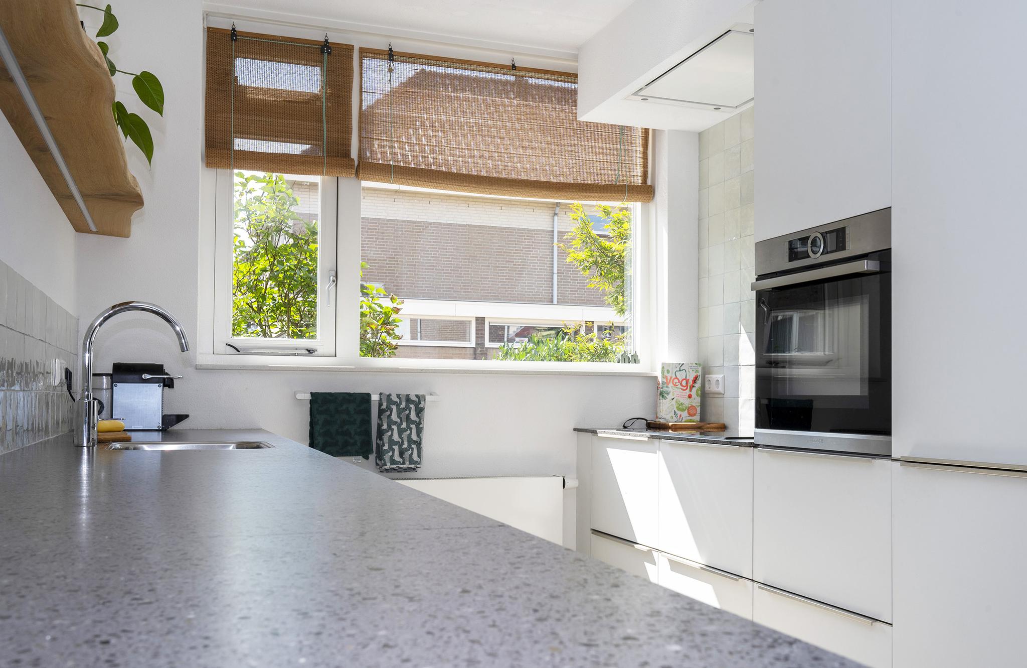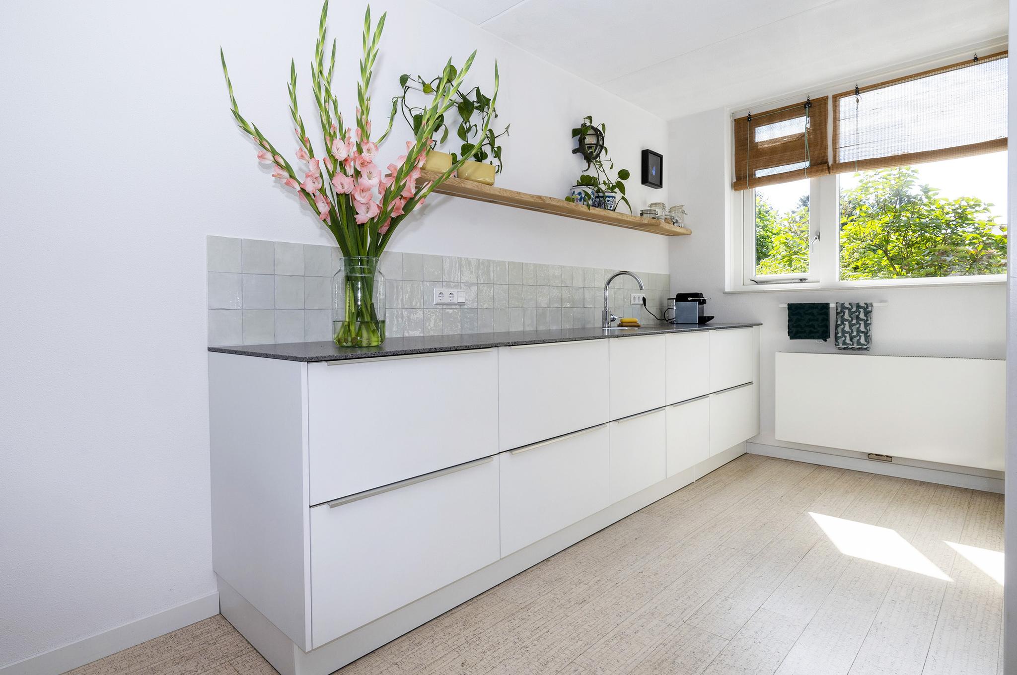 Aan de voorzijde van de woning is de in 2020 geplaatste L-vormige luxe keuken. Deze is voorzien van veel bergruimte en inbouwapparatuur (inductiekookplaat, combi-magnetron/oven, koelkast, vriezer en vaatwasser) en afgewerkt met fraaie tegels en wandplank.