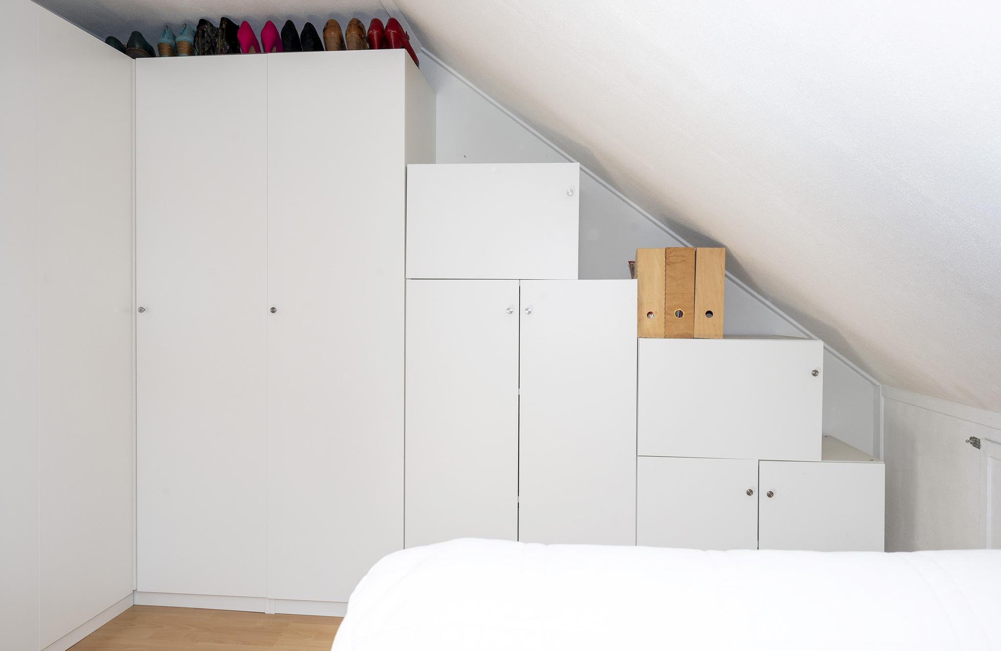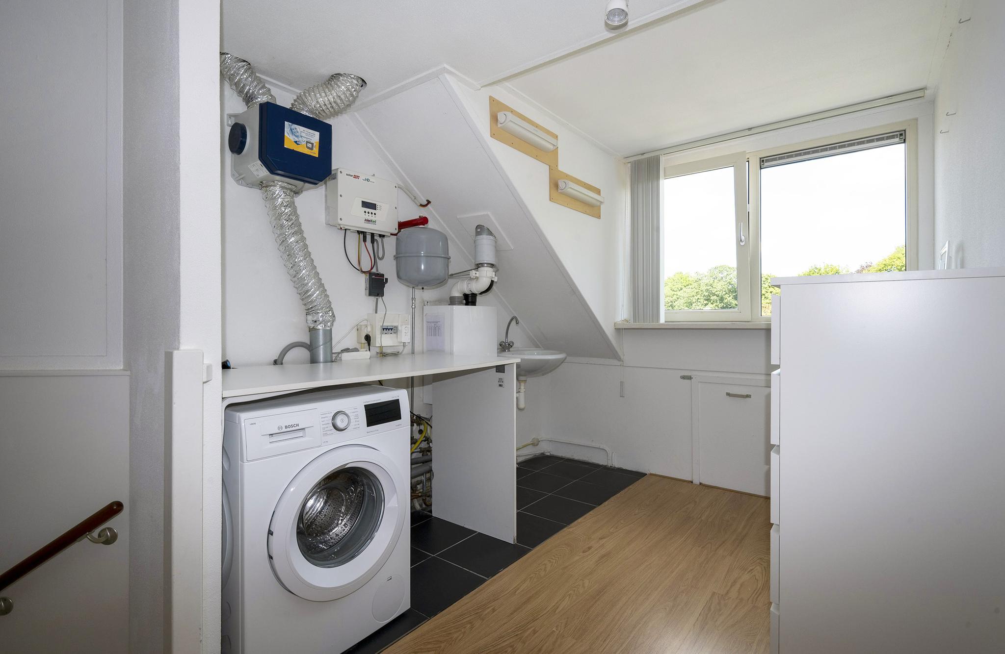 Voorzolder met de wasmachine- en c.v.-opstelling. Achter de schotten is er bergruimte.