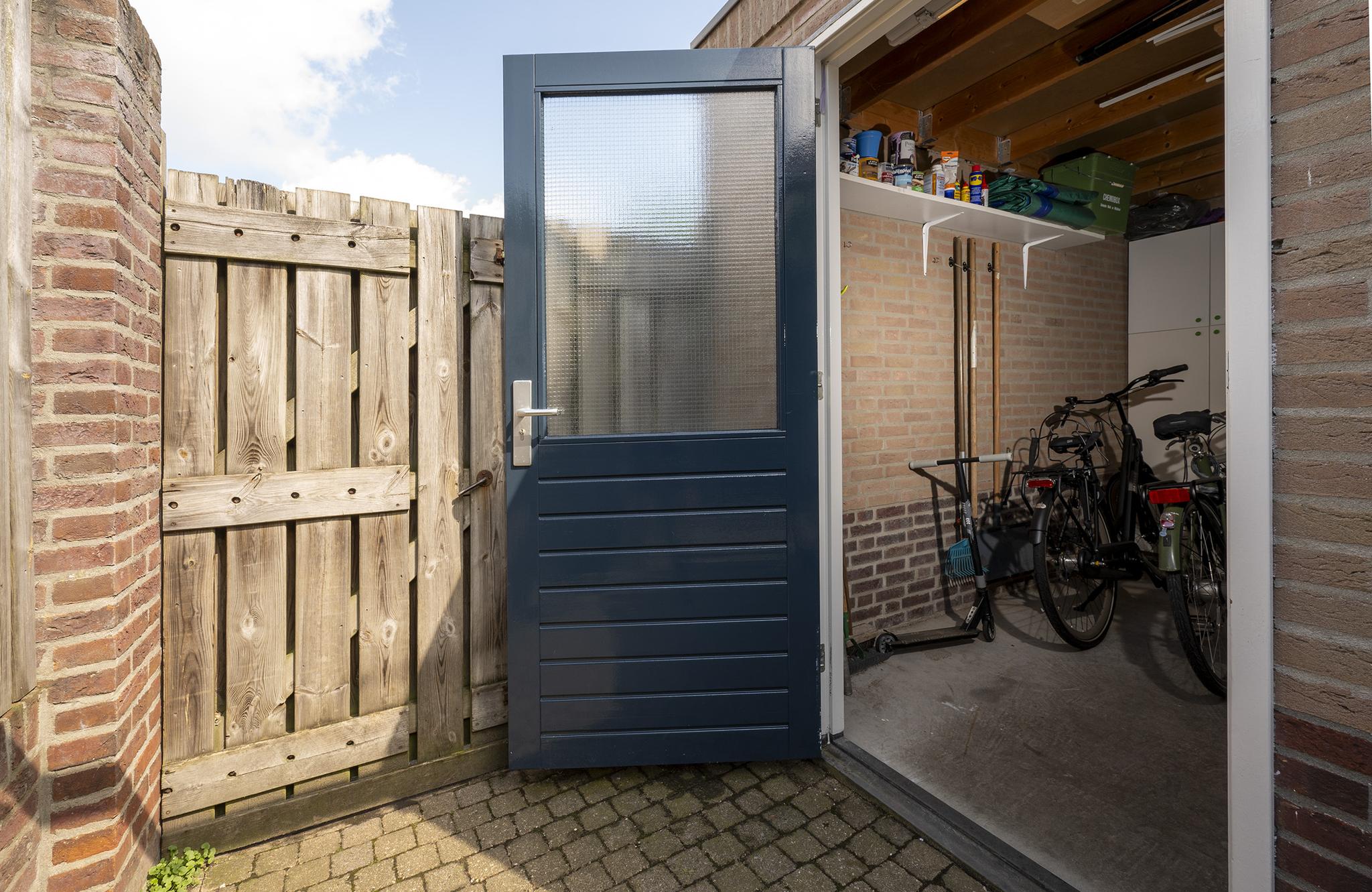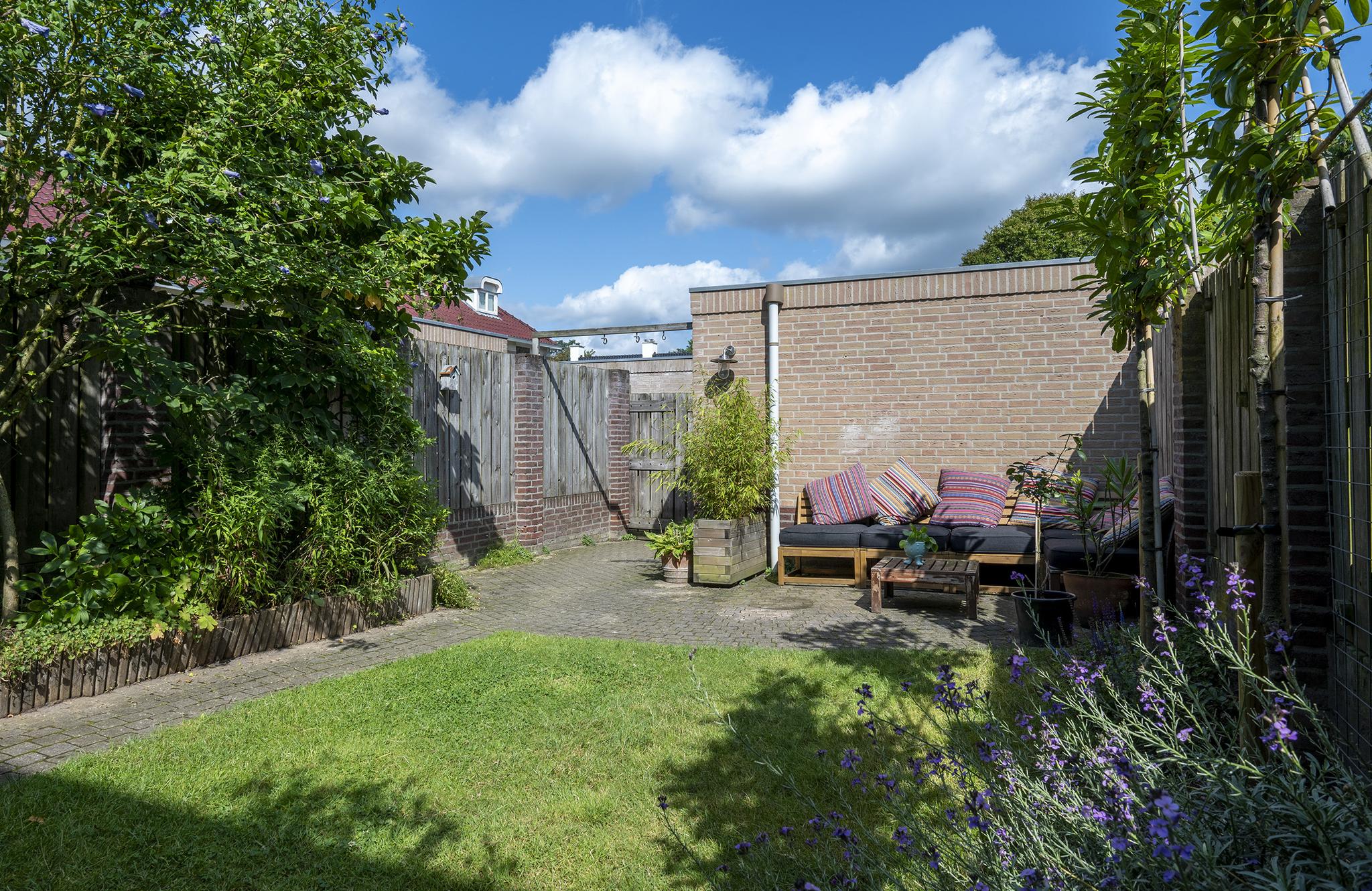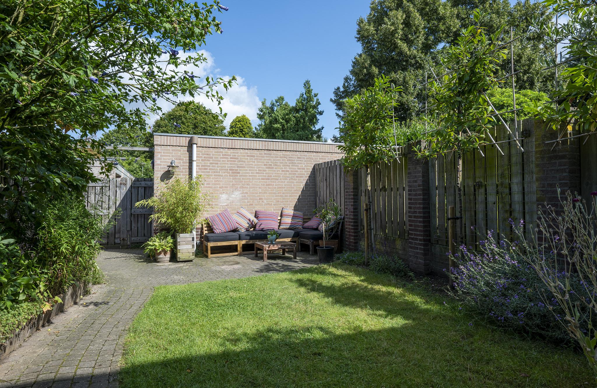 Zonnige, mooi aangelegde, achtertuin van ca. 11 X 5,30 met een vrijstaande berging en een poort naar de achterom. In de directe omgeving zijn diverse speelveldjes en is er voldoende parkeergelegenheid.