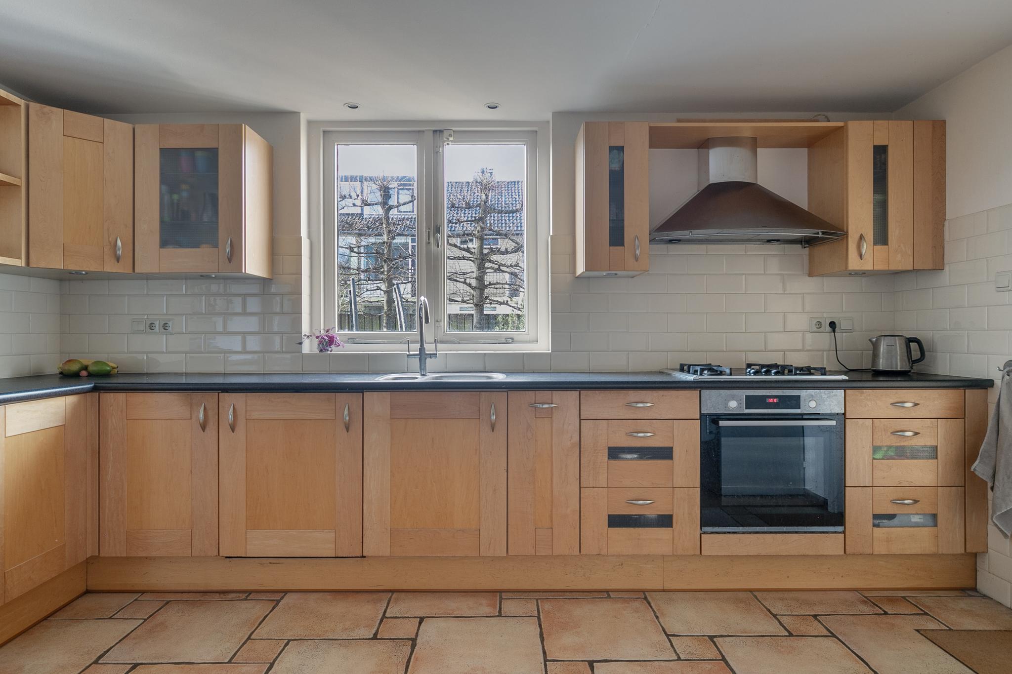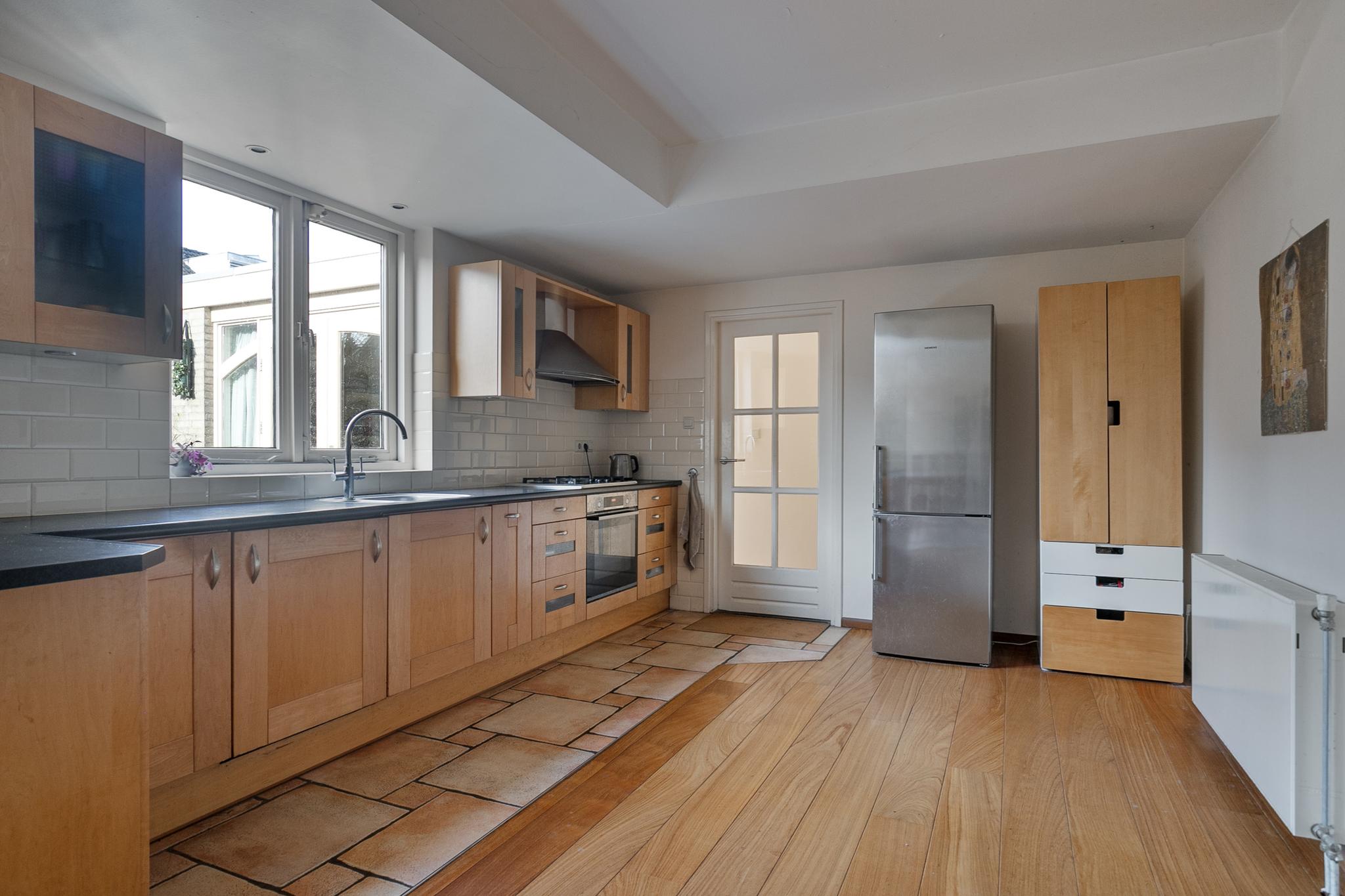 Entree met hal, modern toilet met fontein, trapkast/bergkast, riante uitgebouwde L-vormige woonkamer en een eveneens uitgebouwde open keuken. De woonkamer heeft een Afzelia parketvloer, een openhaard en dubbele deuren naar de achtertuin. De ruime keuken is voorzien van een koelkast, gaskookplaat, afzuigkap, oven en vaatwasser. Via de keuken is ook de extra kamer te bereiken. Deze mooie tuinkamer met openslaande tuindeuren, waar het heerlijk is om te genieten van de (vroege) voor-/ najaarszon, is een ideale verblijfsruimte voor grotere kinderen of een werkkamer voor een praktijk aan huis. Tot slot is er hier ook een deur naar de berging aan de voorzijde.