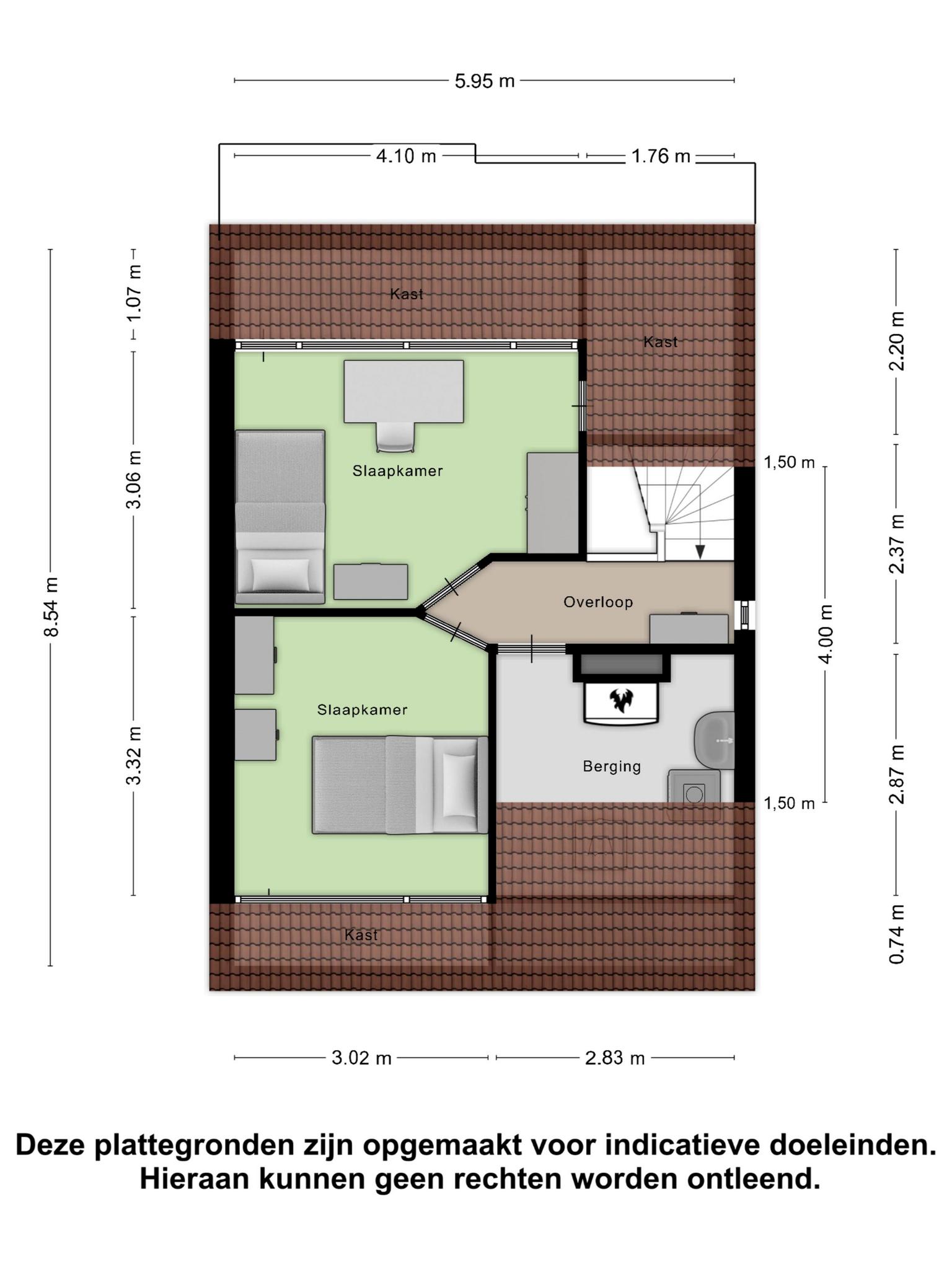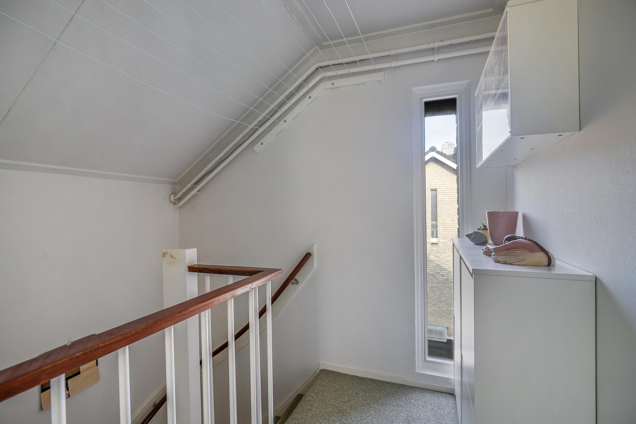2e verdieping: overloop en bergruimte met aansluitingen voor de wasmachine en droger en de opstelling van de CV-ketel. Verder zijn er twee volwaardige slaapkamers, beide met een dakkapel. Bergruimte zowel in knieschot als naast de slaapkamer