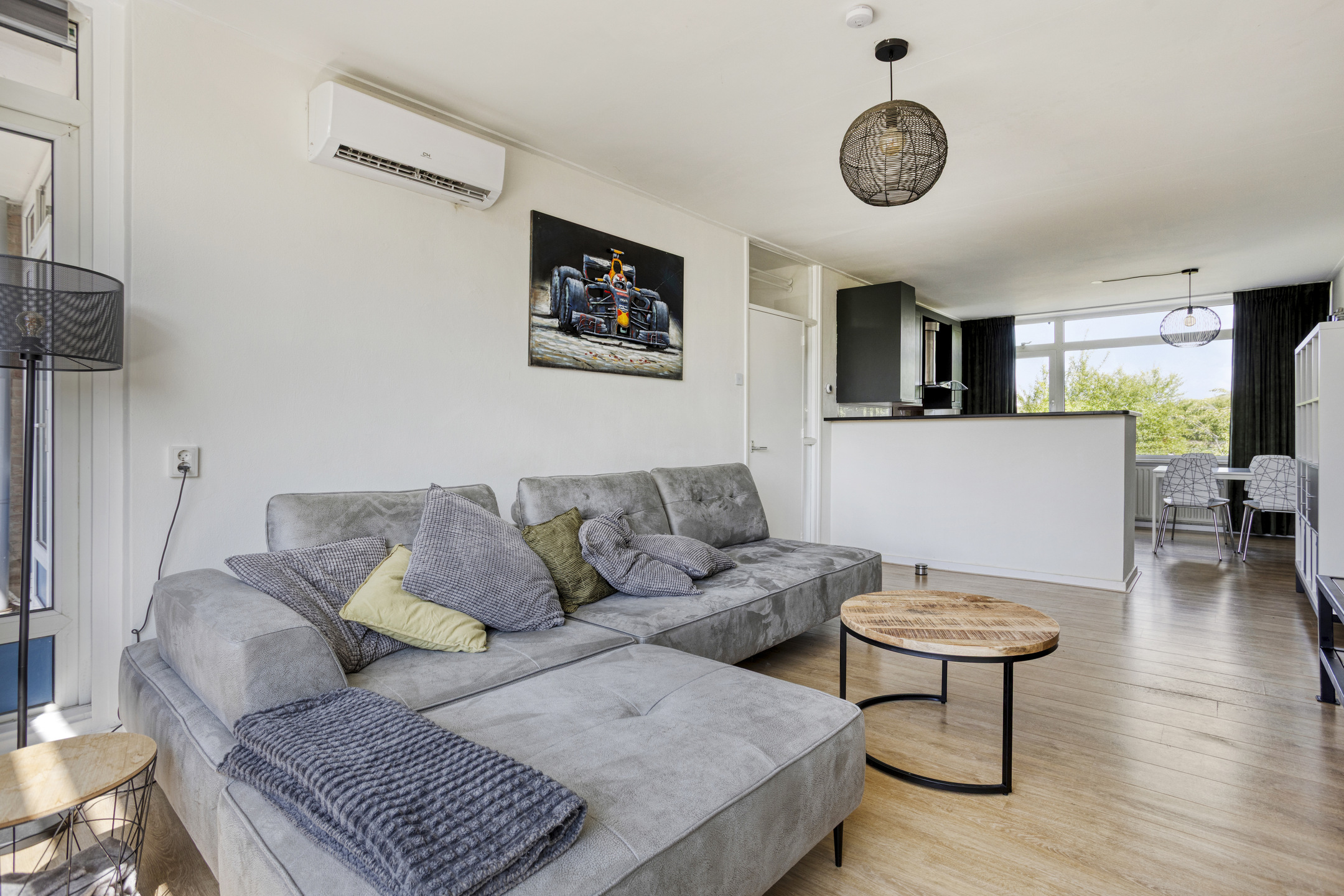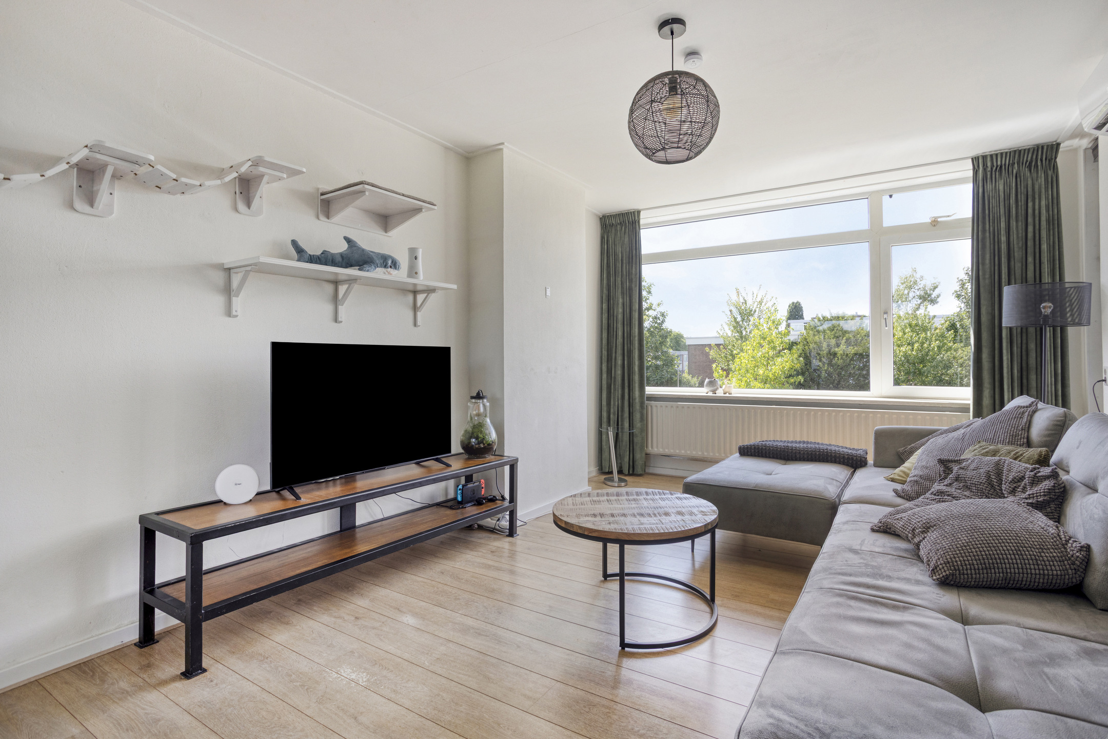 De ruime woonkamer heeft veel lichtinval door de grote ramen en beschikt over een -thans niet in gebruik zijnde- deur naar het balkon.
