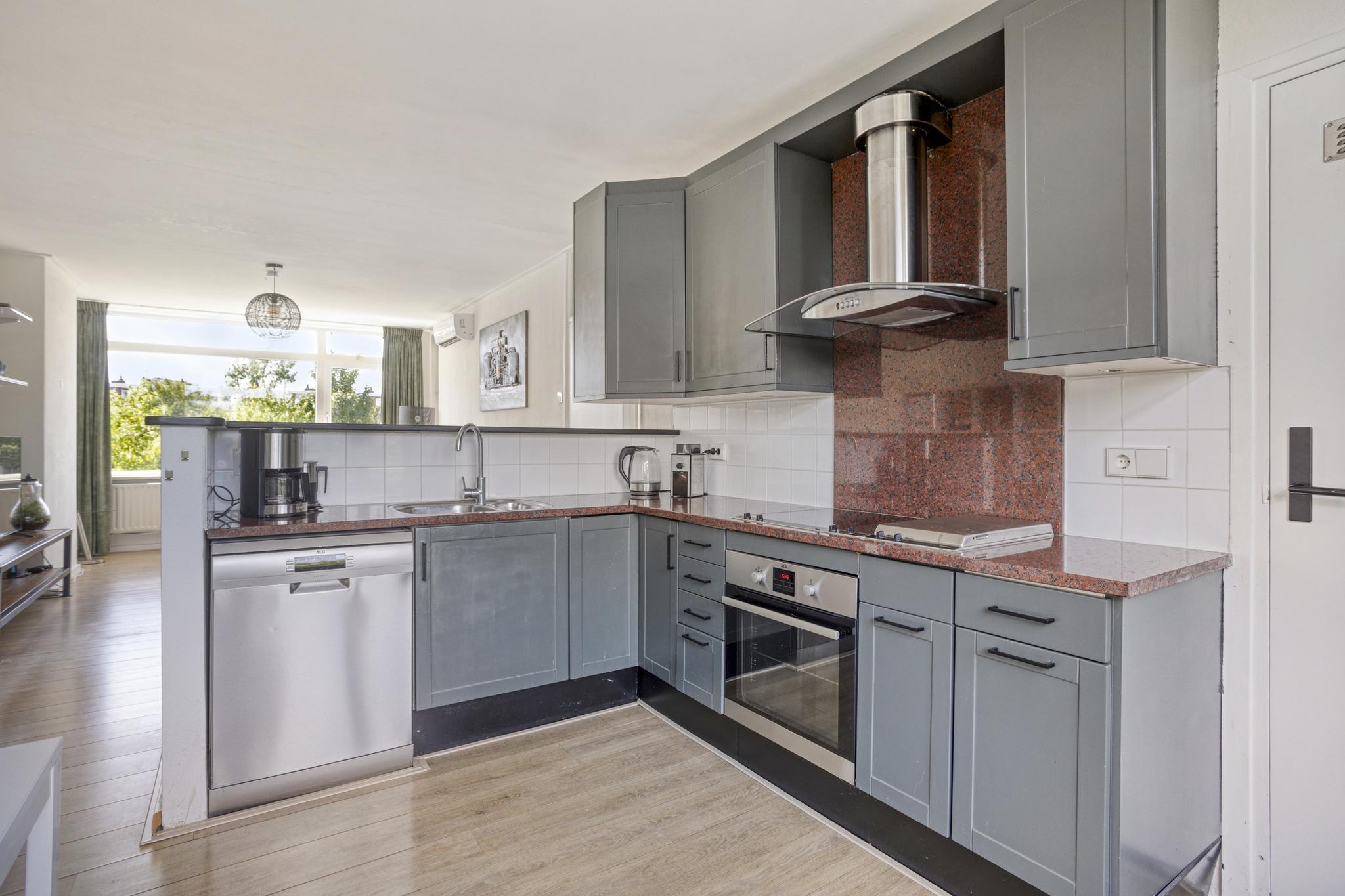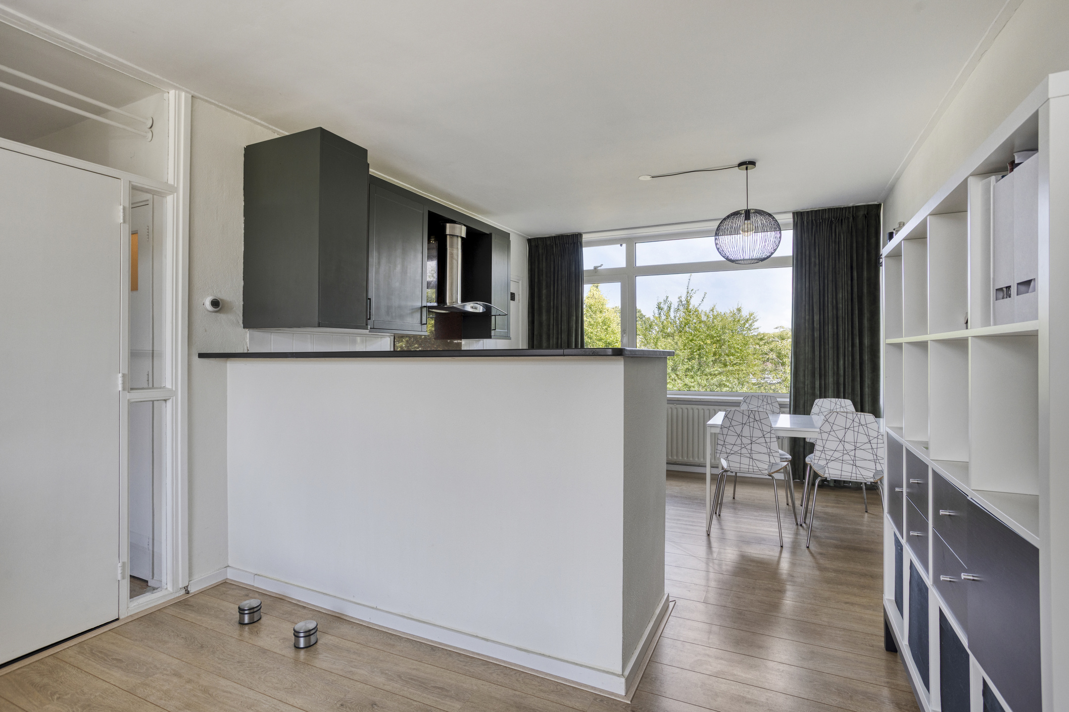 De keuken (jaartal onbekend) met nieuwe oven is in een hoekopstelling geplaatst waardoor deze een speels half-open karakter heeft en een mooie verdeling maakt van woon- en eetkamer. Aangrenzend is een vaste provisiekast met c.v.-ketel.