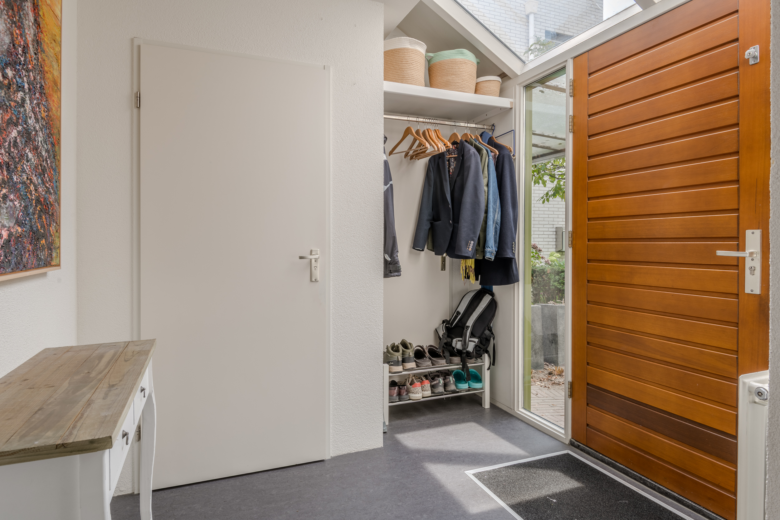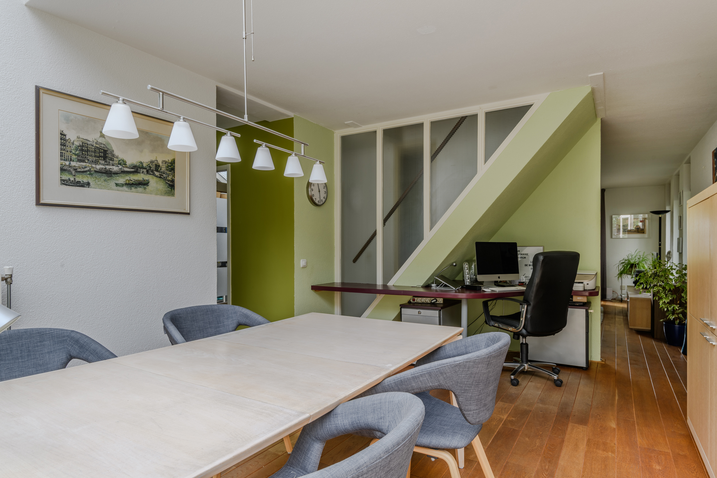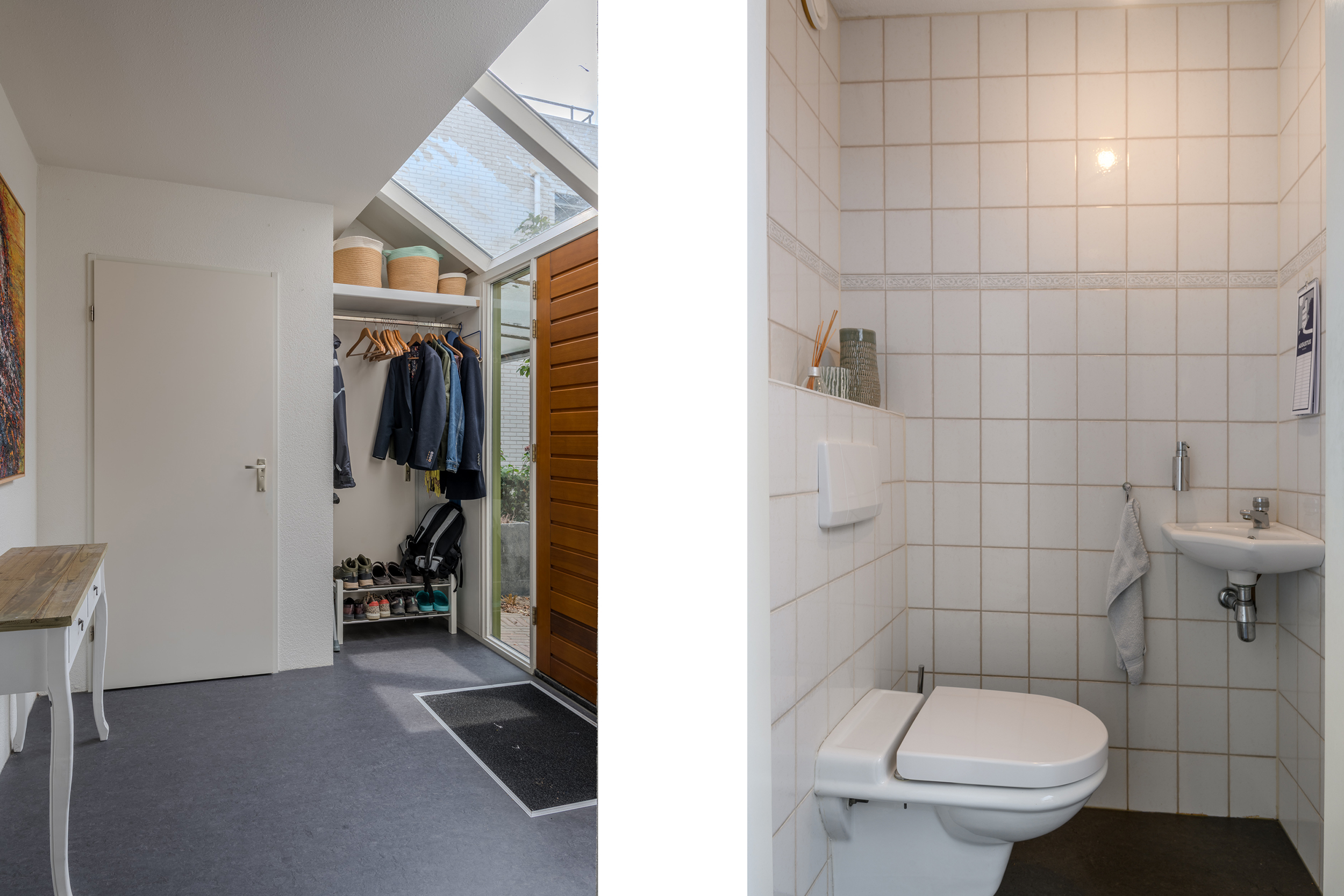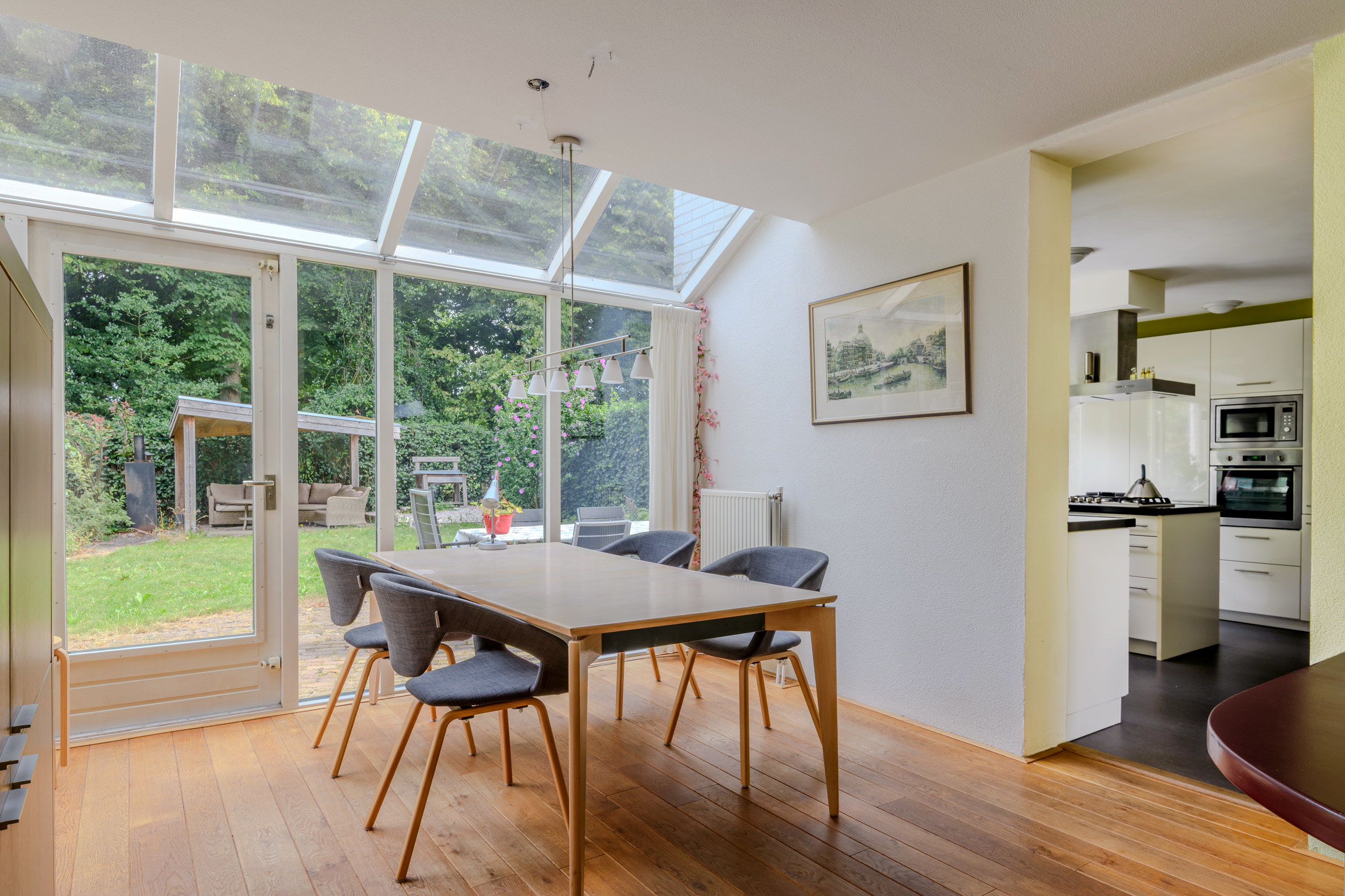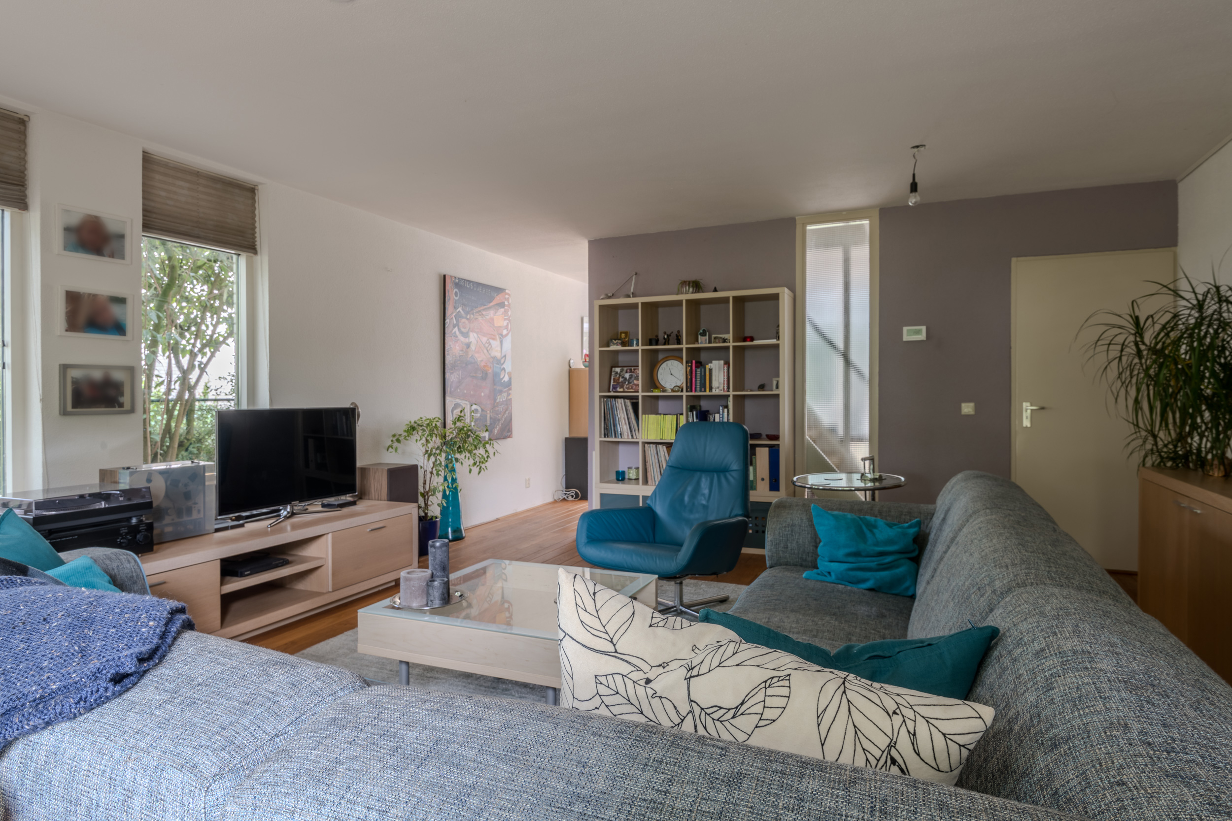 Binnenkomst via een royale entree met stijlvolle marmoleumvloer, garderobe, meterkast en een ruim toilet. De lichte, ruime woonkamer heeft een warme uitstraling dankzij de massief houten vloer en grote schuifpui. Aan de achterzijde bevindt zich de eetkamer met werkhoek en toegang tot de tuin. De moderne keuken (2015) is royaal opgezet in U-vorm en beschikt over een kastenwand, inbouwapparatuur en een eigen buitendeur.