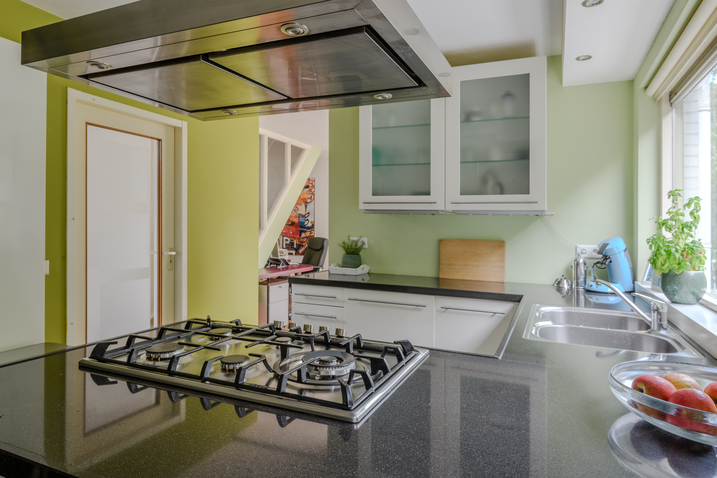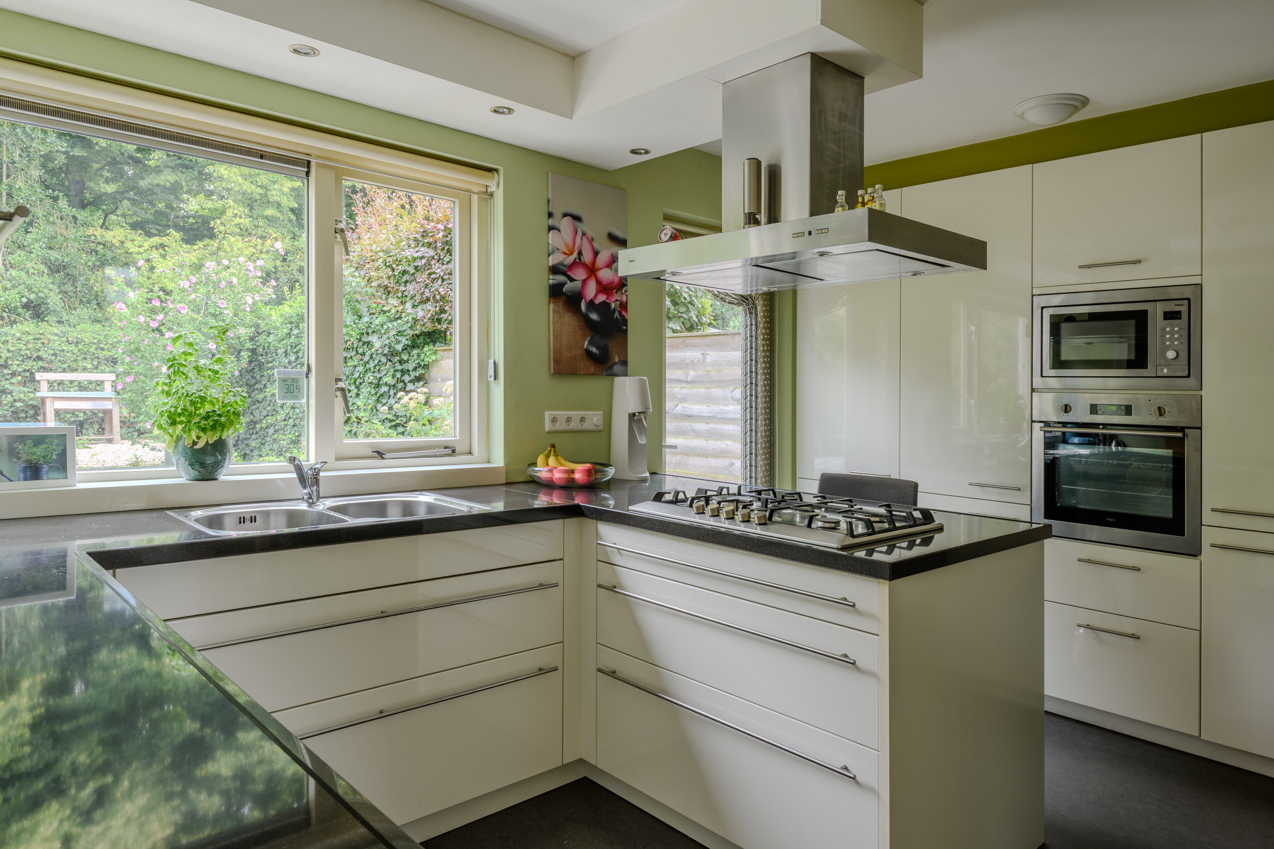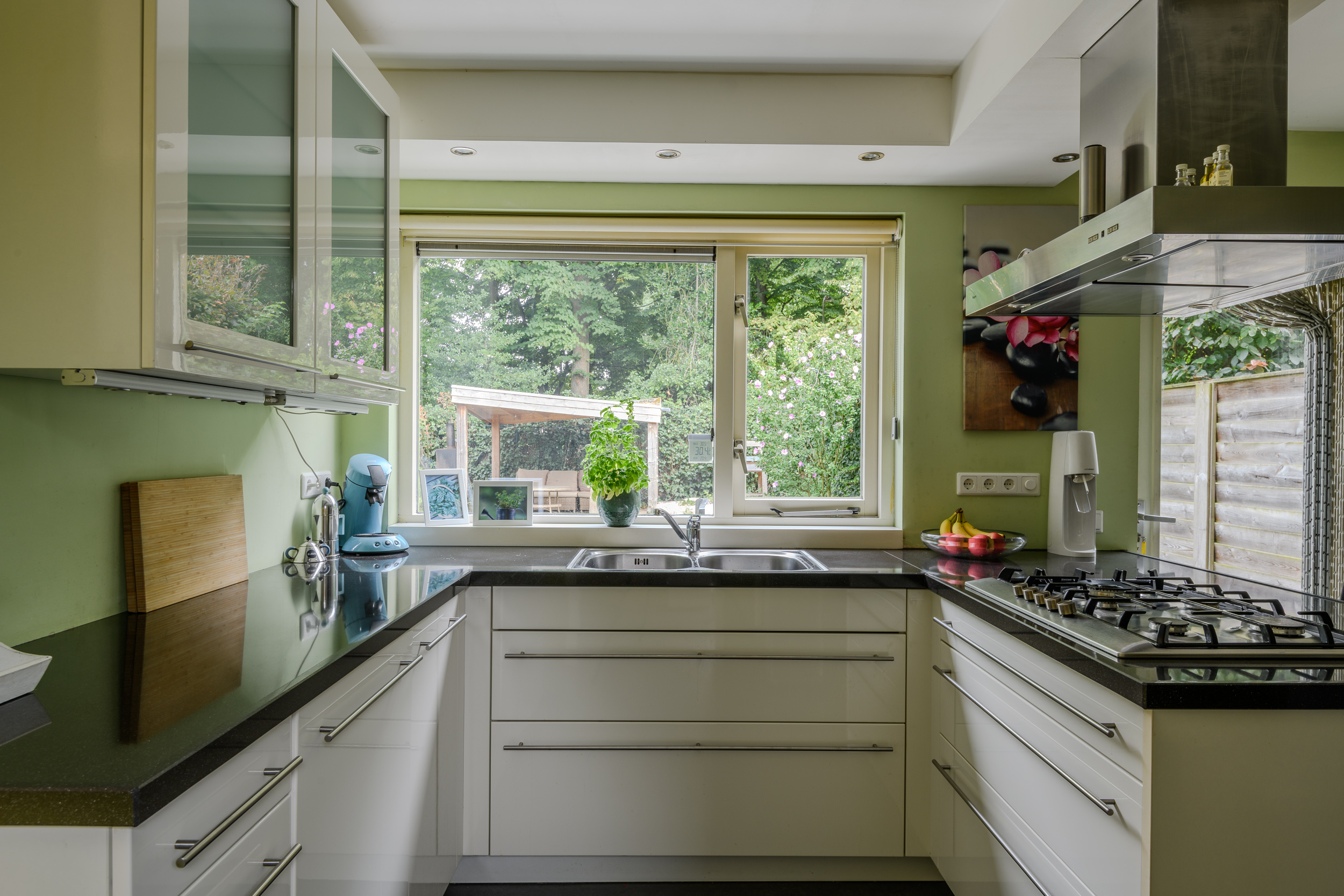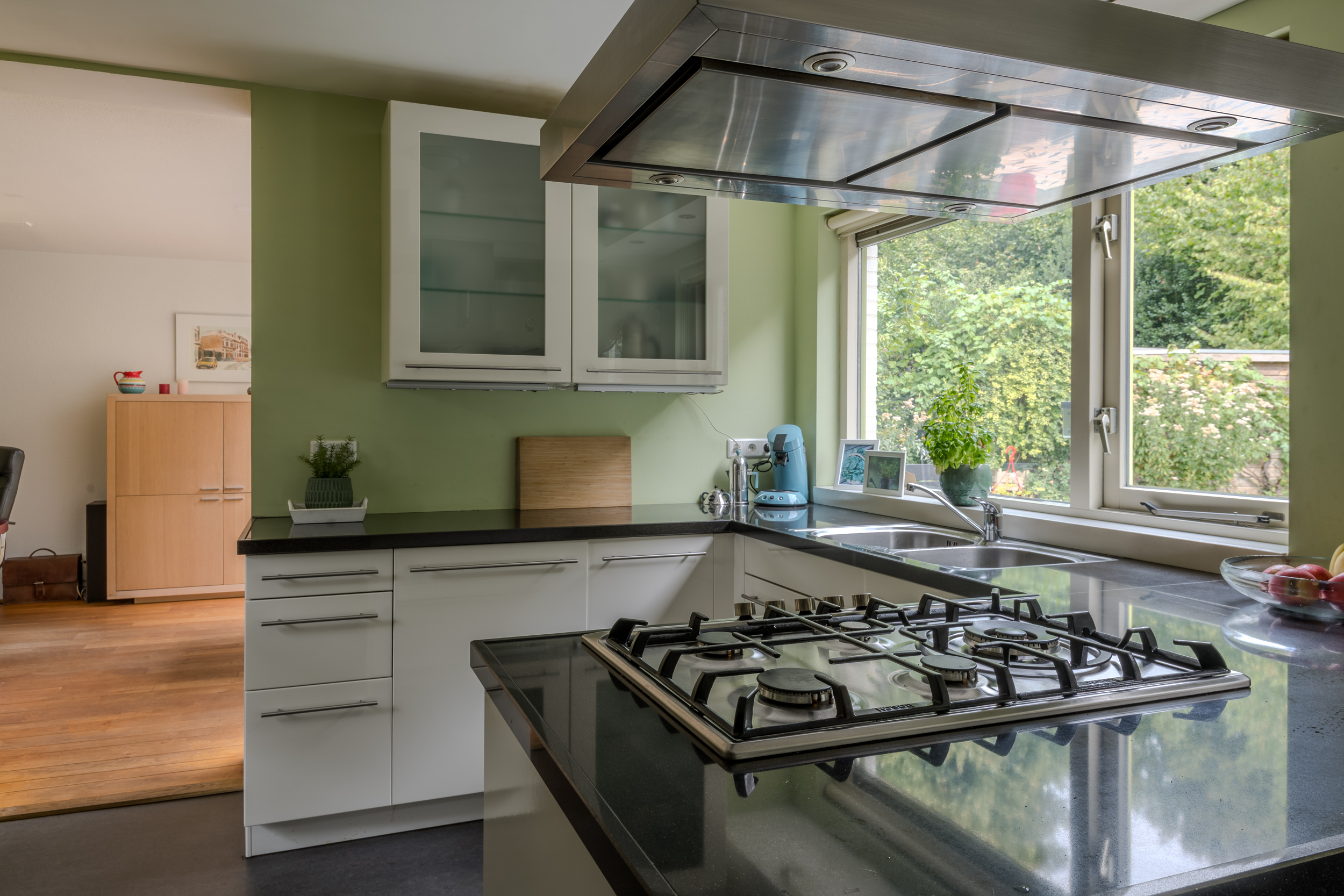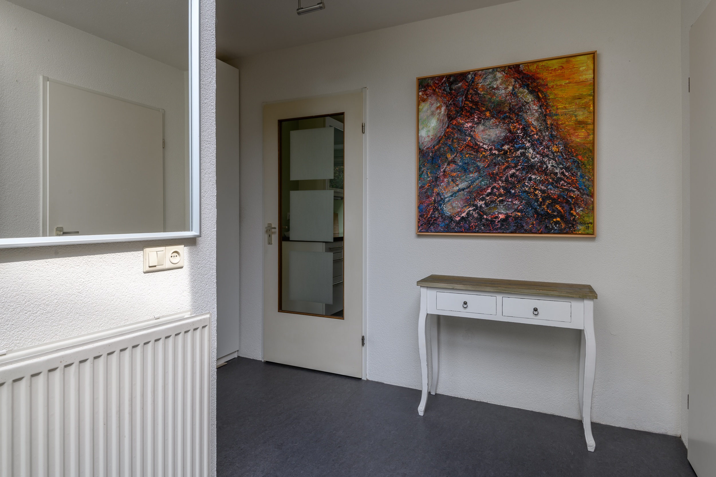 Binnenkomst via een royale entree met stijlvolle marmoleumvloer, garderobe, meterkast en een ruim toilet. De lichte, ruime woonkamer heeft een warme uitstraling dankzij de massief houten vloer en grote schuifpui. Aan de achterzijde bevindt zich de eetkamer met werkhoek en toegang tot de tuin. De moderne keuken (2015) is royaal opgezet in U-vorm en beschikt over een kastenwand, inbouwapparatuur en een eigen buitendeur.