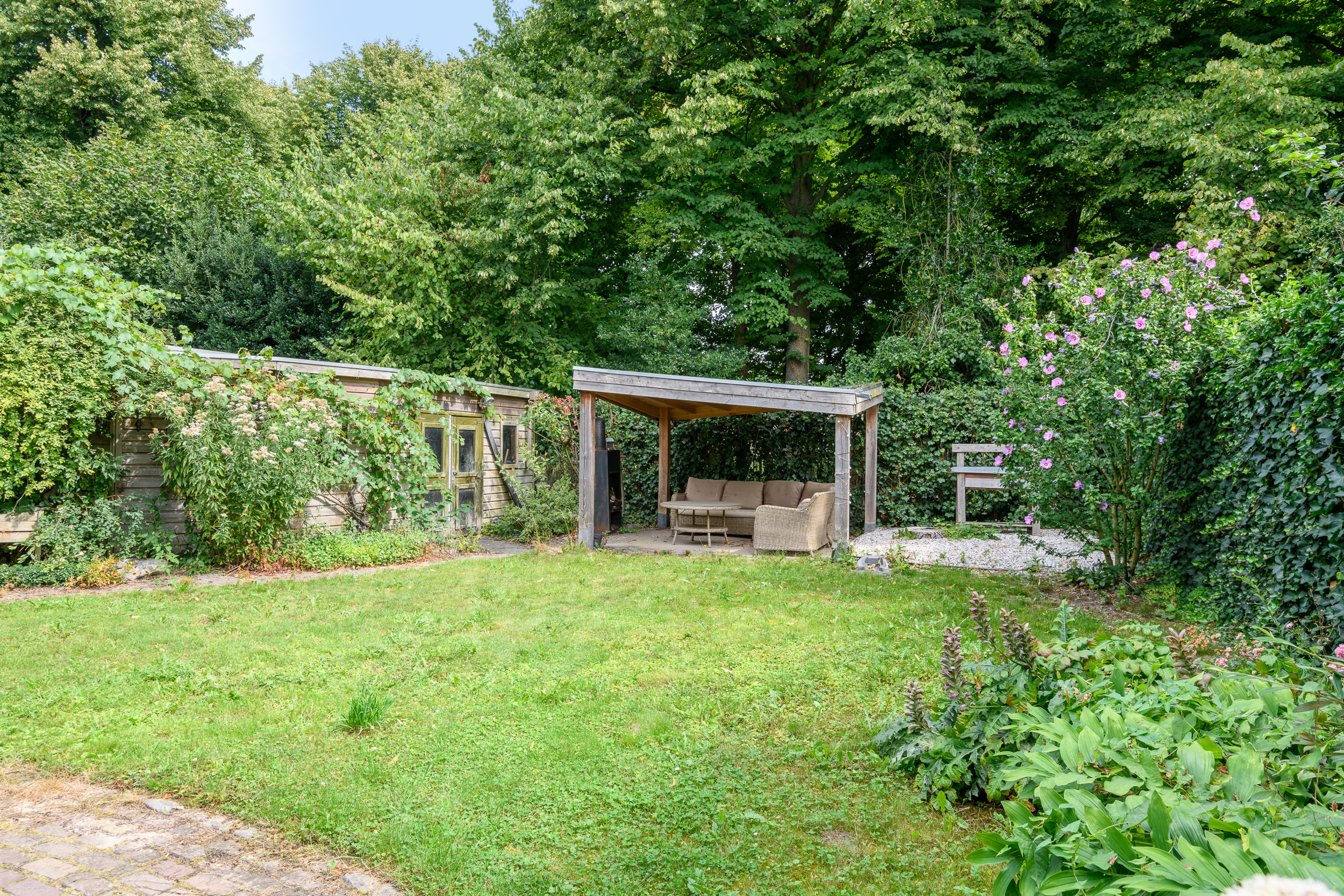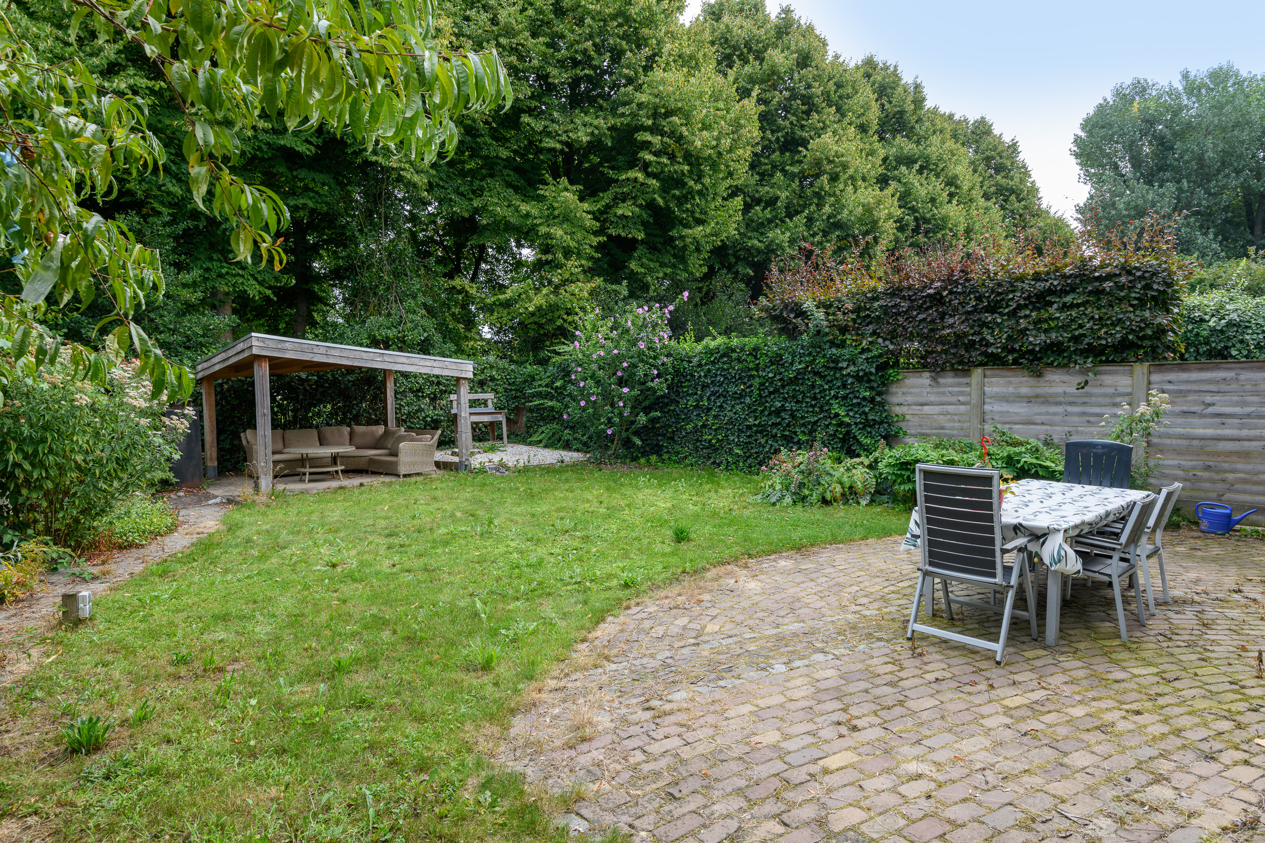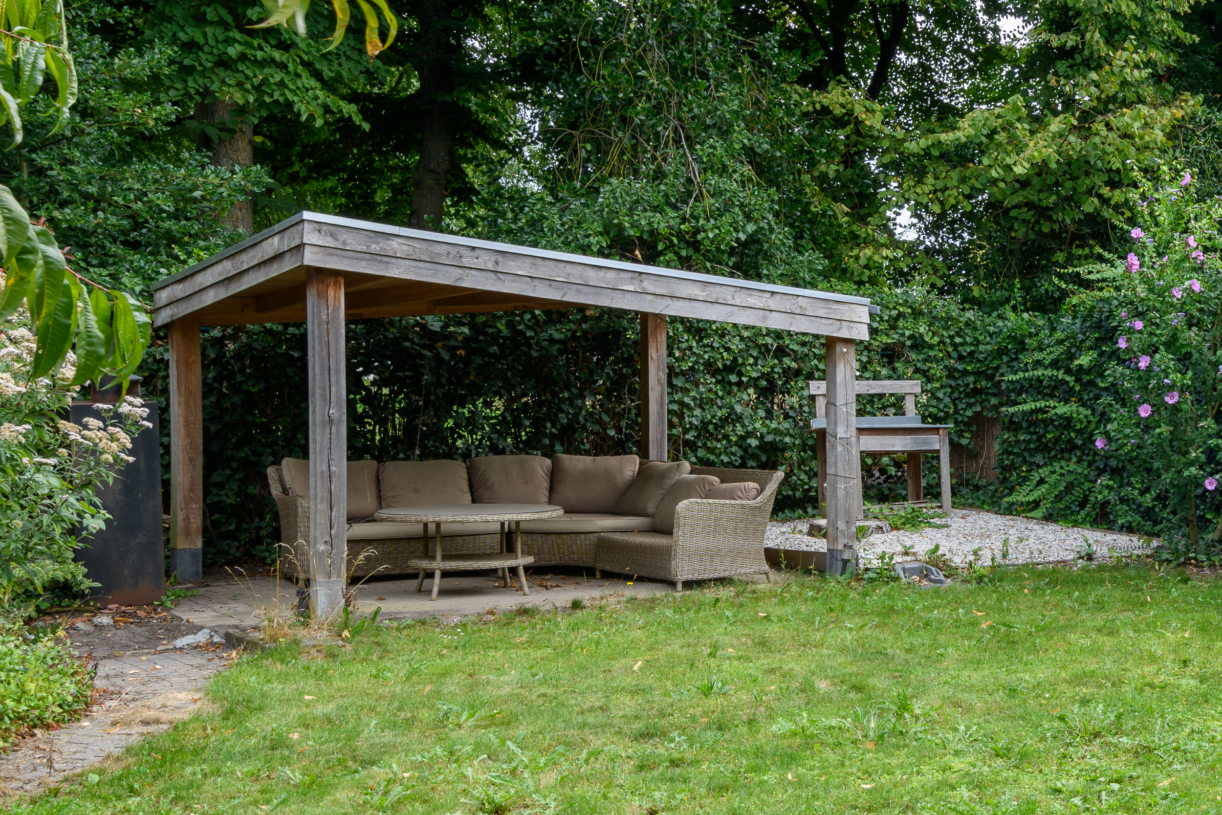 De fraai aangelegde achtertuin op het noordoosten biedt volop privacy dankzij de volgroeide bomen en het ontbreken van directe achterburen. Met een terrasoverkapping en een eigen parkeerplaats aan de voorzijde is ook buiten alles tot in de puntjes verzorgd.