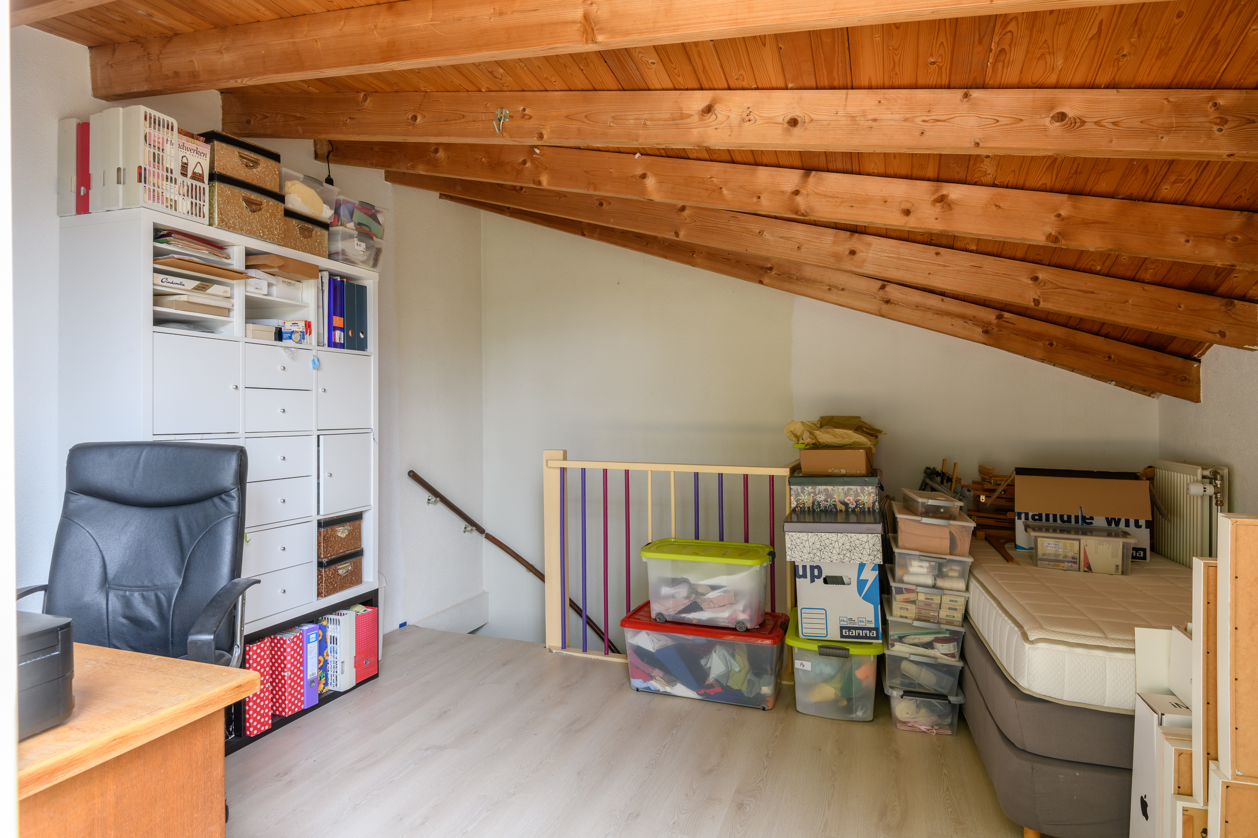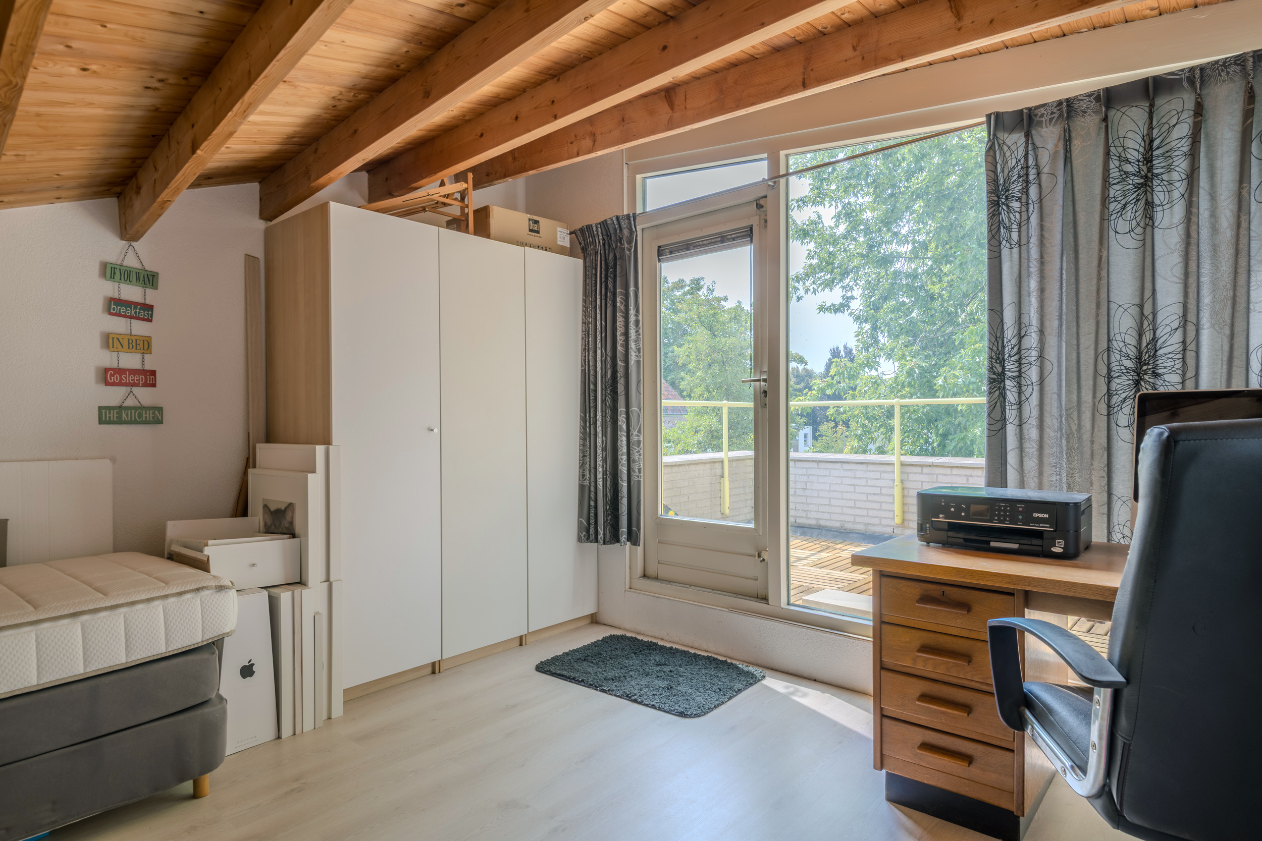Via een vaste trap bereik je een indrukwekkende zolderruimte met een karakteristiek vlinderdak en toegang tot een riant dakterras – een heerlijke plek om te ontspannen in de zon of te genieten van het uitzicht.