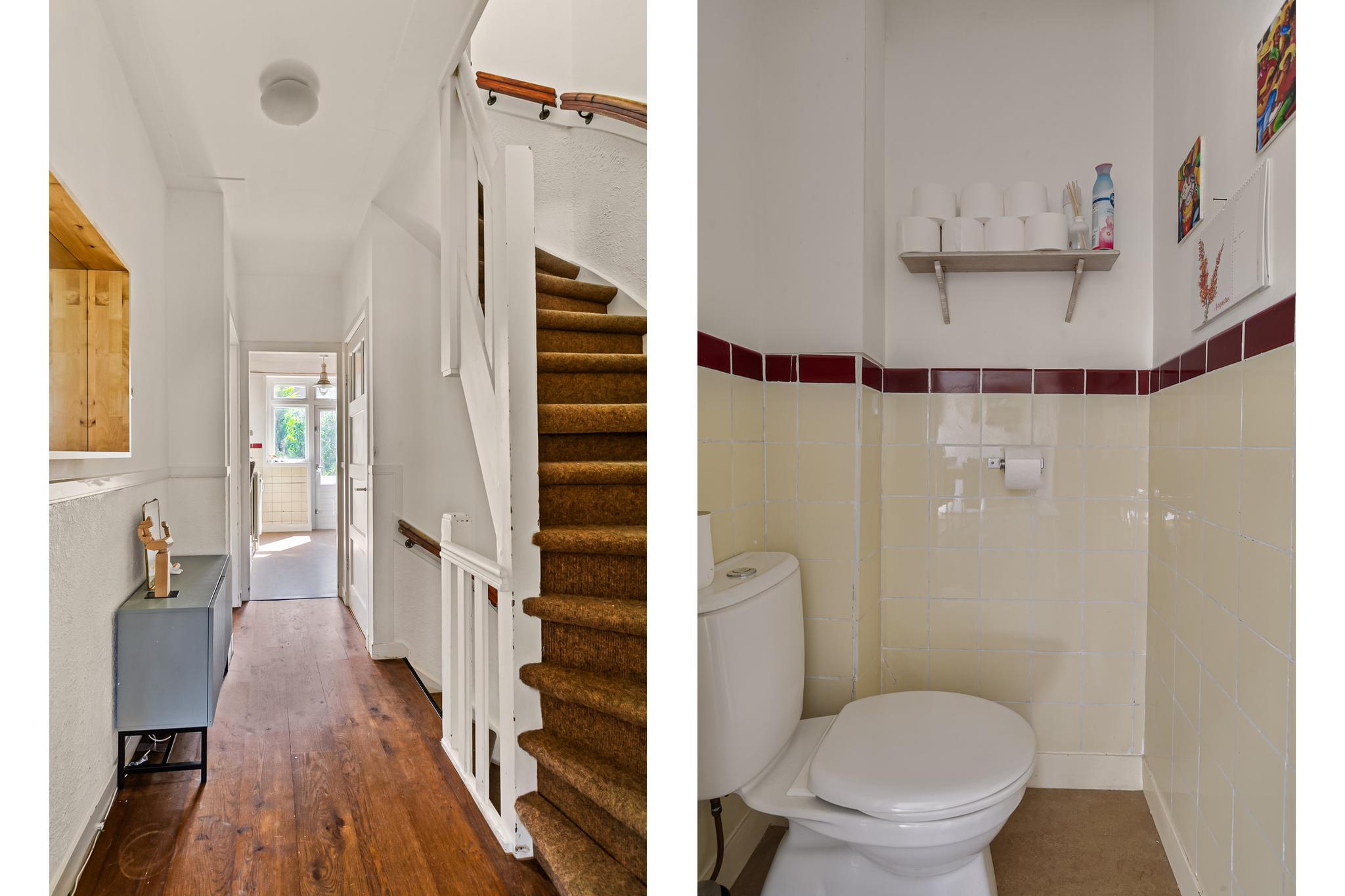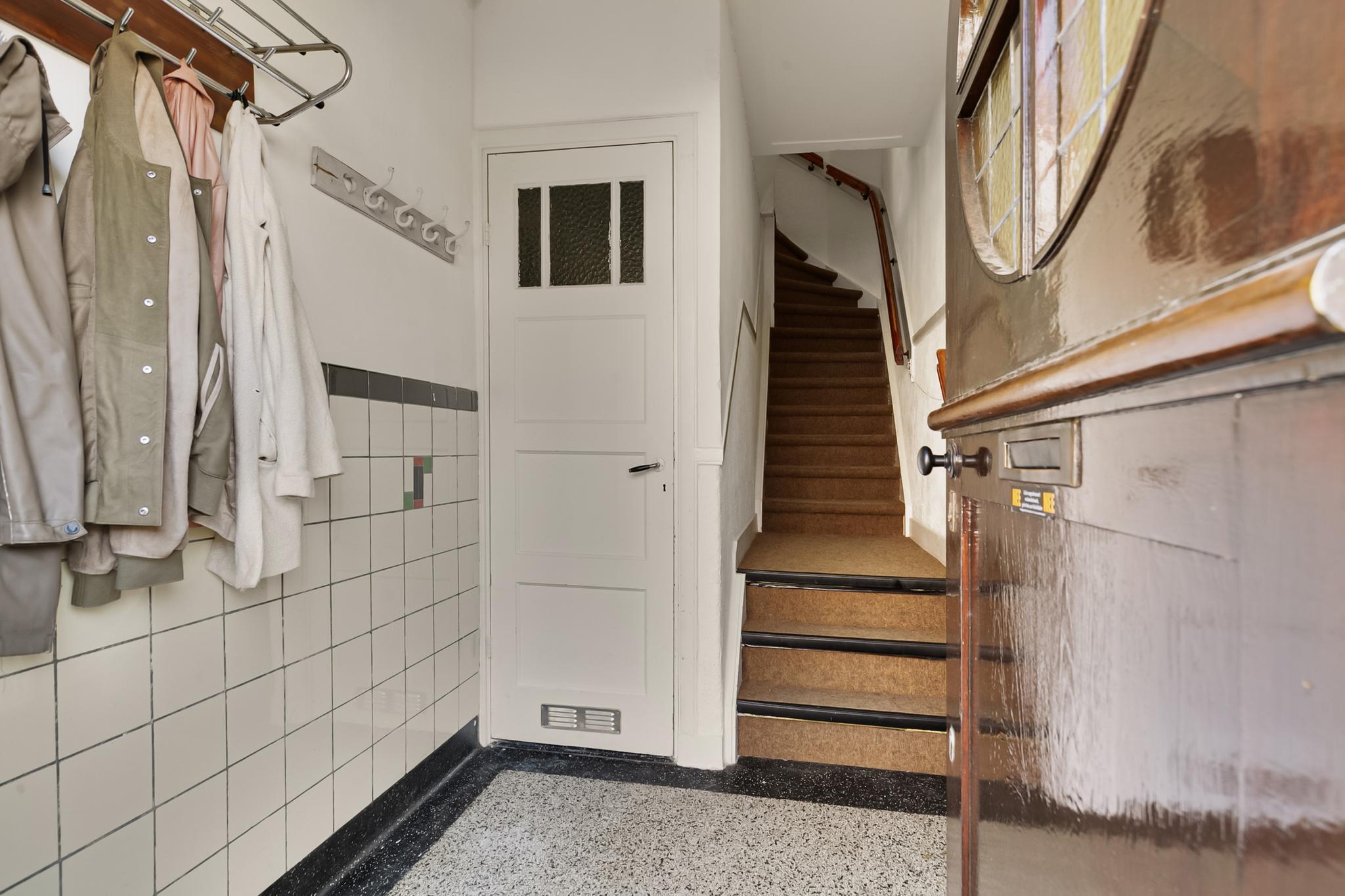 Entree met ruime hal met originele granitovloer en wandtegels, garderobe, meterkast, toegang naar kelderberging en trapopgang naar
