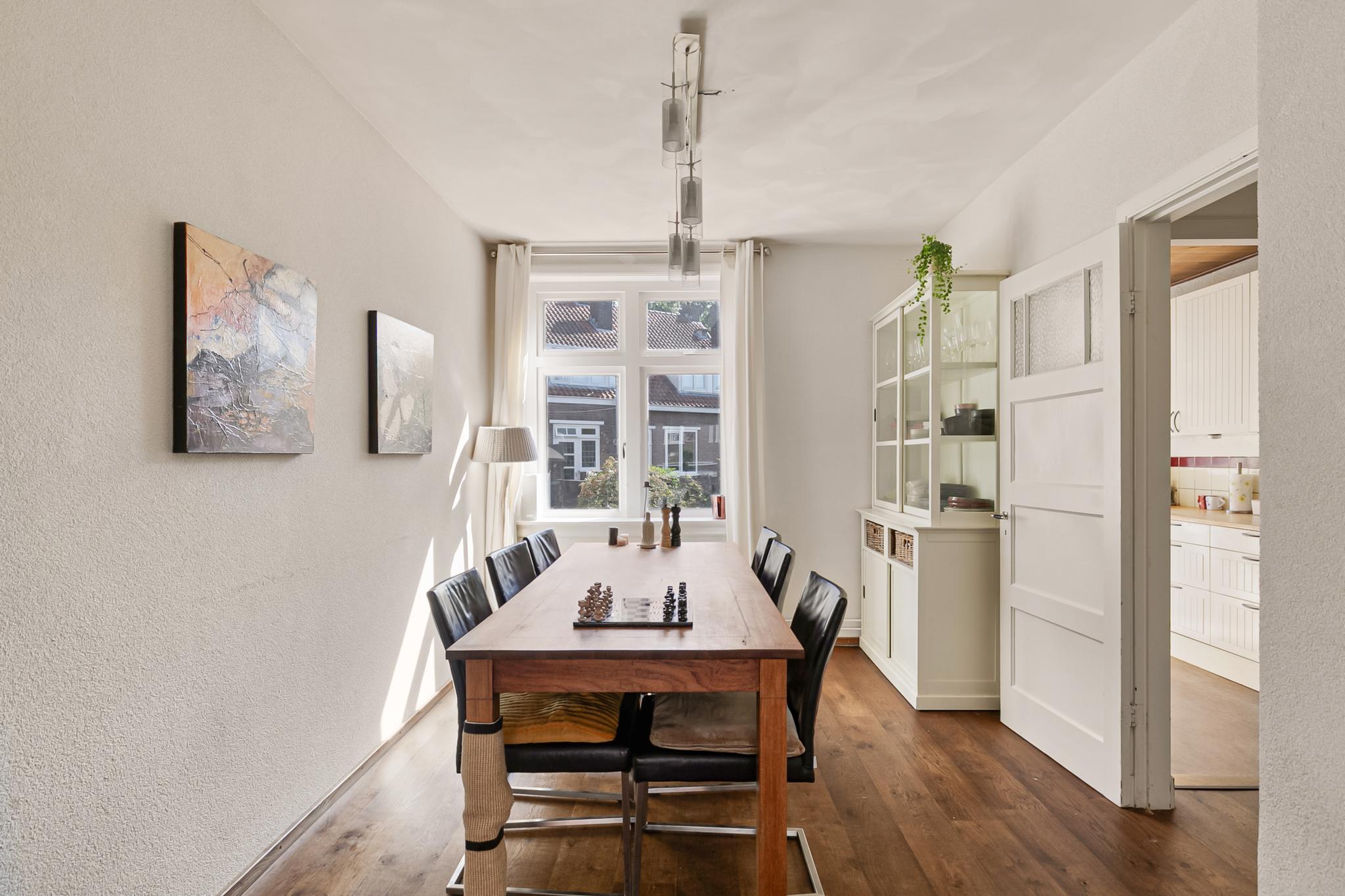 De kamer en suite wordt middels suite deuren en vaste kasten gedeeld in een eetkamer deel en een L-vormige woonkamer. Beide ruimtes hebben een originele schouw (niet in gebruik) en een prachtige houten vloer.