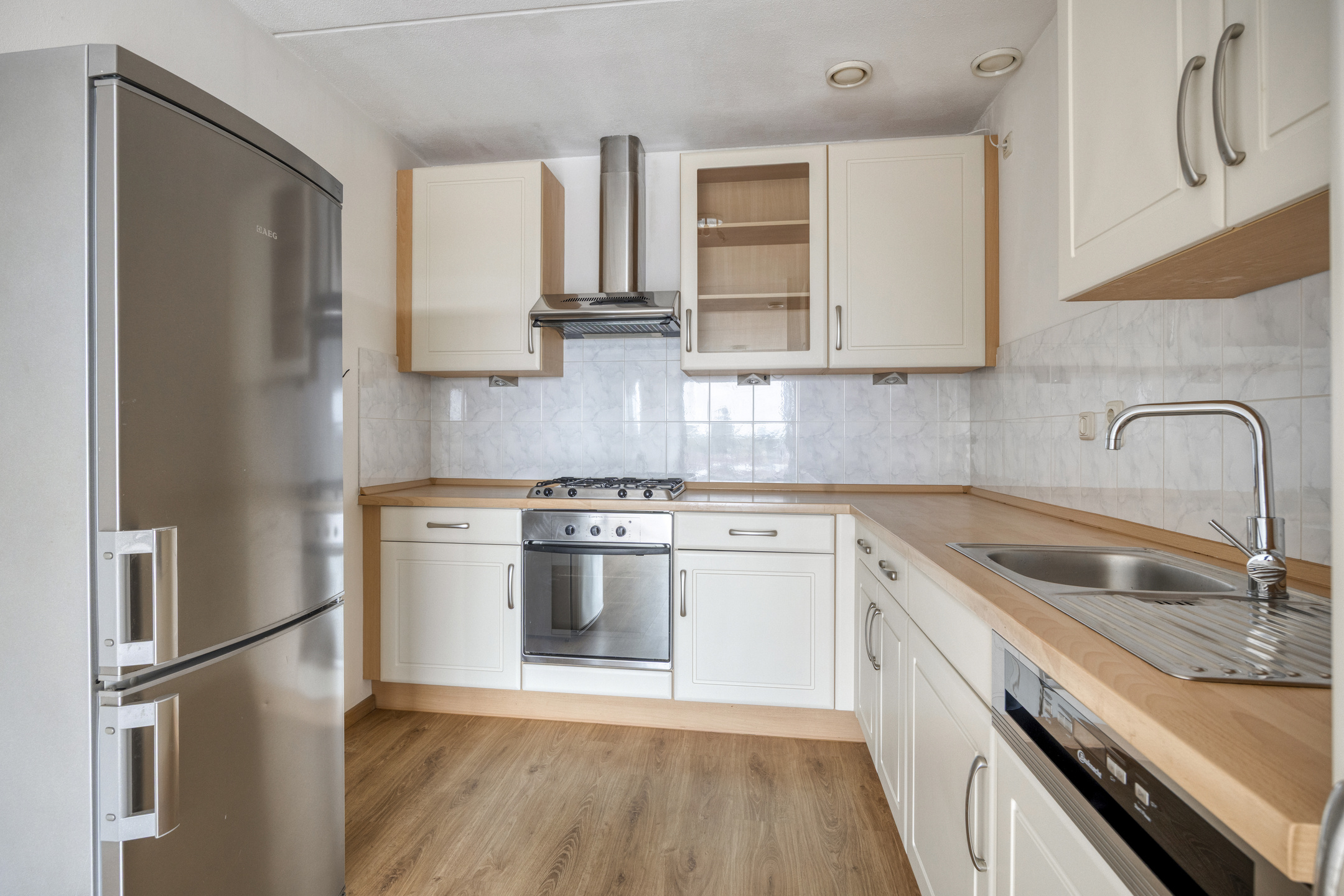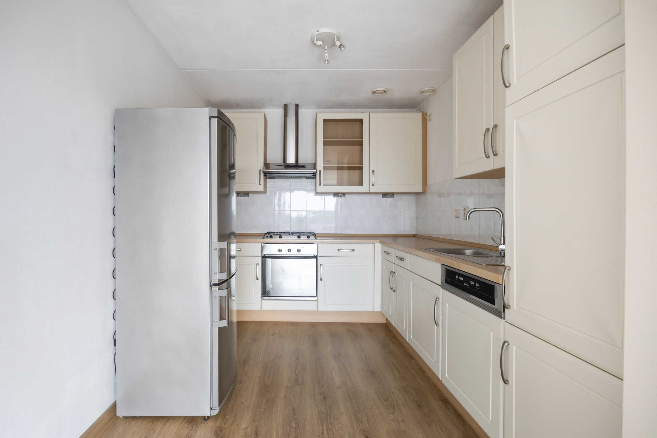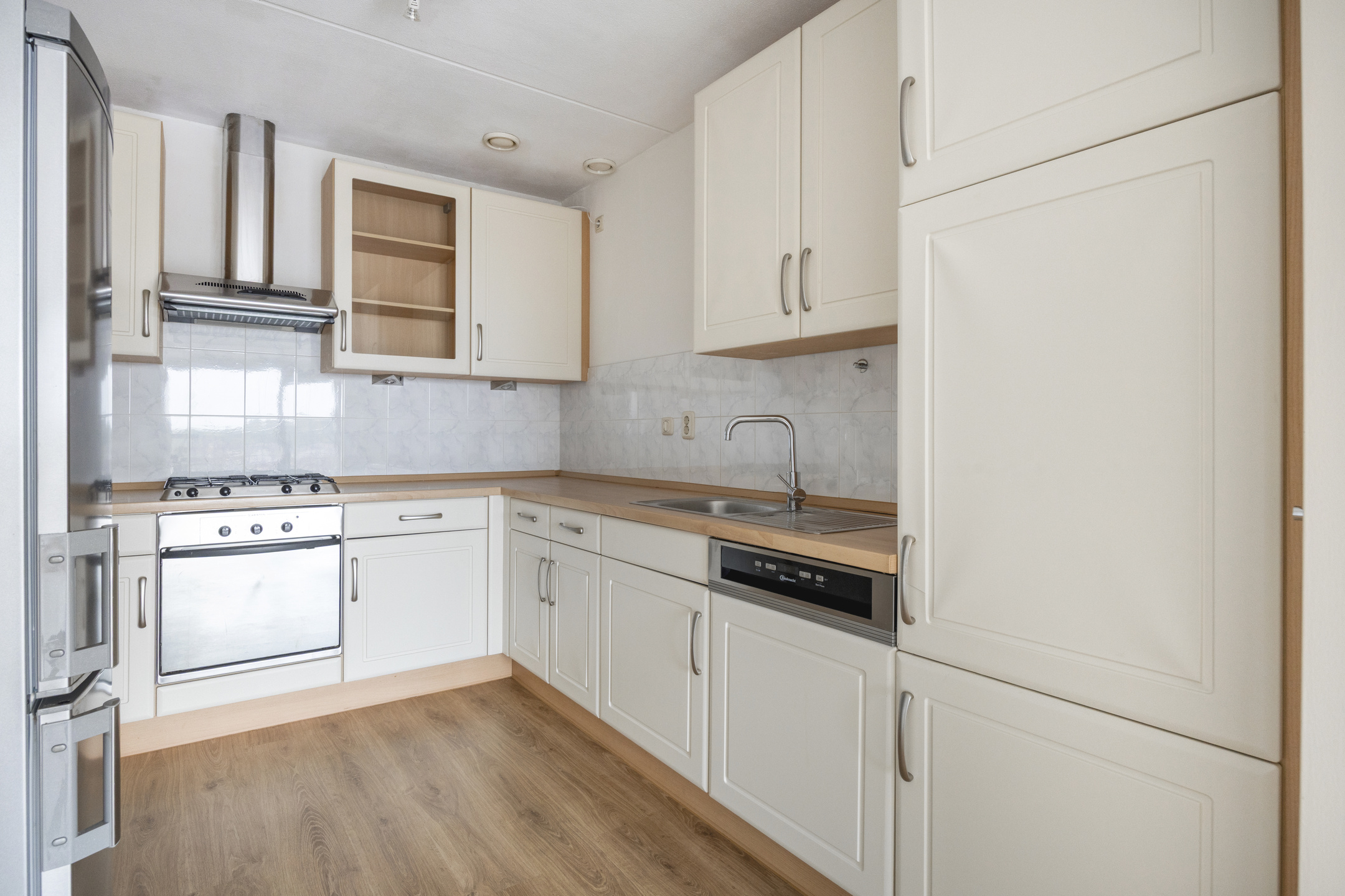 Er is een open keuken met hoekopstelling in lichte kleurstelling en deze is voorzien van diverse inbouwapparatuur zoals oven, afwasmachine en koel-vriescombinatie.