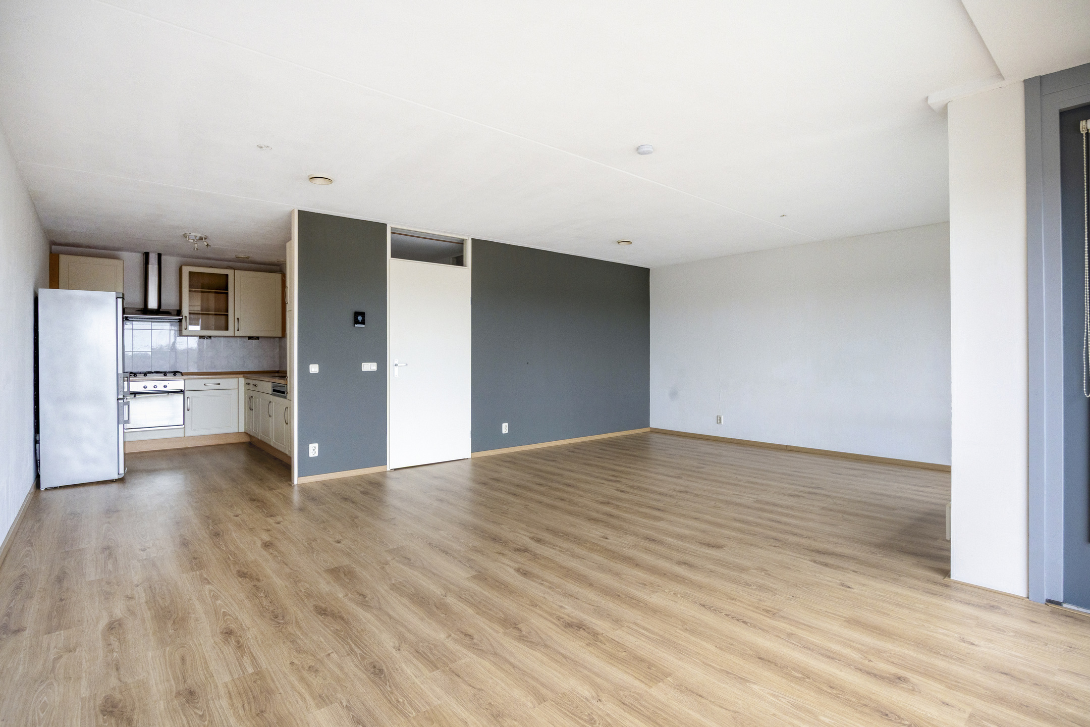 De ruime en lichte woonkamer heeft een nette laminaatvloer, schuifdeuren naar het frans balkon en een ruime en zonnige grote loggia (overdekt balkon).